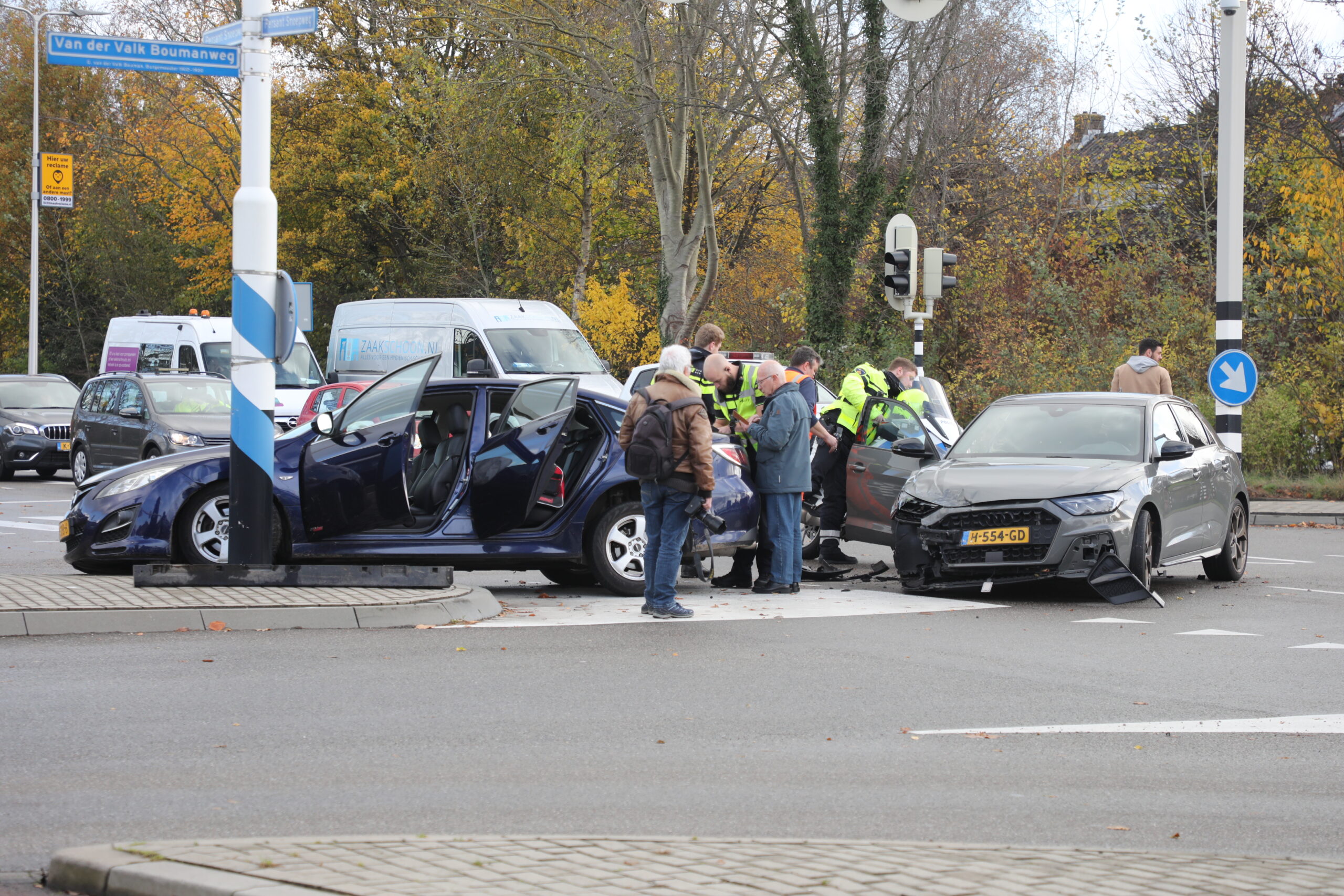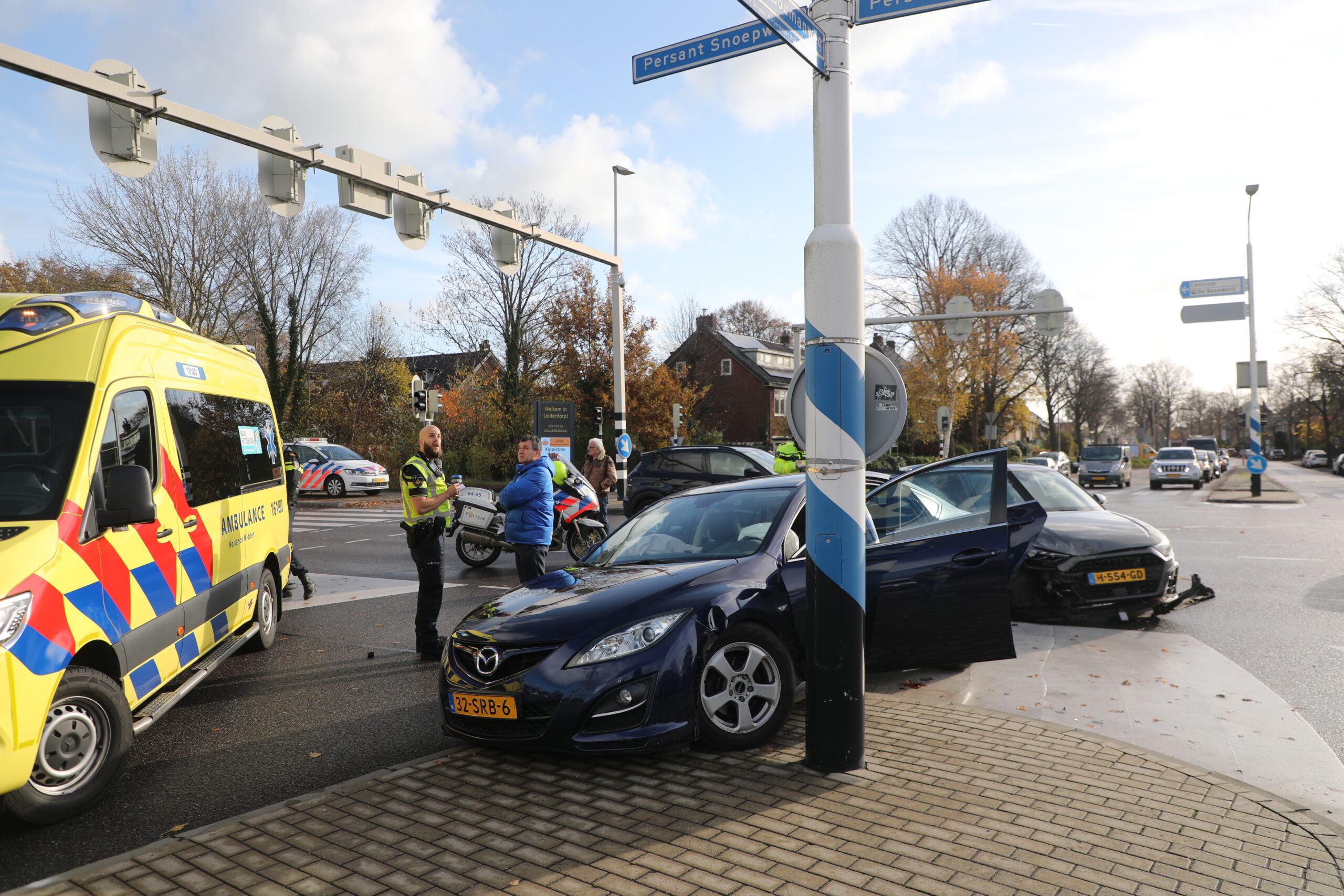 Op de kruising Persant Snoepweg met de Van der Valk Boumanweg in Leiderdorp zijn rond 13.00 uur twee auto’s tegen elkaar gebotst. Ambulancemedewerkers hebben een bestuurder nagekeken op verwondingen. Niemand hoefde naar het ziekenhuis vervoerd te worden.