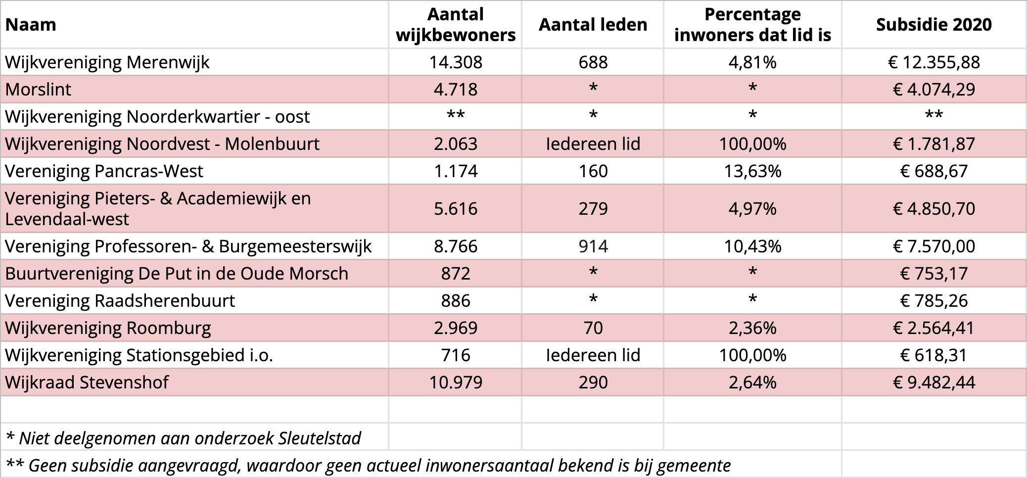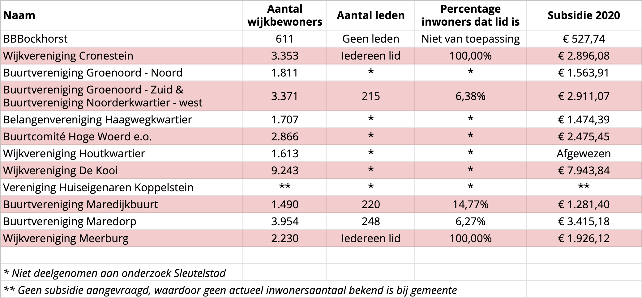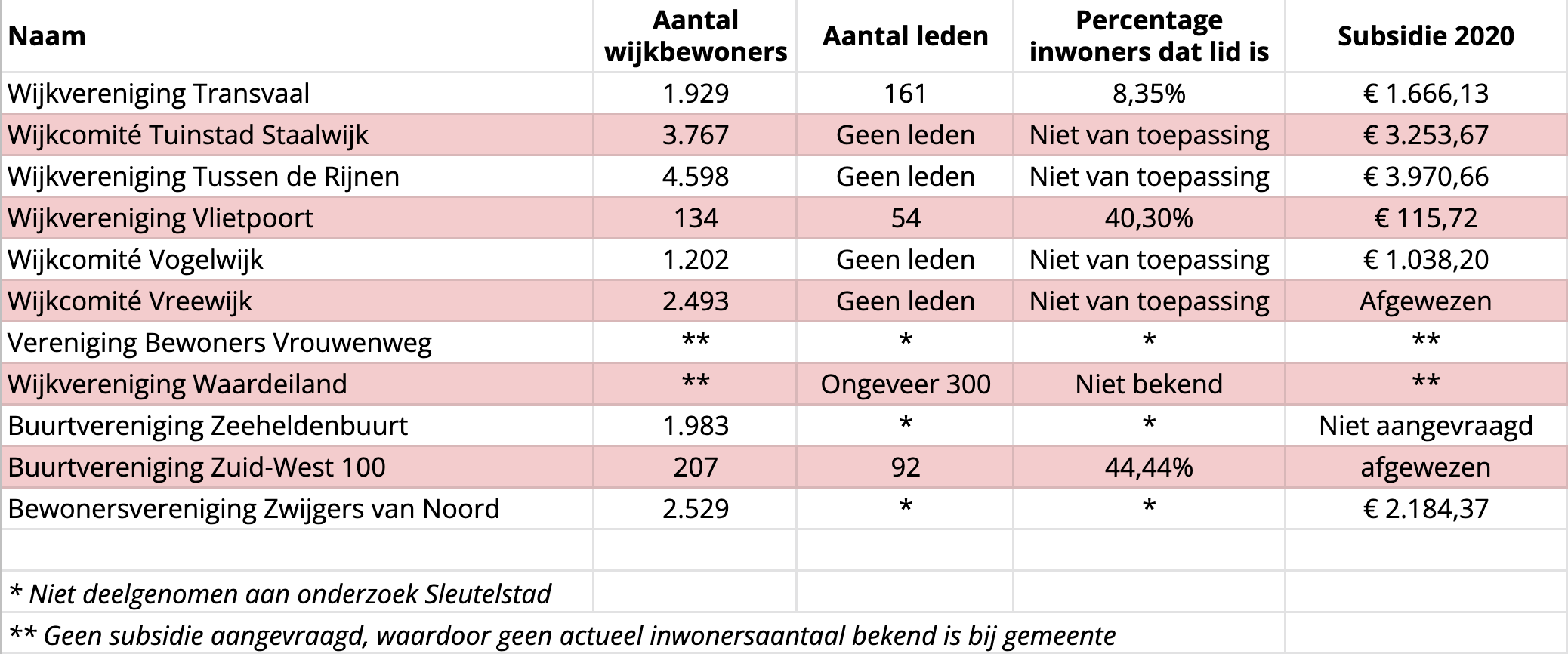 Overzicht per wijkvereniging van het aantal inwoners, leden, percentage inwoners dat lid is en toegewezen subsidie in 2020 (in drie delen, kies onderaan de tabel die u wilt zien)