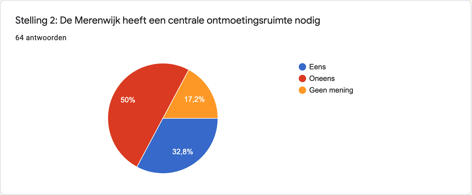 Het enkele standpunt dat het bestuur wel heeft ingenomen kan rekenen op veel steun: een groot deel van de Merenwijkers die wij spraken (88 procent) vindt dat het wijkpark onbebouwd en groen moet blijven. De zoektocht van het bestuur naar een nieuwe ontmoetingsruimte in de wijk vindt wat minder weerslag. De meeste mensen zeggen dat er al een ontmoetingsruimte is of geen behoefte te hebben aan zo’n plek. Het bestuur laat in een reactie weten niet op zoek te zijn naar meer ruimte, maar naar een nieuw kloppend hart van de wijk dat levensloopbestendig is. “Een plek waar je graag even naartoe gaat om elkaar te ontmoeten. De bibliotheek zou deze functie goed kunnen vervullen.”
