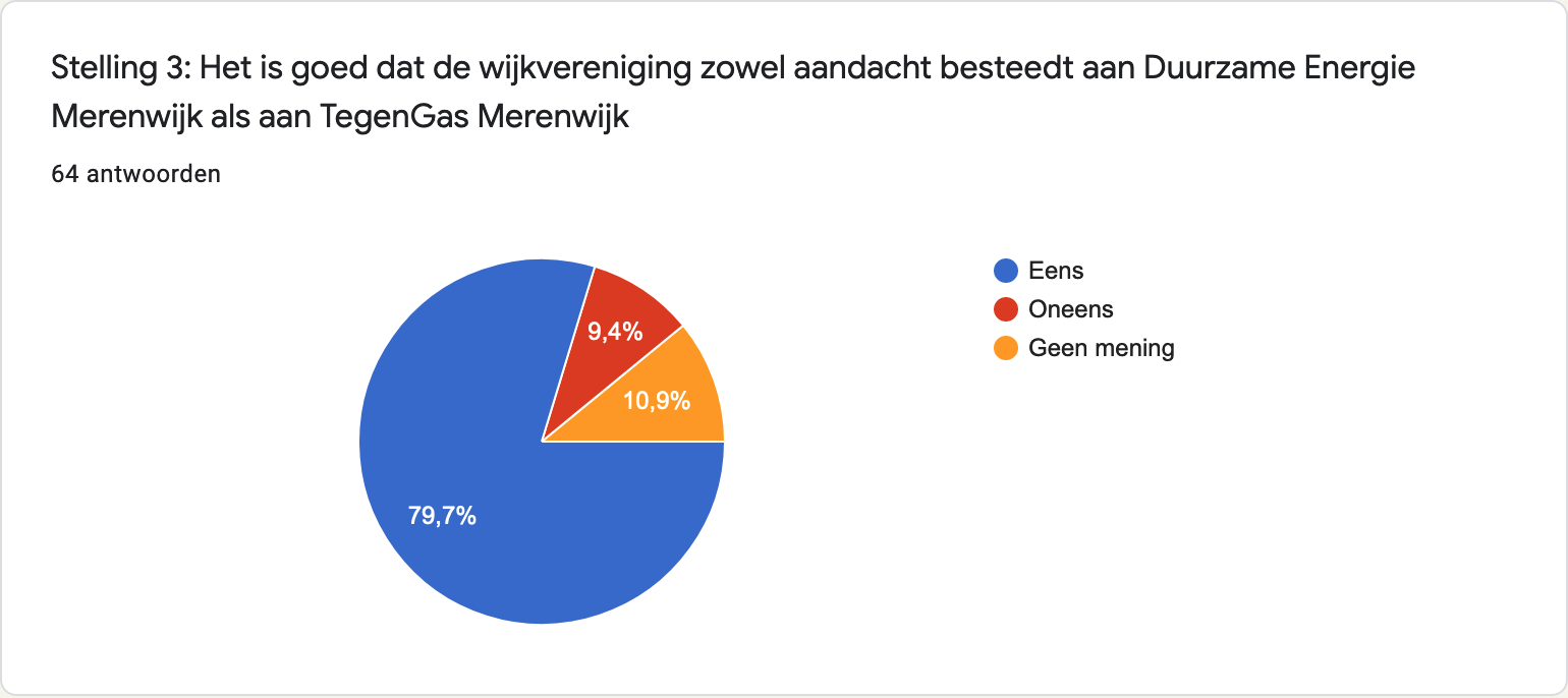Een voorbeeld van hoe de Merenwijk dat aanpakt kwam recent naar voren. In reactie op de groep bewoners die samen Duurzame Energie Merenwijk vormt, richtten andere bewoners Tegengas Merenwijk op. Beide initiatieven staan op de website gebroederlijk naast elkaar. De 64 mensen die we verdeeld over de wijk spraken, zijn over het algemeen positief over die keuze. “Ik heb er zelf wel een mening over, maar de wijkvereniging moet neutraal zijn”, zegt iemand aan de Donsvlinder. En op de Arendshorst: “Goed dat het er beiden is, anders hoor je alleen maar de voorstanders.”