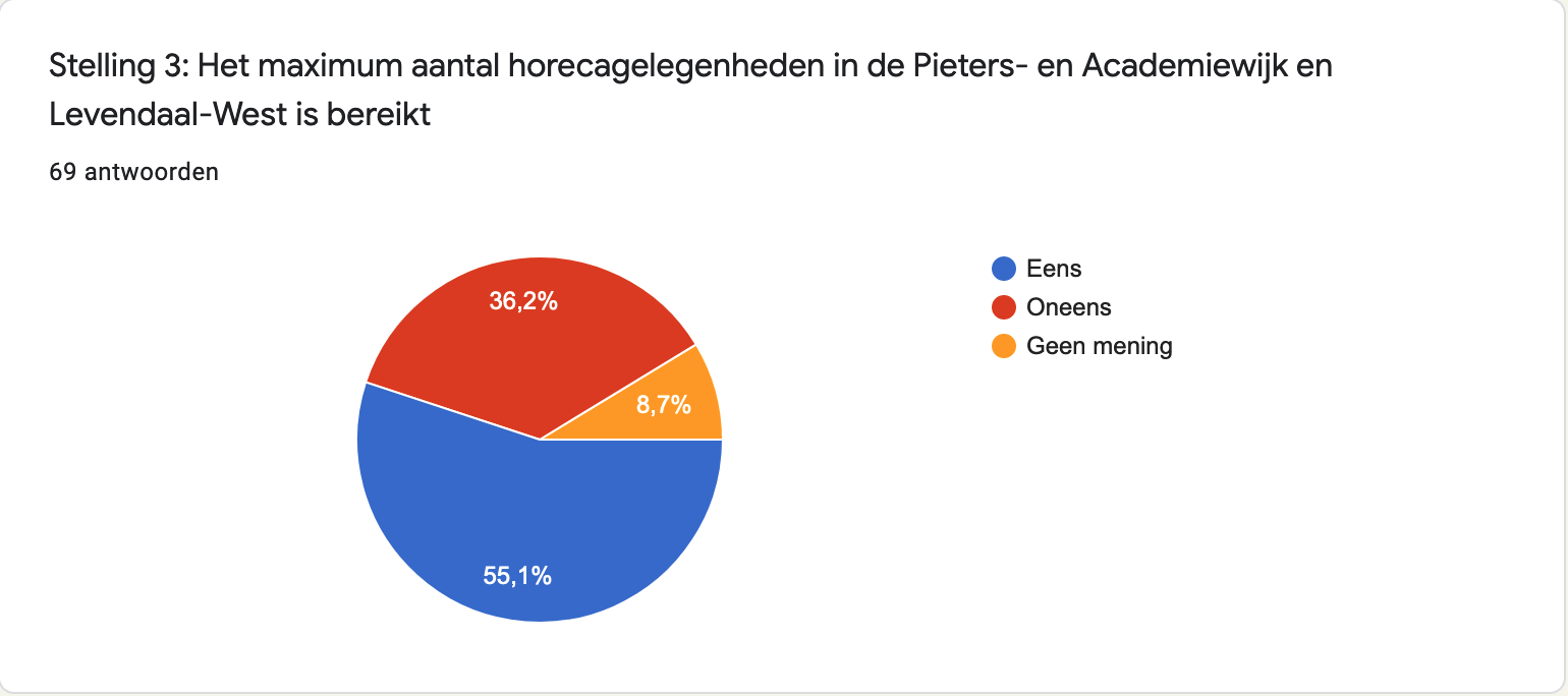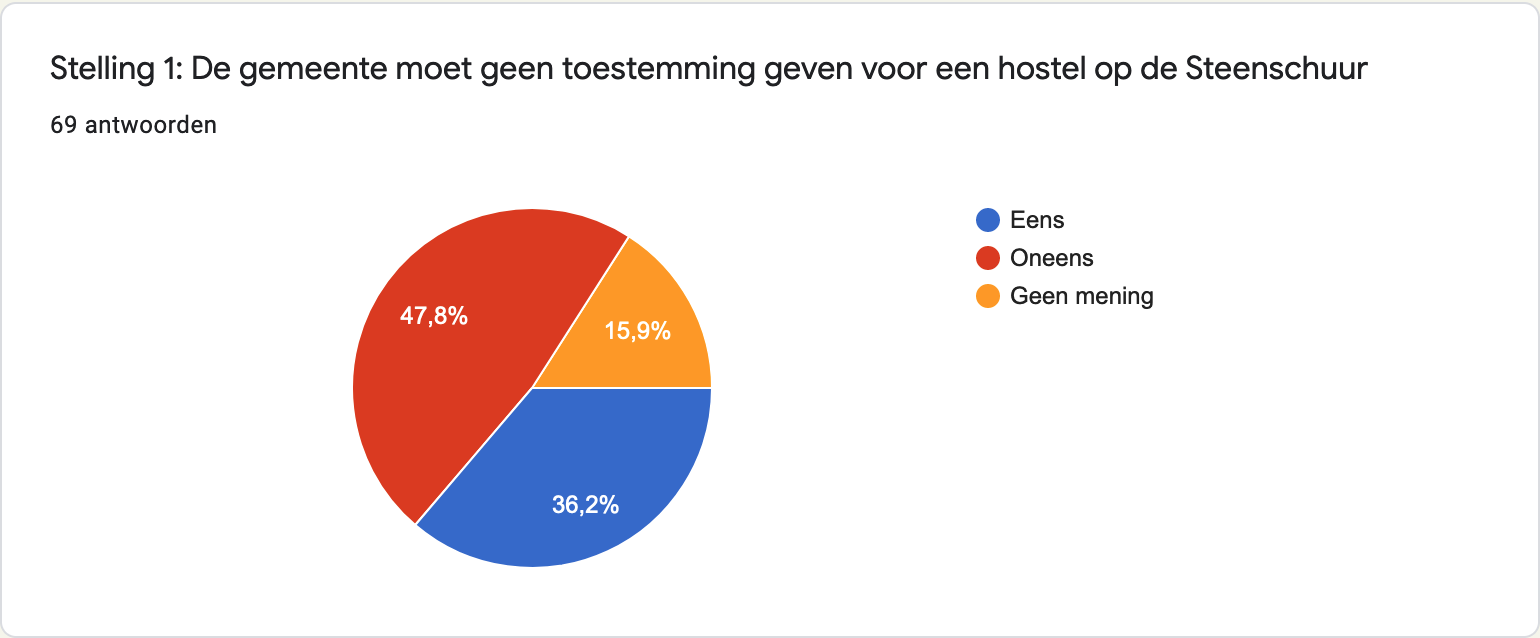 Daar specifiek naar gevraagd, blijkt veruit de grootste groep toch wel een mening te hebben over de toekomst van de wijk. Op de vraag of er bijvoorbeeld meer horeca mag komen in de wijk, en of een hostel op de Steenschuur gewenst is, heeft iedereen wel een antwoord. Na 69 gesprekken lopen de meningen uiteen: 36 procent van de mensen vindt dat er nog best wat horeca bij mag in de wijk, 55 procent vindt dat de grens wel is bereikt. Als het om een hostel gaat, voornamelijk gericht op jonge toeristen, vindt bijna de helft van de mensen dat je daar niet bij voorbaat tegen moet zijn. “Het gaat er vooral om hoe het geregeld wordt.”