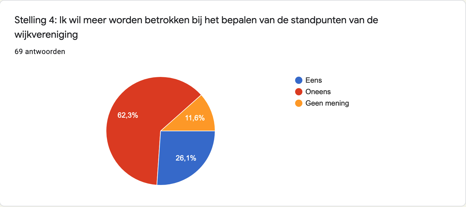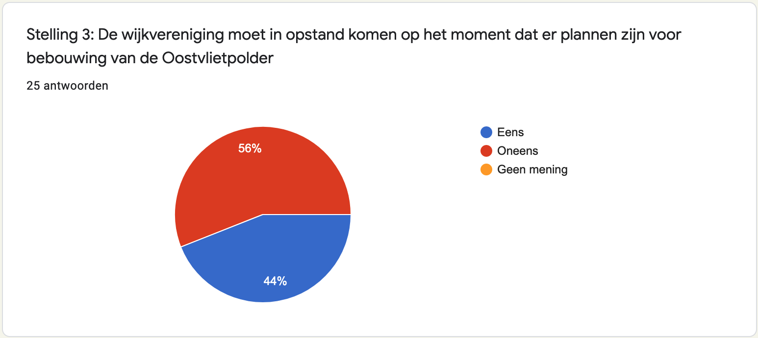 Dat moet ook zo blijven, blijkt uit de antwoorden op de vraag of de wijkvereniging in opstand moet komen als bebouwing van de naastgelegen Oostvlietpolder dreigt. “Laat me eerst de plannen maar eens kritisch bekijken”, zegt een van de 14 mensen die het oneens is met die stelling. Een ander, die juist vindt dat de wijkvereniging wel meteen in actie moet komen, vindt dat omdat de polder groen moet blijven. “Je staat sterker als je dat als vereniging uitdraagt.”
