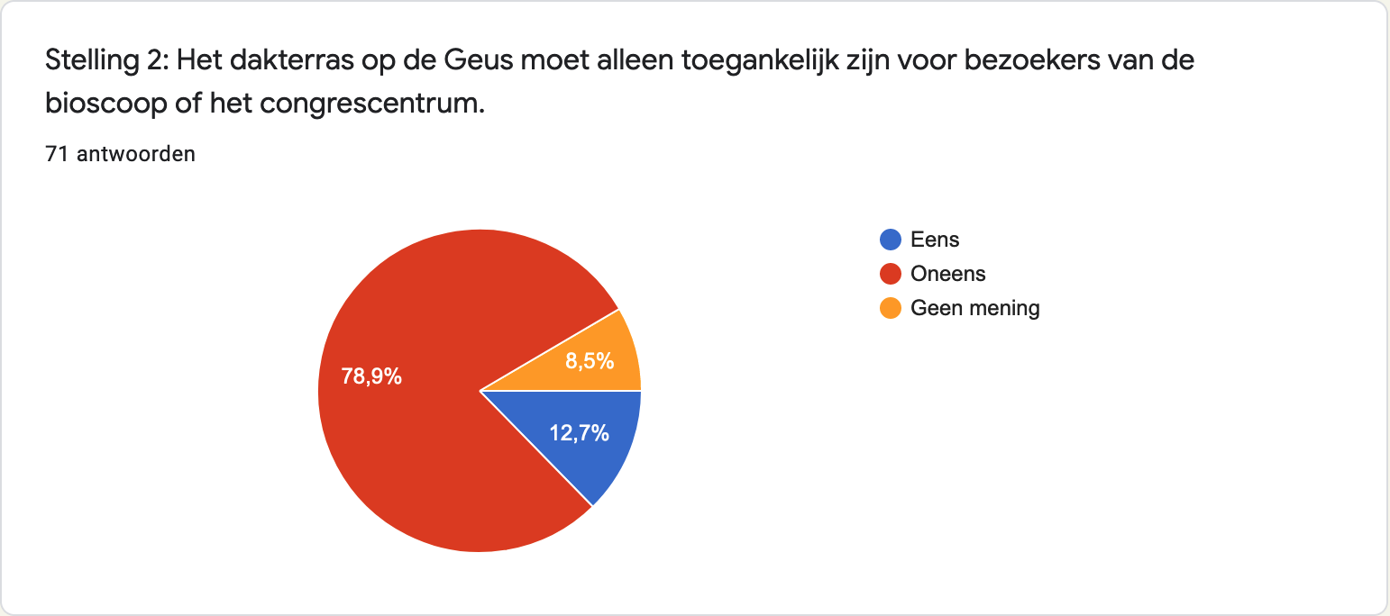 De afgelopen tijd is de wijkvereniging heel druk geweest met de toekomstvisie voor het Stationsgebied. Het gaat daarbij over de verre toekomst in 2040, maar ook over het voorgenomen ontwerp van congres- en bioscoopcomplex De Geus waarvan de bouw binnenkort begint. In een reactie daarop stelde de vereniging dat het dakterras op dat complex alleen toegankelijk moet worden voor bezoekers van de bioscoop. Een openbaar toegankelijk dakterras zal teveel geluidsoverlast opleveren. Aan de deur zegt 79 procent van de mensen een publiek toegankelijk dakterras echter wel te zien zitten. “Als het geluid maar goed wordt afgeschermd en het op tijd dicht gaat”, licht een bewoner van de Morssingel haar mening toe.