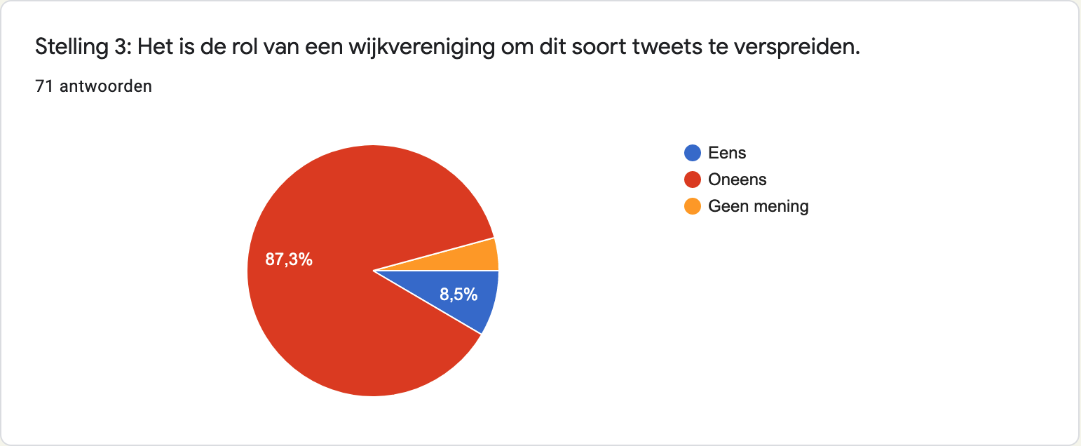 Als een wijkvereniging een sterke mening heeft, klinkt het, dan moet duidelijk zijn waarop die gebaseerd is. Dat is voor veel mensen die we spreken niet duidelijk, zeker niet als het gaat om de tweets die door deze wijkvereniging worden verstuurd. Naast dat de werkzaamheden in het gebied op de voet worden gevolgd, geldt dat ook voor de landelijke politiek. Zo stond Sigrid Kaag in aanloop naar de Tweede Kamerverkiezingen ‘terecht op verlies’ volgens de vereniging en was Lilian Marijnissen ‘het afgelopen half jaar in positieve zin gegroeid’.