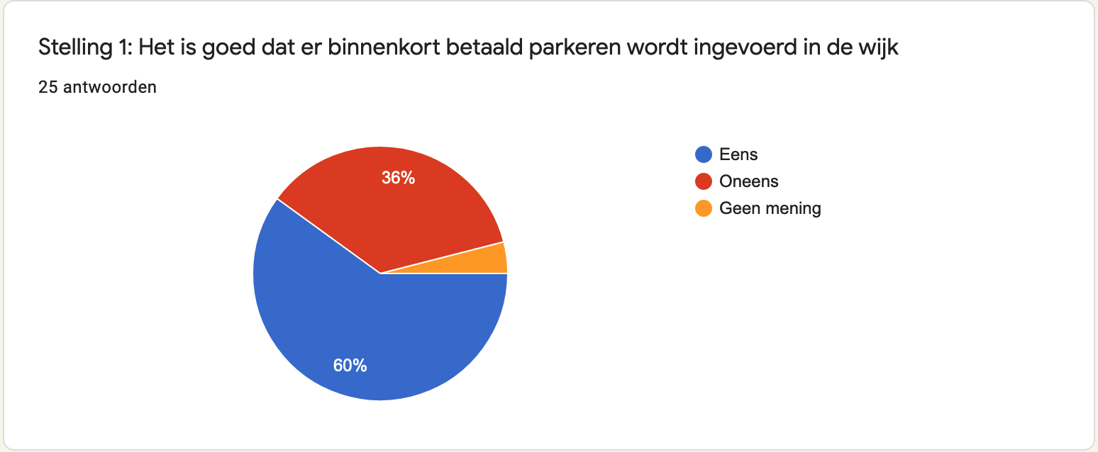 Die verdeeldheid is nog steeds zichtbaar. Van de 25 mensen in de wijk die we spraken, zeggen 9 er nog steeds tegen het inmiddels aangekondigde betaald parkeren te zijn, 15 anderen kunnen zich er wel in vinden of zijn blij. Het wordt in ieder geval gewaardeerd dat de ALV besluiten neemt over de standpunten van de vereniging.