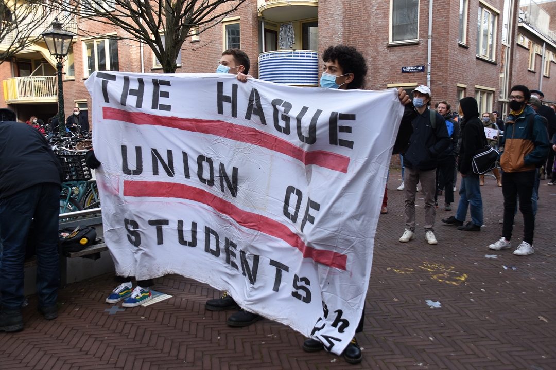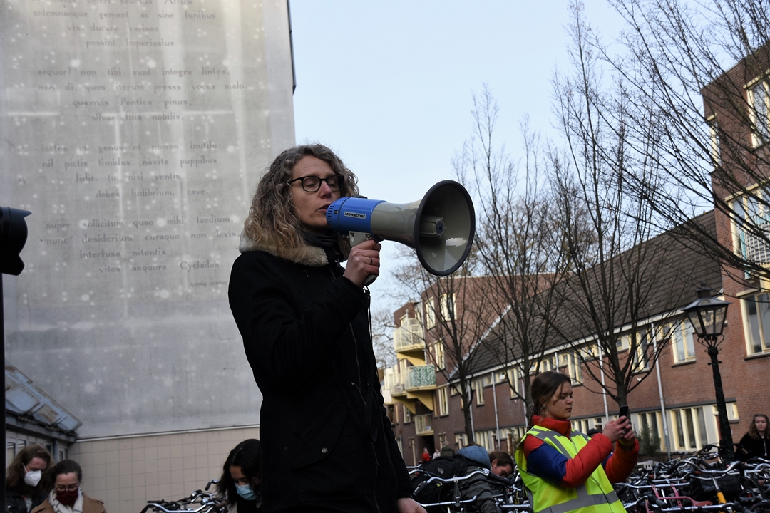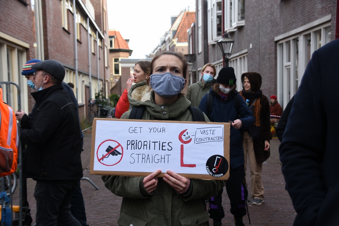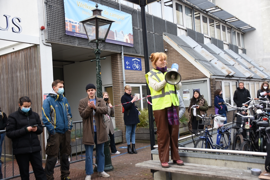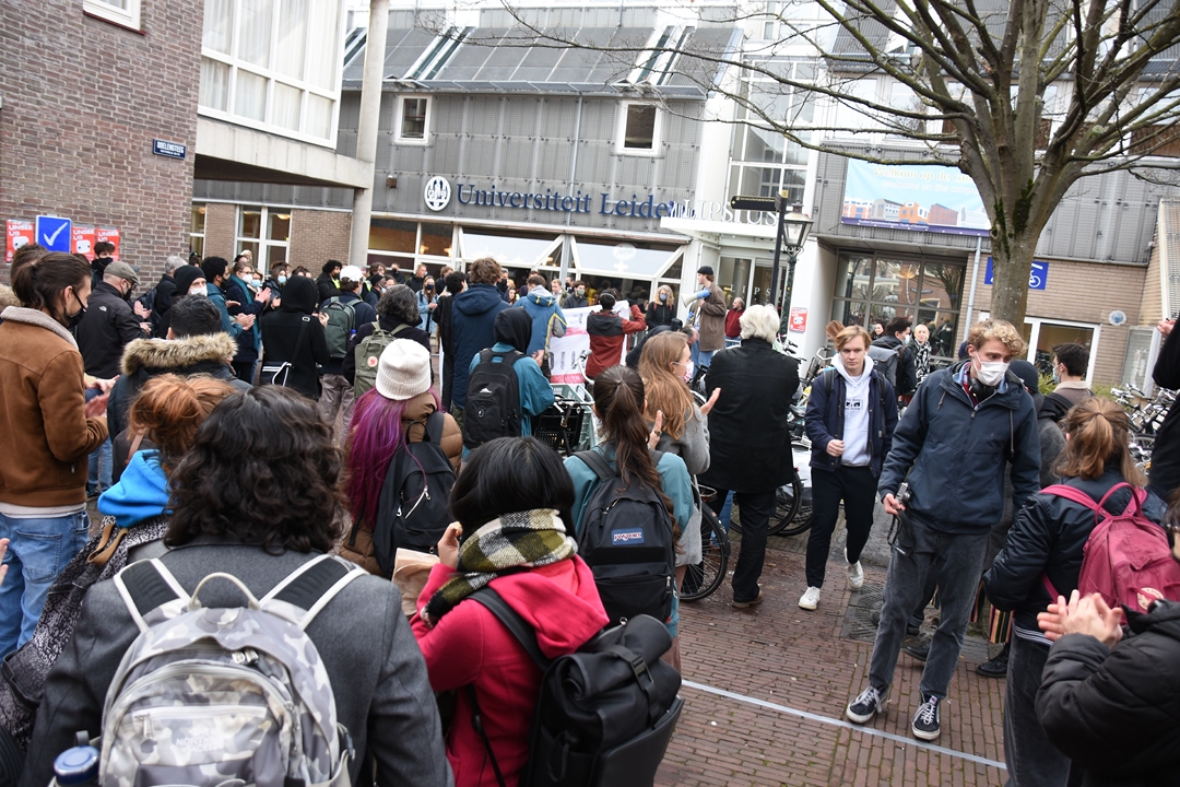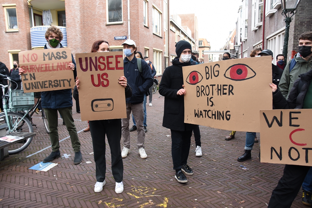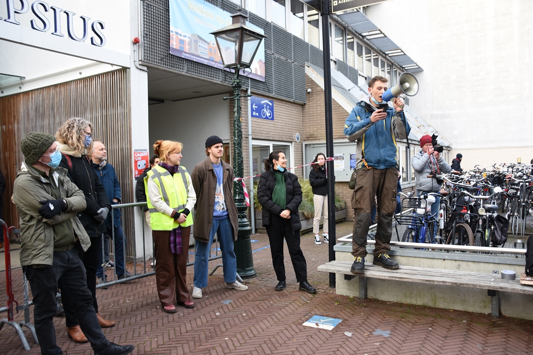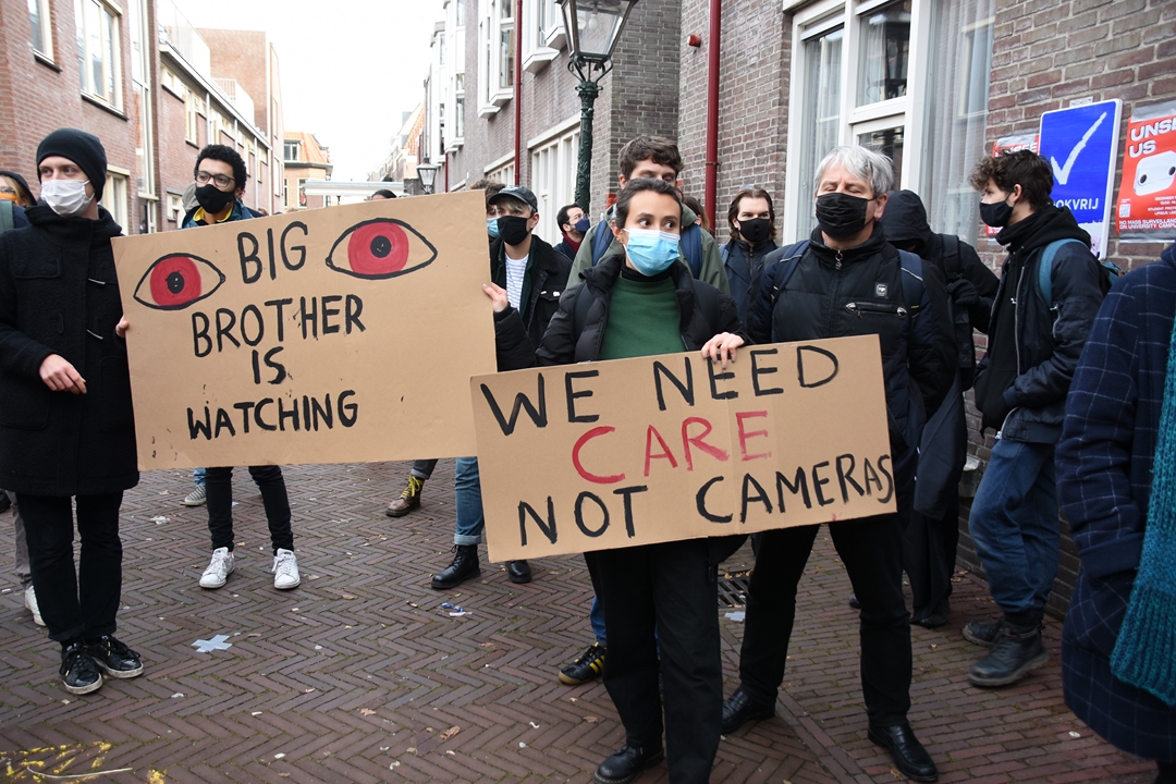Studenten van Universiteit Leiden blokkeren dinsdagmiddag de ingang van het Lipsiusgebouw aan de Cleveringaplaats. Ze zijn tegen de nieuwe camera’s die sinds vorig jaar op de universiteit hangen. Deze waren bedoeld om bezoekers te tellen, maar kunnen veel meer. “Zoals je lengte meten, je leeftijd inschatten, geslacht zien en of je een mondkapje draagt”, vertelt initiatiefnemer Joris Wiebes.