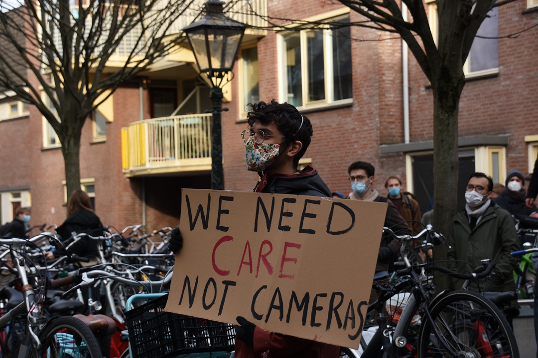 Daarom heeft de student de protestactie opgezet, die duurt tot 14.00 uur. Hij hoopt dat alle 371 camera’s weg worden gehaald, maar dat is volgens Wiebes niet het doel. “Het doel is het gesprek aangaan en inspraak hebben in deze zaak.”