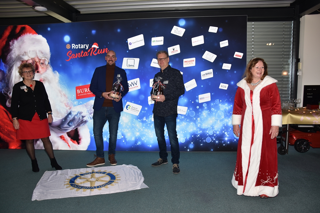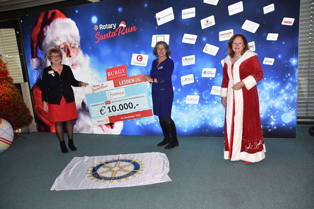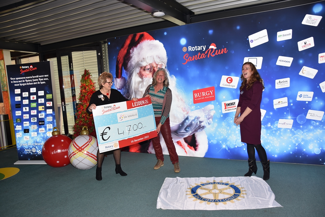 “De goede doelen zijn eigenlijk de grote verliezers van het niet doorgaan van de Santa Run”, vertelt Joke Larrewijn die de cheques mocht uitreiken. De Nierstichting, Stichting Puzzelstuk en vrouwenopvang Rosa Manus kregen elk een flink bedrag van de Rotary Leiden uitgereikt.