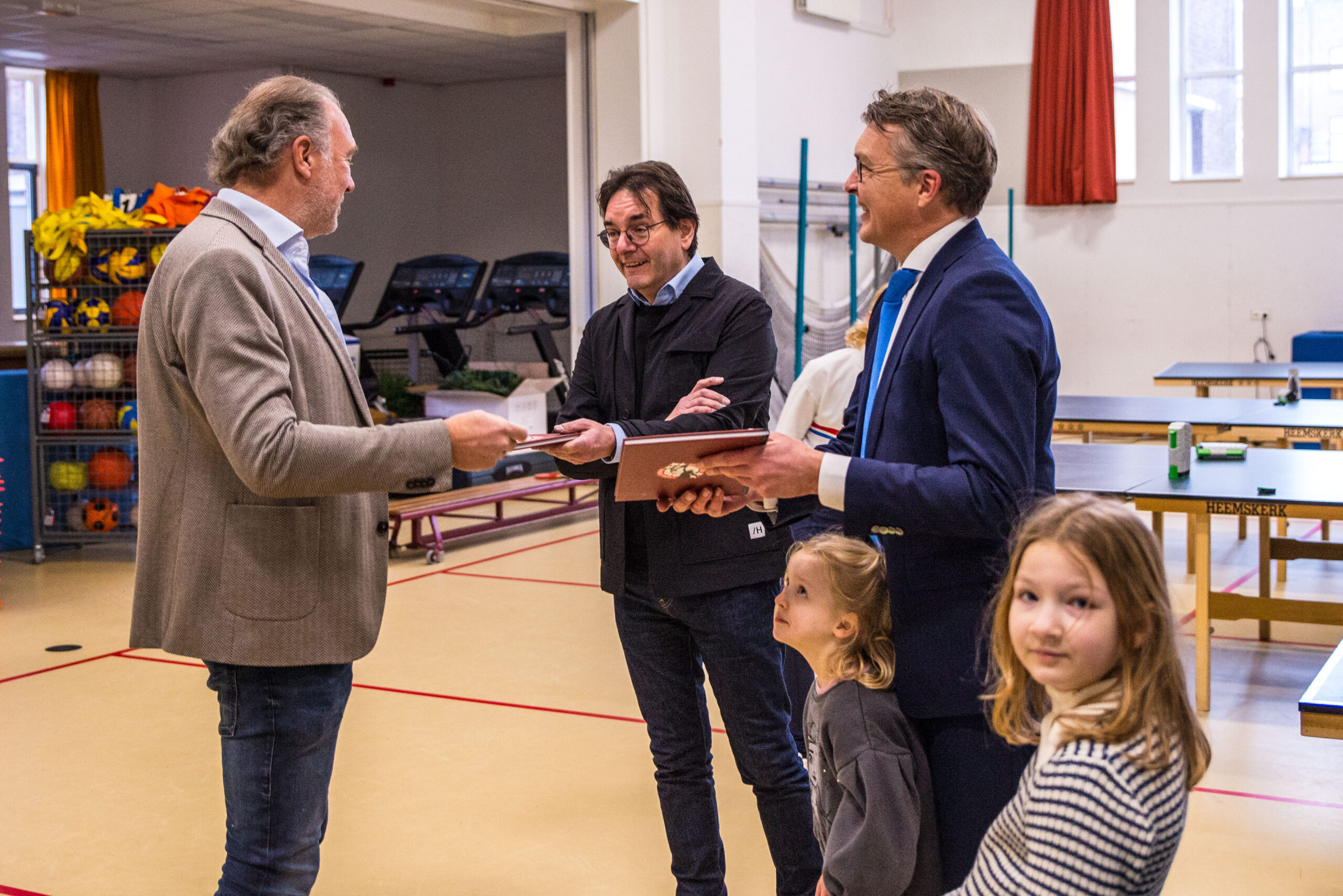 Verslaggever Casper Chaudron bij het bonaventuracollege in gesprek met Marcel Verburg, Henk Gerla en Harry van Alphen