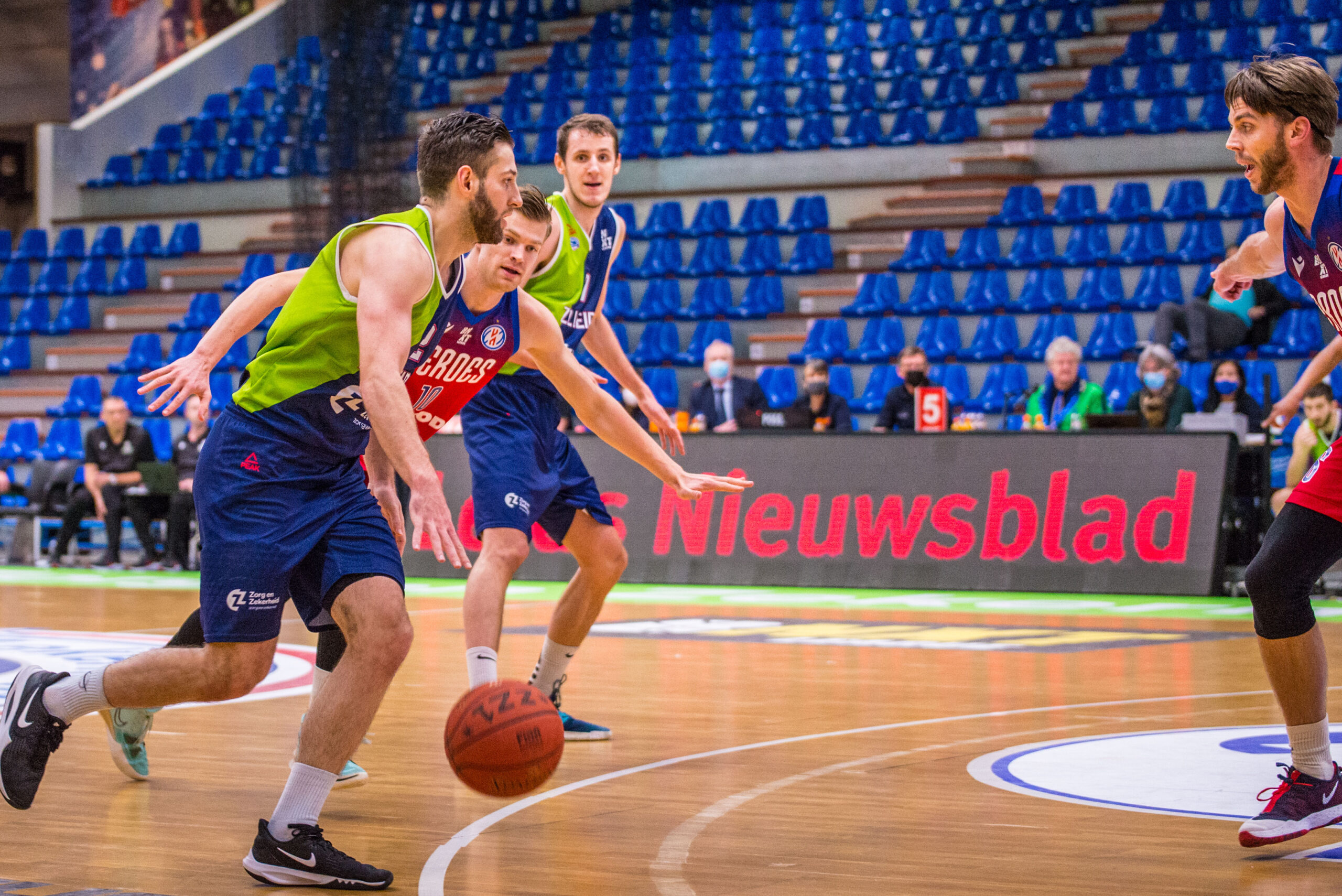 Heroes Den Bosch moest het stellen zonder Thomas van der Mars en Morgan Stilma, die allebei in het coronaprotocol zaten. Daarmee was de rotatie van Zorg en Zekerheid Leiden één man groter dan die van Heroes Den Bosch. Dat werd nog groter toen Shane Hammink na zeven minuten met twee technische fouten kon gaan douchen. Mede dankzij 11 punten van Einaras Tubutis stond de Leidse ploeg op dat moment met 19-15 voor. Maarten Bouwknecht benutte de vrije worp en uit het balbezit scoorde Luuk van Bree voor 22-15. Een dunk van Tubutis zorgde opnieuw oor een marge van zeven punten (24-17), maar een drietje van Austin Price bepaalde de stand na 10 minuten op 24-20.