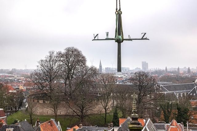 De windvaan van de stadhuistoren is teruggeplaatst op zijn plek. Het vier meter hoge werk boven op de torenspits is tijdens de verbouwing van het stadhuis gerestaureerd door de firma Jobse BV uit Middelburg. De windvaan kan nu weer rond gaan draaien om de windrichting aan te geven. Voorheen zat het helemaal vastgeroest.