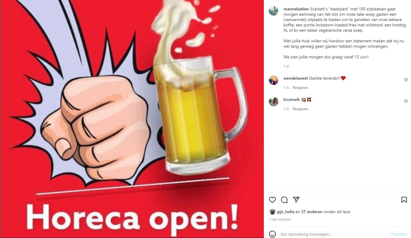 De gemeentelijke opsporingsambtenaren gingen wel de straat op maar hielden het bij waarschuwingen, zo laat voorzitter Reanne Bakker van de Leidse afdeling van Koninklijke Horeca Nederland weten. Zelf opende ze bij haar restaurant Scarlatti uit protest het terras. “Scarlatti’s ‘stadspark’ met 100 zitplaatsen gaat morgen eenmalig van het slot om onze take-away gasten een (verwarmde) zitplaats te bieden om te genieten van onze lekkere koffie, een portie lockdown-loaded fries met wildstoof, een hotdog XL of bv een beker vegetarische verse soep”, zo zette ze vrijdagavond op Facebook en Instagram.