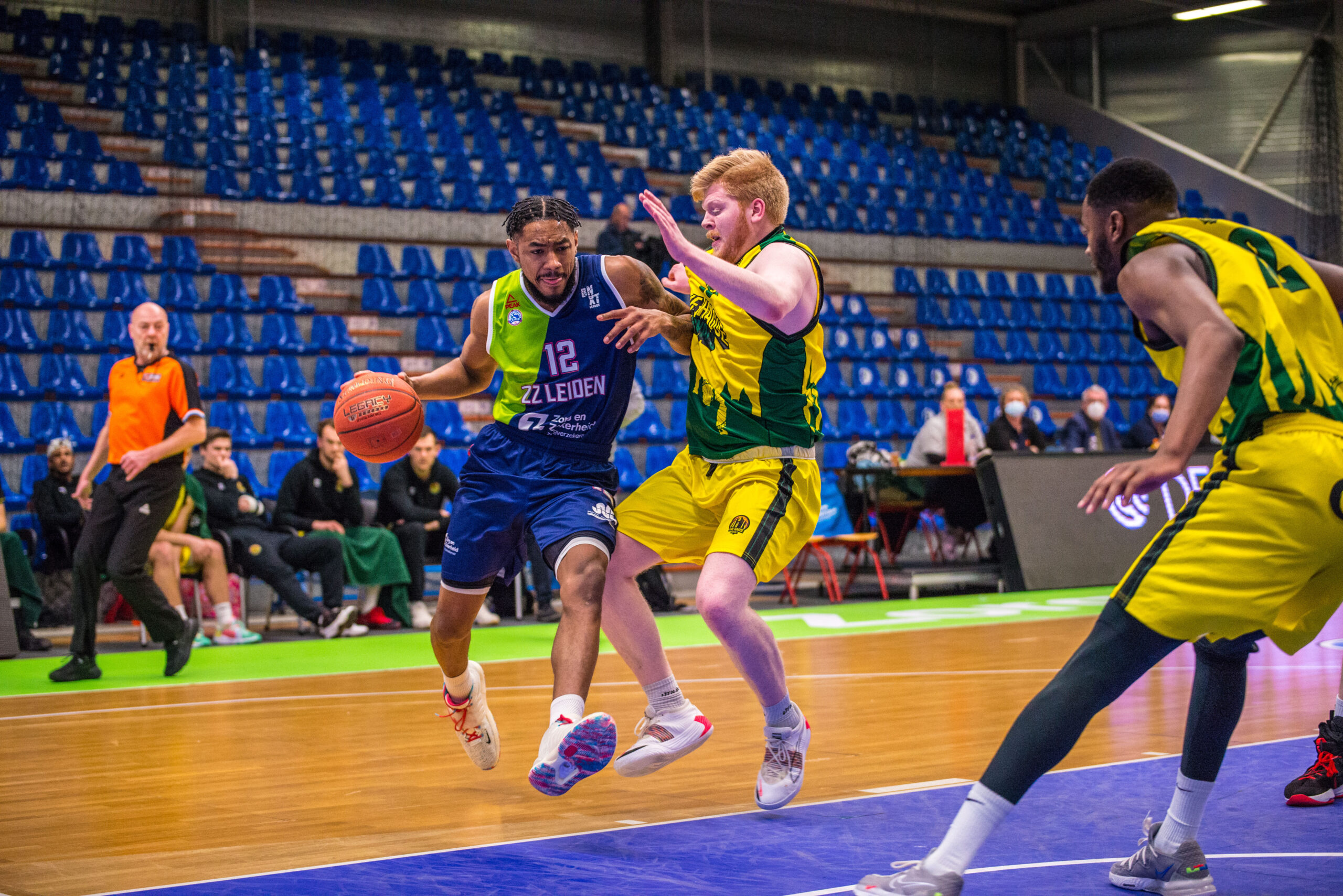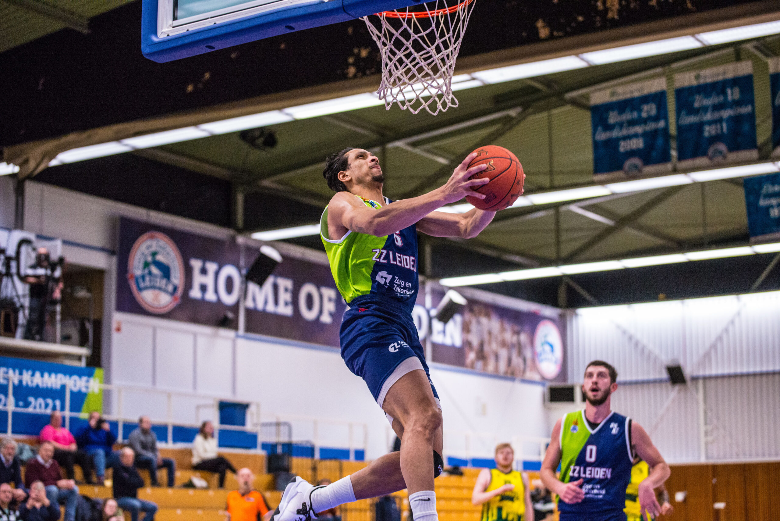 In het tweede kwart lukte het Leiden niet om een groot gat te slaan. Mede door twee scores van Jamayro de Windt, die bij afwezigheid van Maarten Bouwknecht veel speeltijd kreeg, kwam de Leidse ploeg op 28-21. Maar met nog drie minuten te gaan was het al weer 30-30. Via vrije worpen van Tubutis, opnieuw een dunk van De Jong na een steal en een score uit een aanvallende rebound van Jhonathan Dunn werd het 36-31. Oud-Leidenaar Marnexson Knepa en Tom Ackermans zorgden voor een 36-34 ruststand.