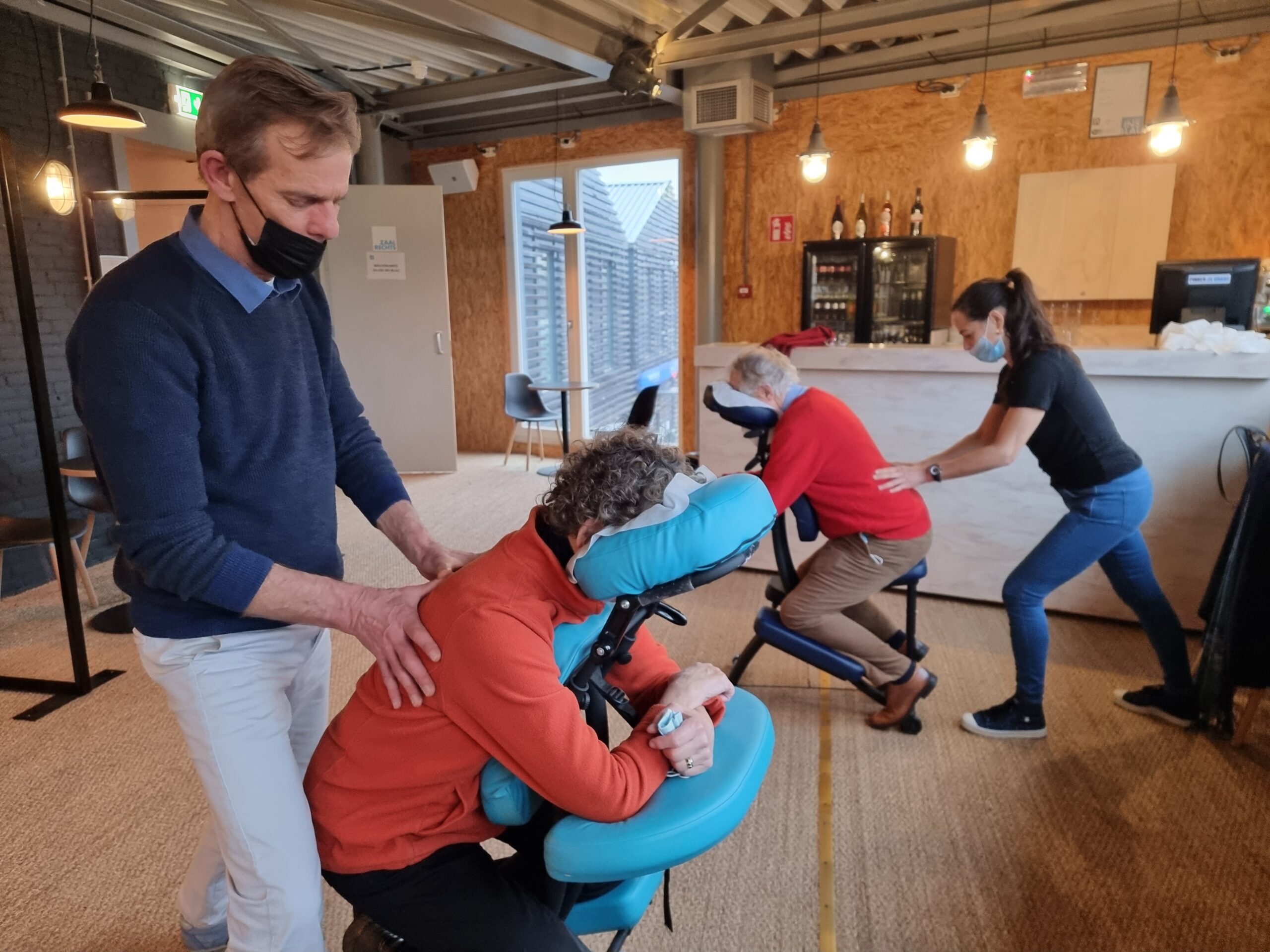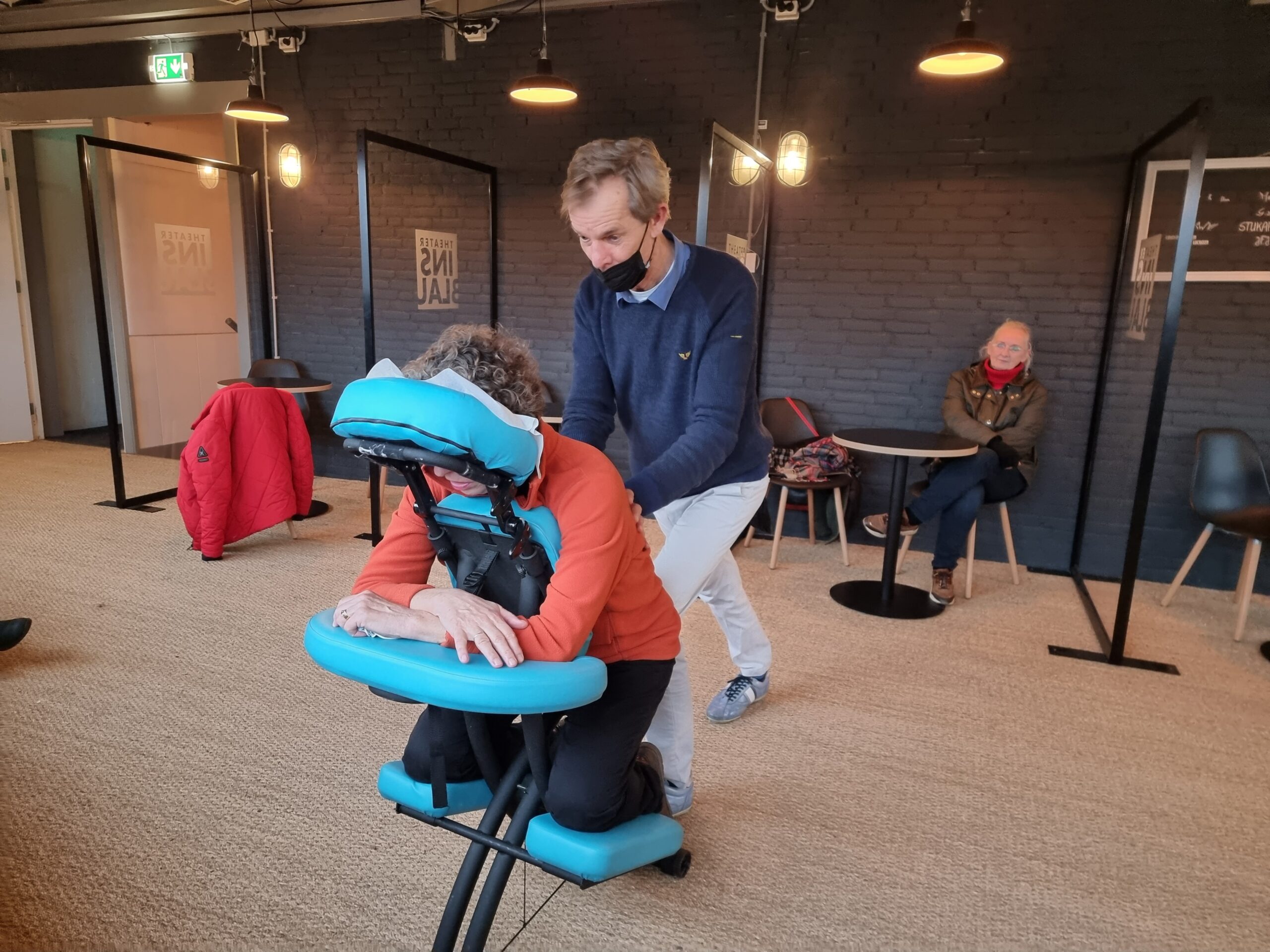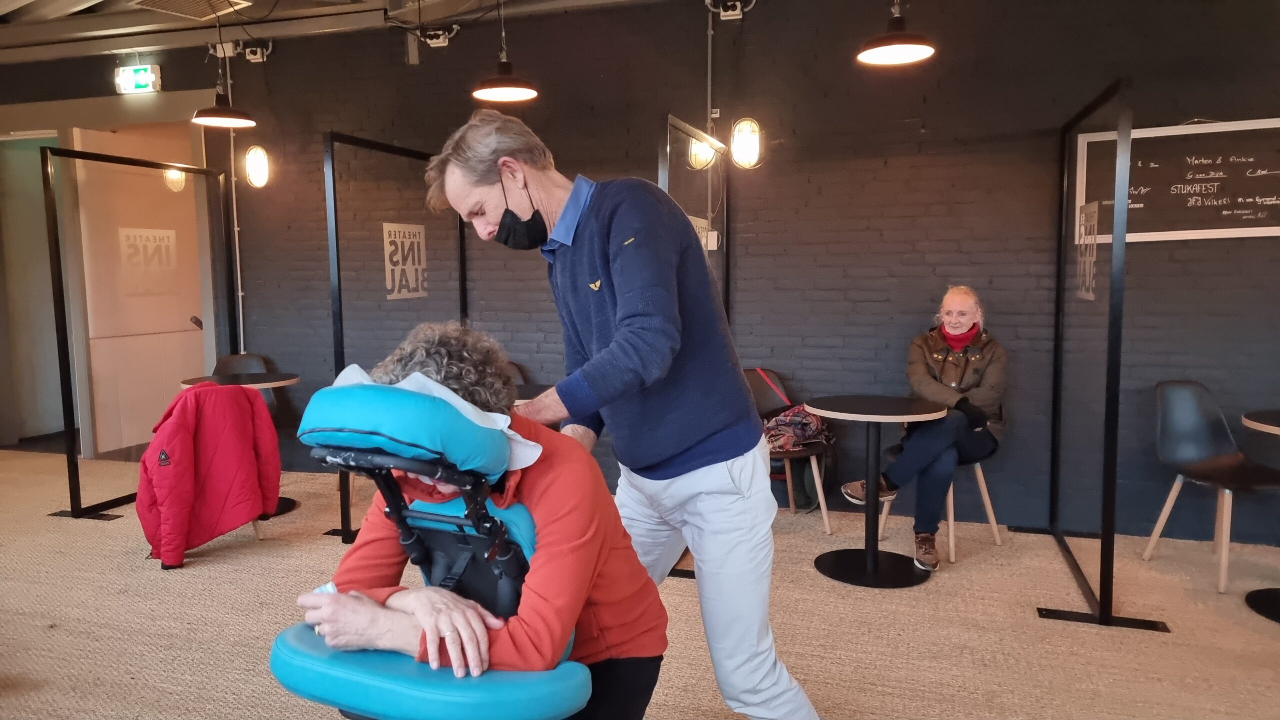 Verslaggever Chris de Waard ging langs bij Theater Ins Blau dat vanmiddag was omgetoverd tot massagesalon. Toen de deuren om 14.00 uur opengingen, waren alle tijdslots al volgeboekt, vertelt artistiek leider Kees van Leeuwen.