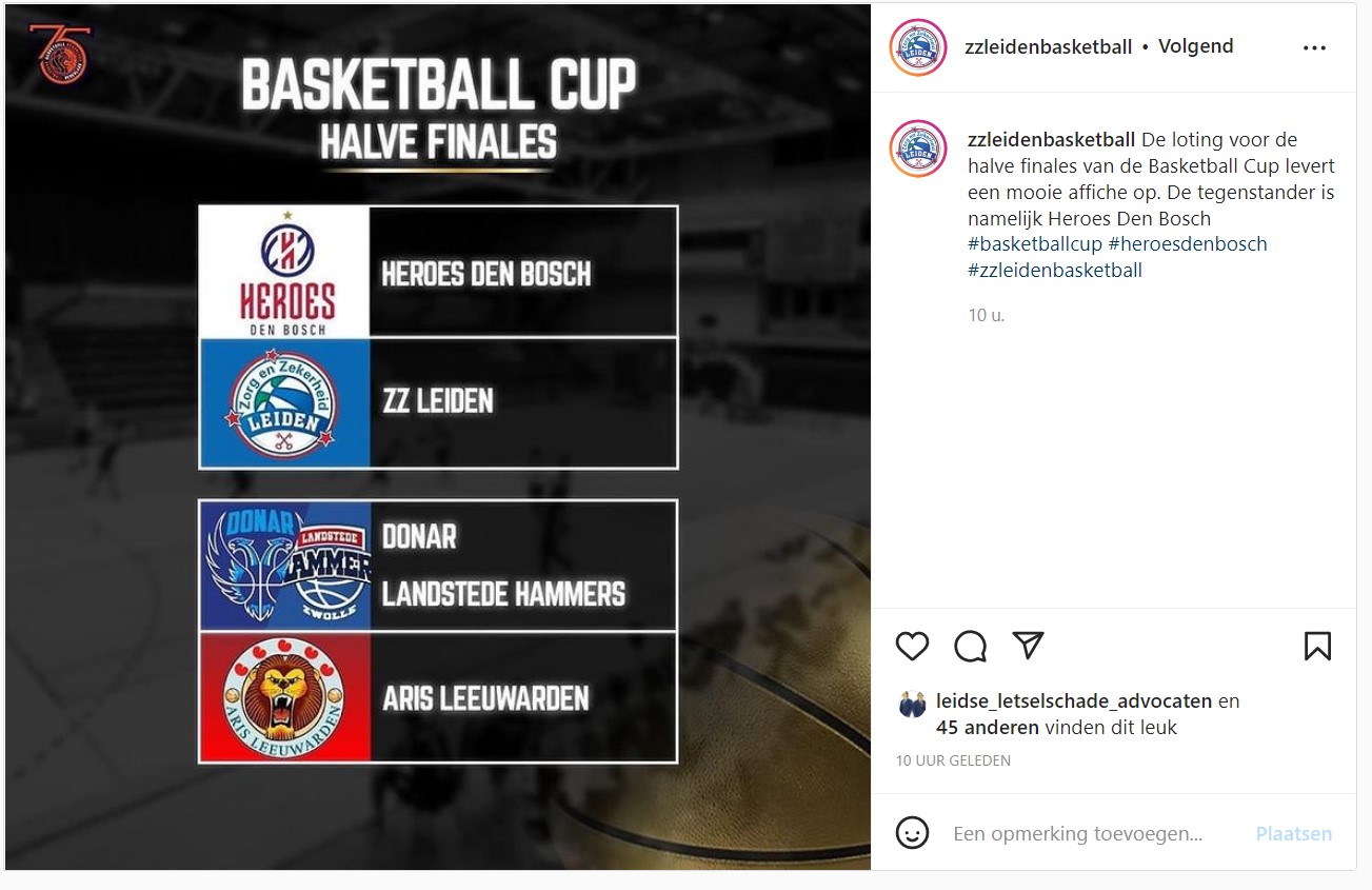 In de halve finales van de Basketball Cup komt ZZ Leiden uit tegen Heroes Den Bosch in Den Bosch. In de andere halve finale speelt Donar Landstede Hammers thuis tegen Aris Leeuwarden.