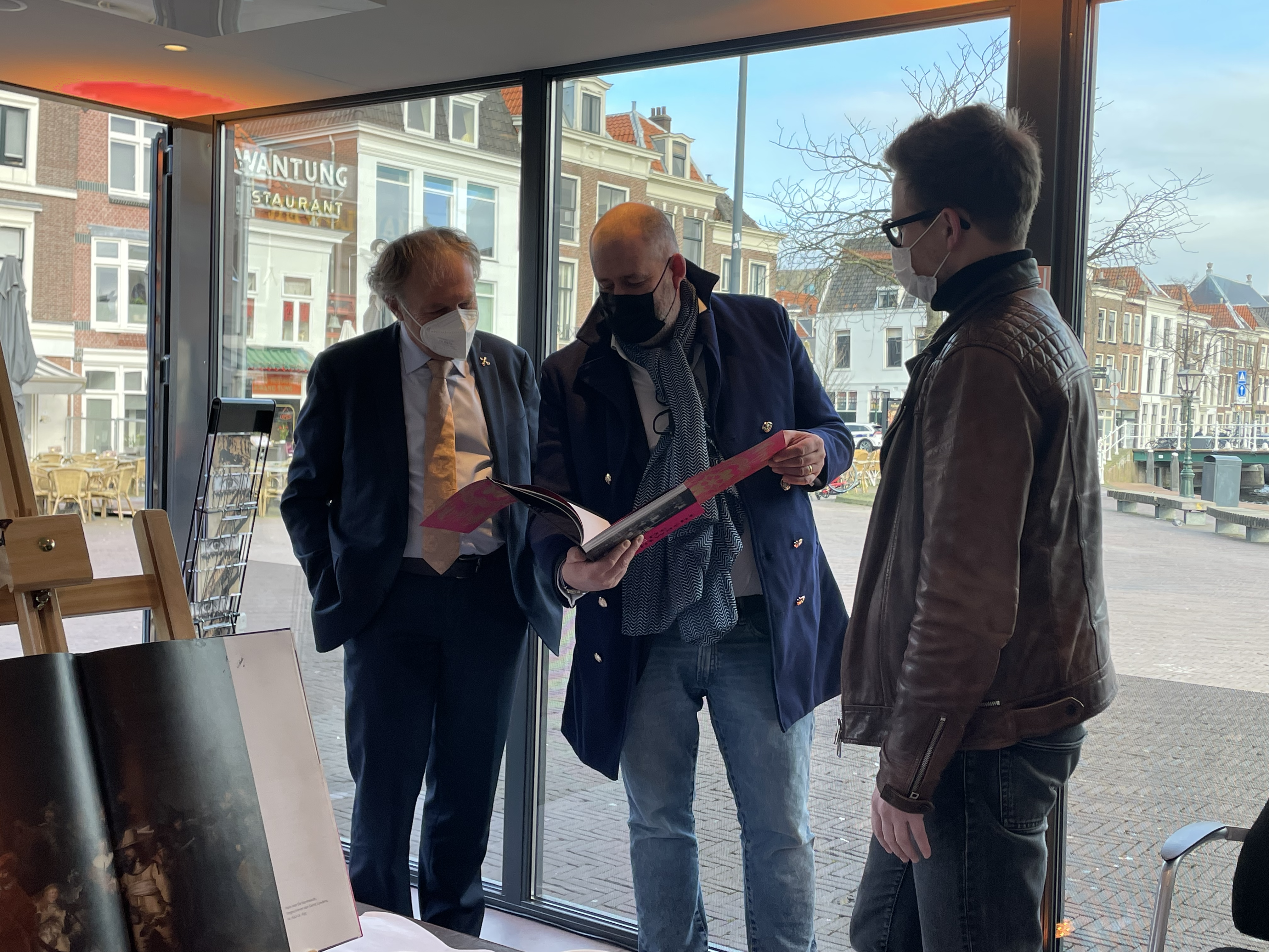 Verslaggever Mandana Sotodeh in gesprek met burgemeester Lenferink en wetenschapshistoricus Thijs Hagendijk