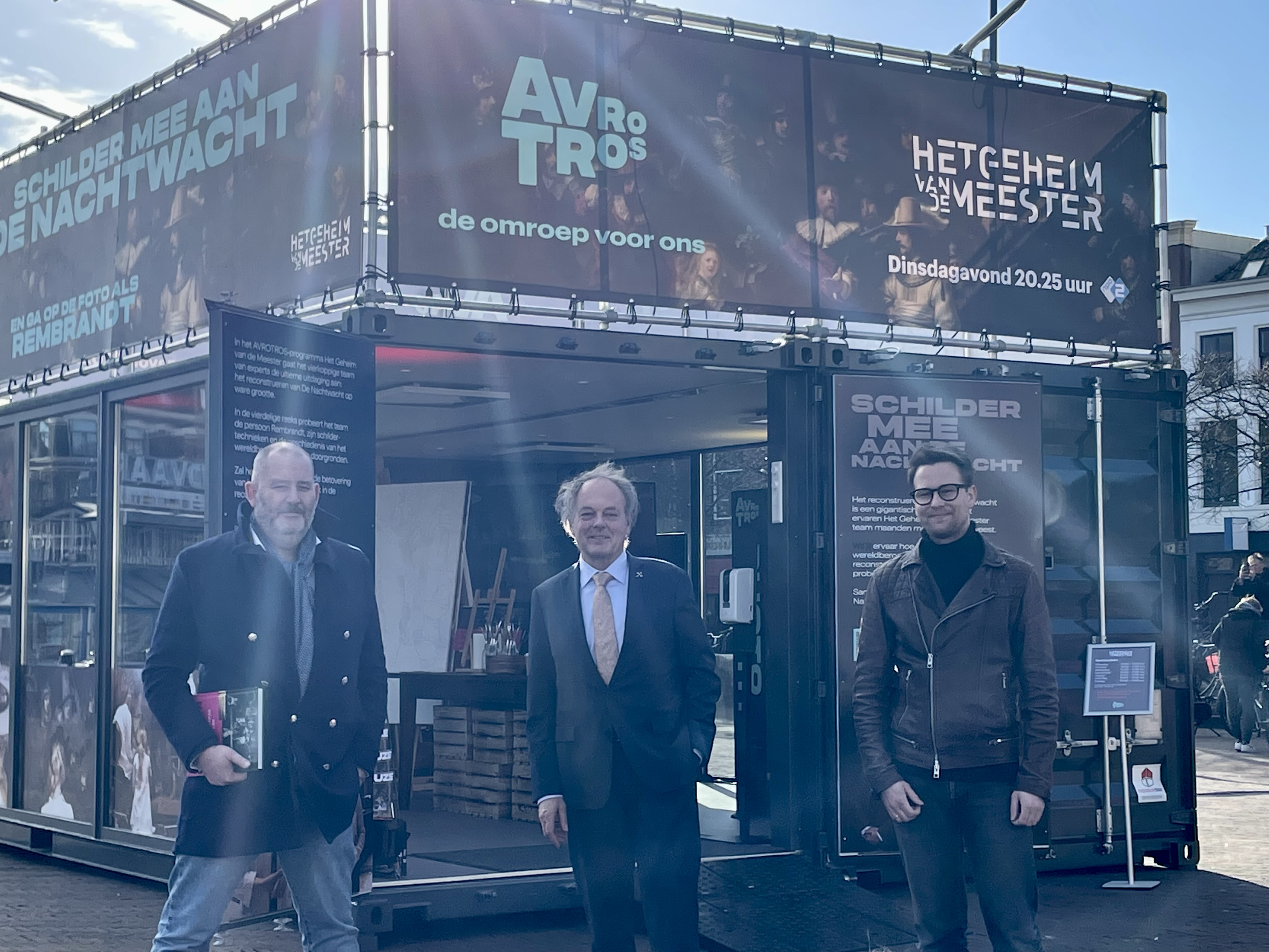 Er staat deze week een glazen huis op de Beestenmarkt. Als je door de ruiten gluurt zie je schilderdoeken en een tafel vol met verf en kwasten. Gisteren opende burgemeester Lenferink deze zogenoemde ‘exposure-box’ en zette de eerste verfstreken op het doek van een nieuwe Nachtwacht.