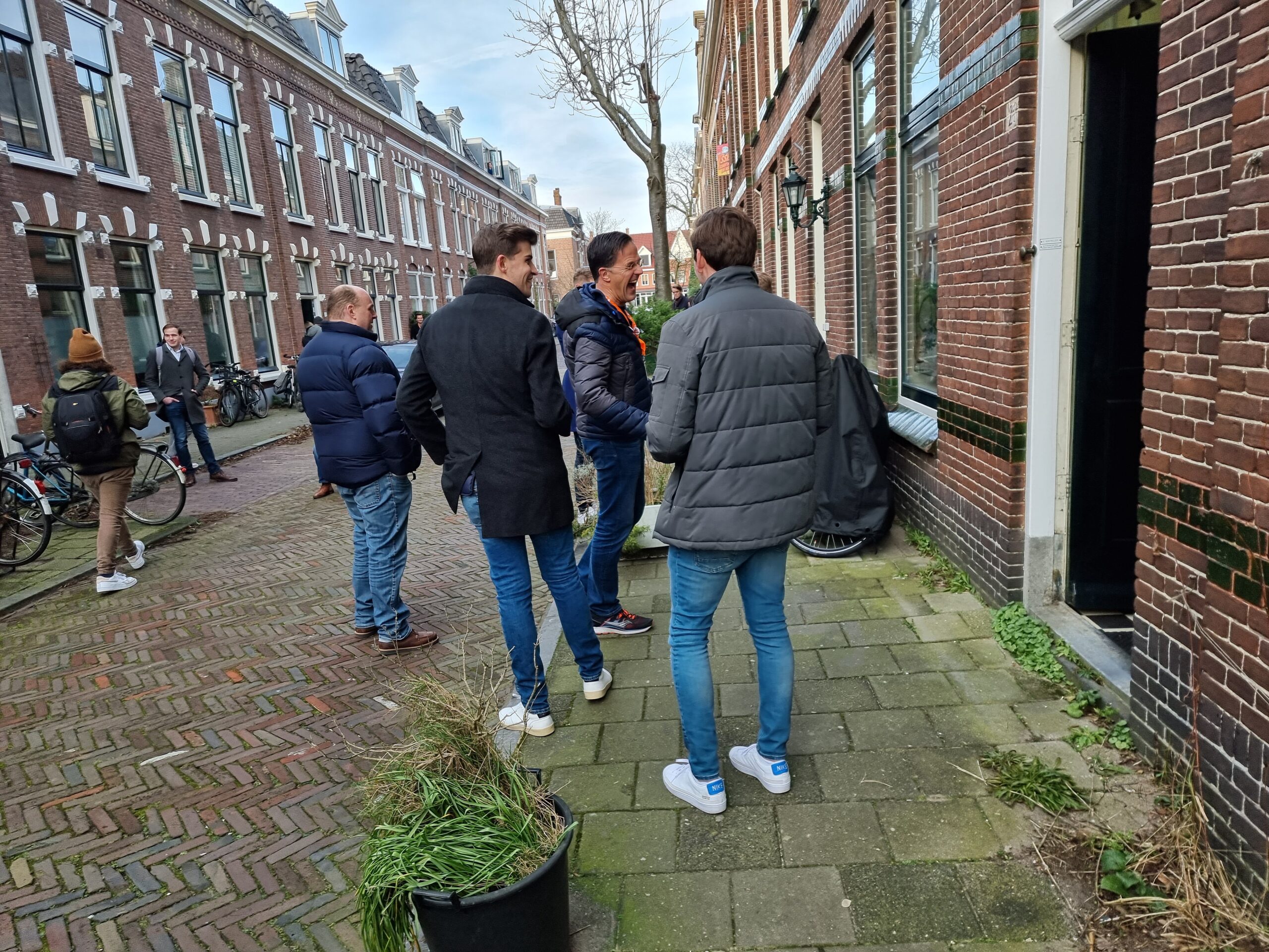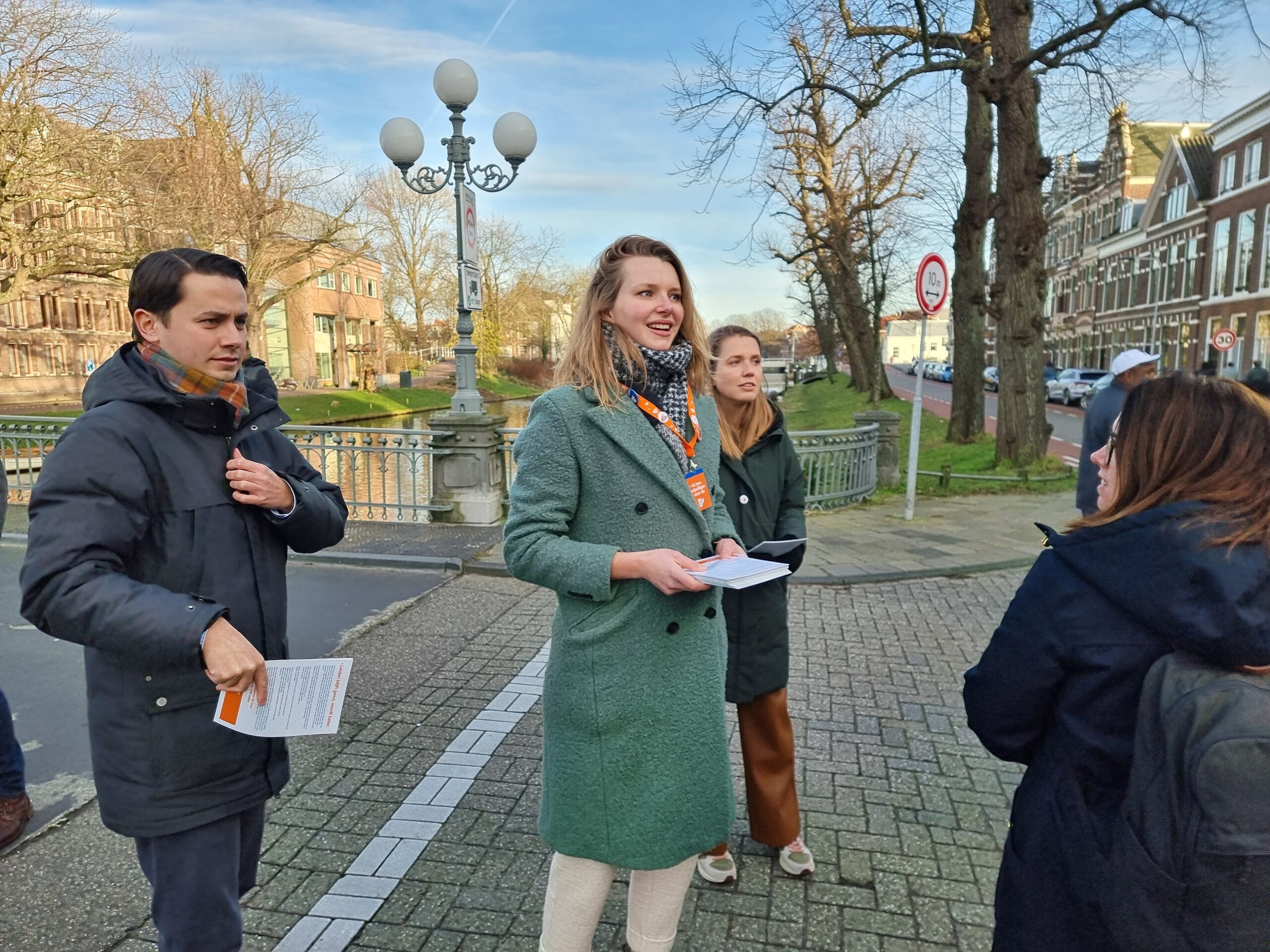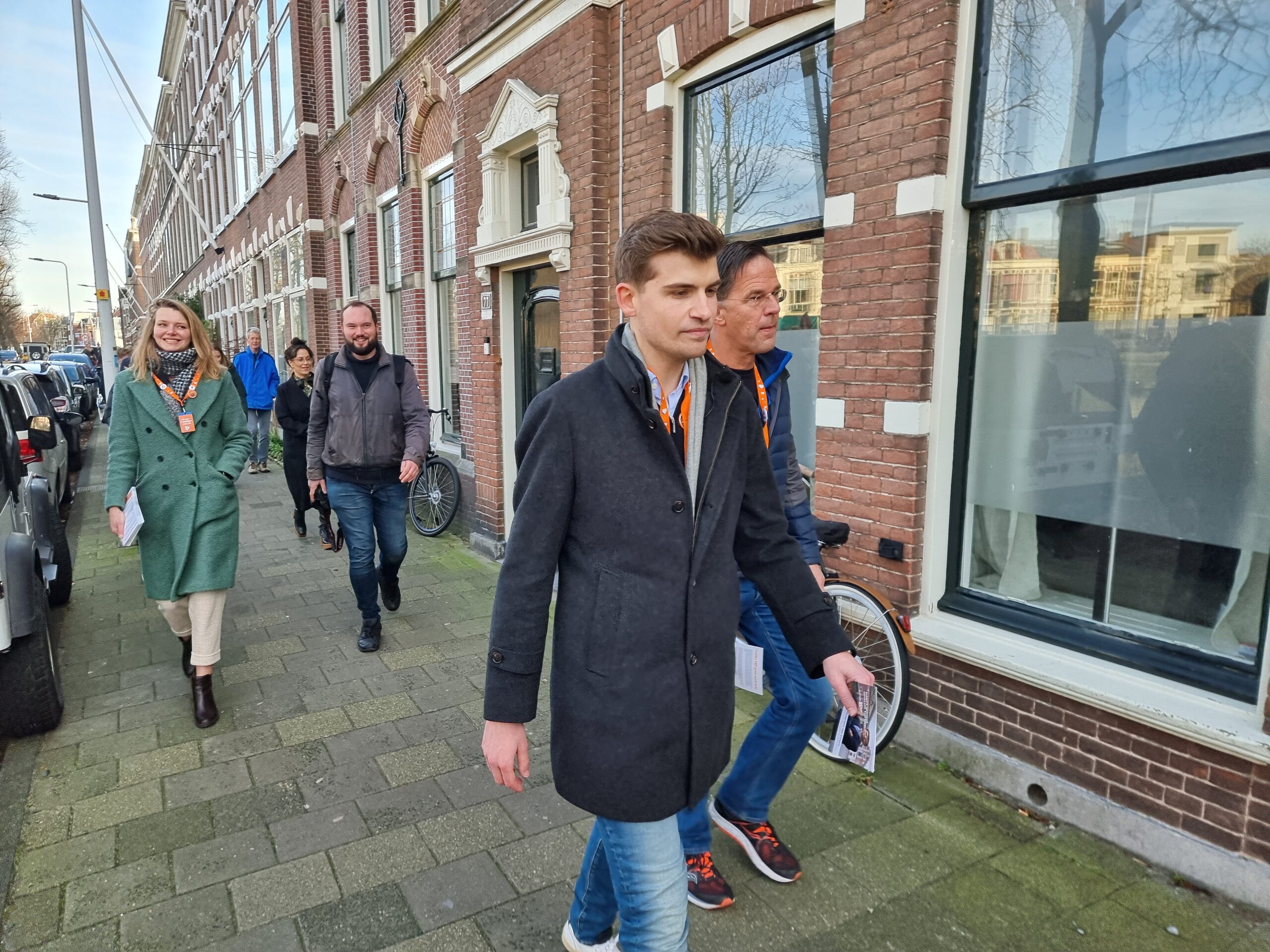 Voordat het gezelschap de Hugo de Grootstraat introk om daar huis aan huis het liberale evangelie te verkondigen, gingen De Crom en Rutte voor het terras van Babbels op de Kaiserstraat in op de stand van de stad. “Leiden heeft een klassiek links college, dus het is wel belangrijk dat de VVD er is om ervoor te zorgen dat je bijvoorbeeld nog een beetje met de auto bij de ondernemers kunt komen”, vond Rutte.