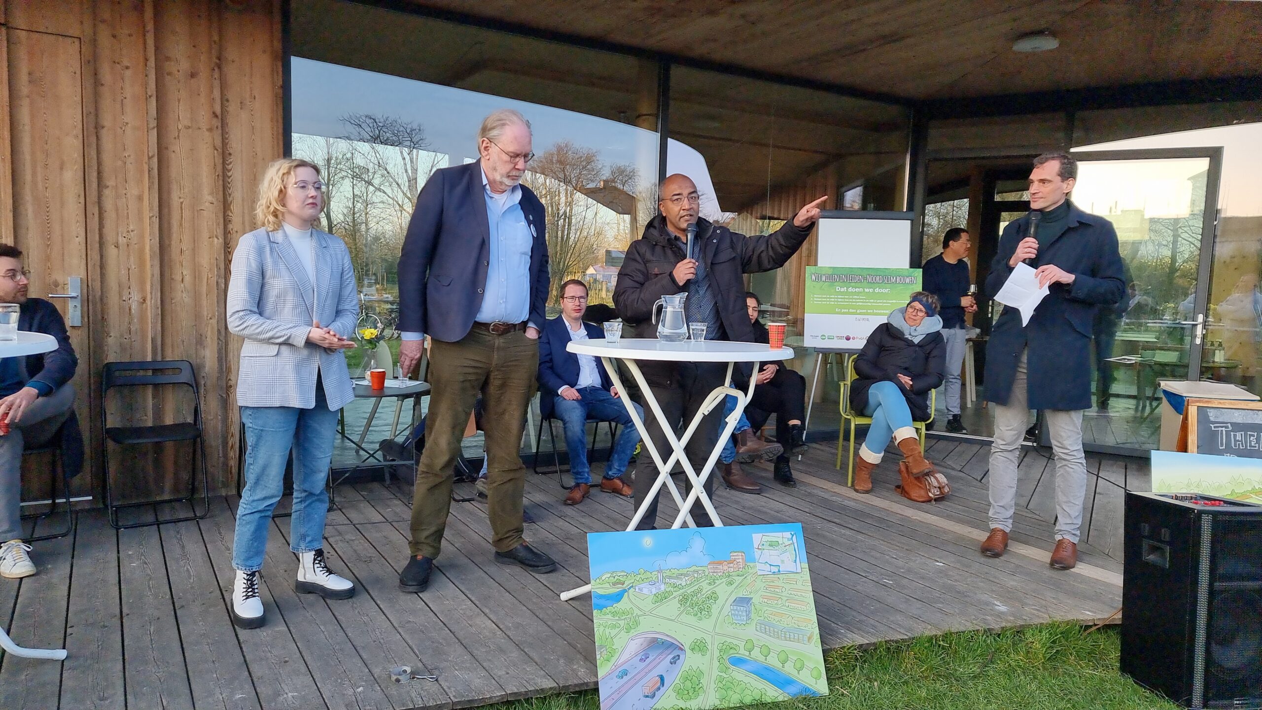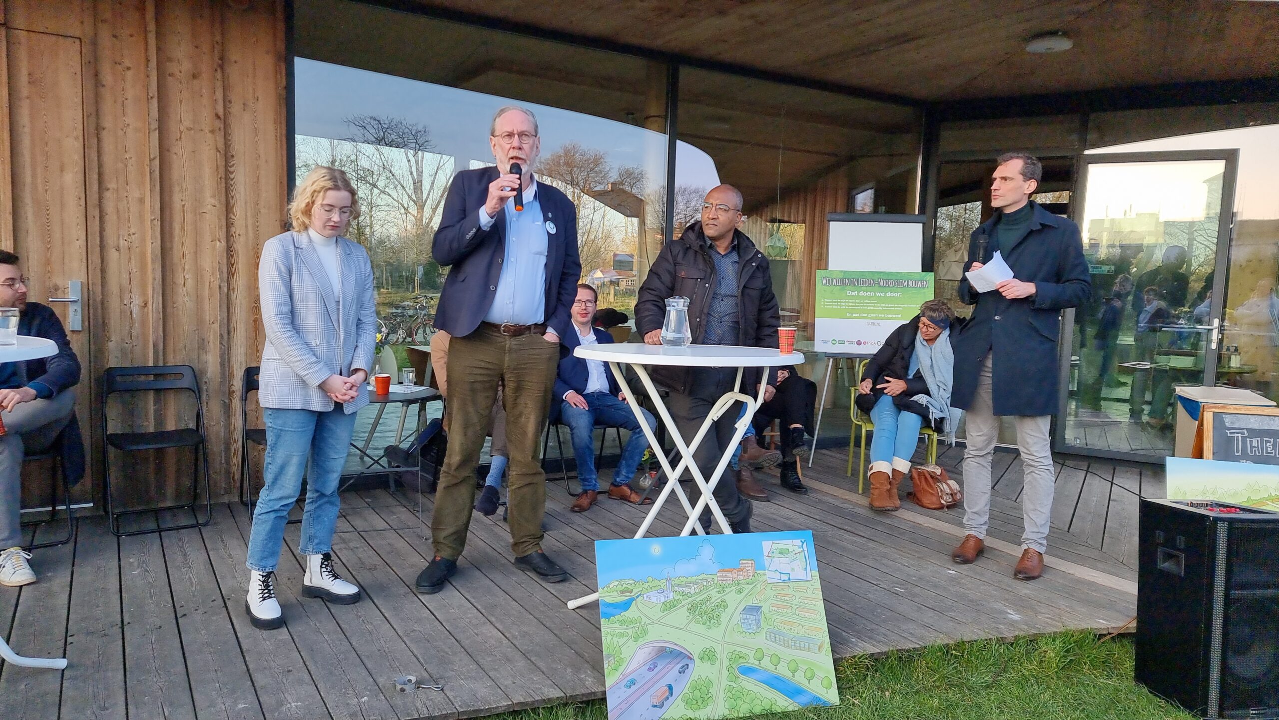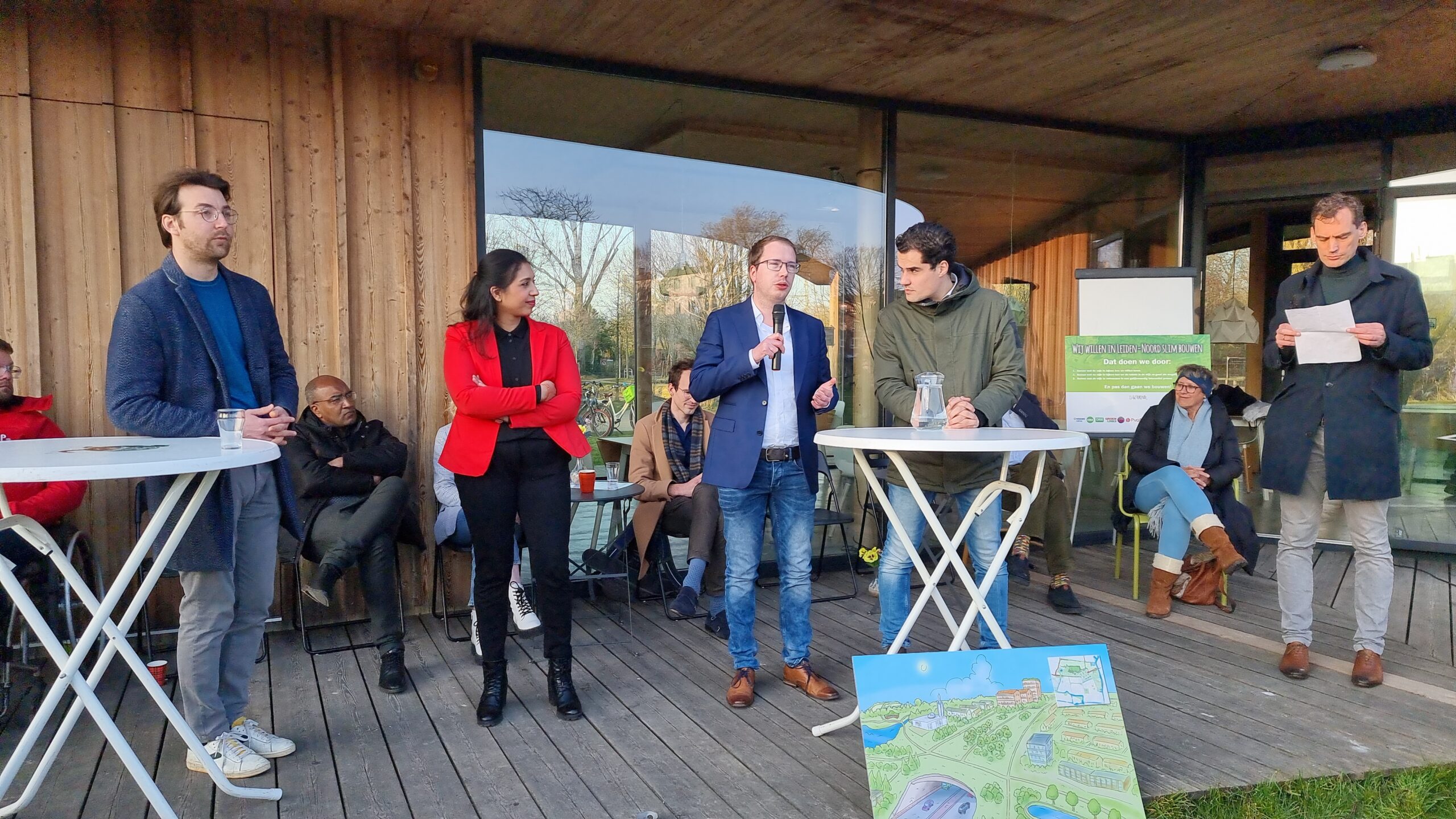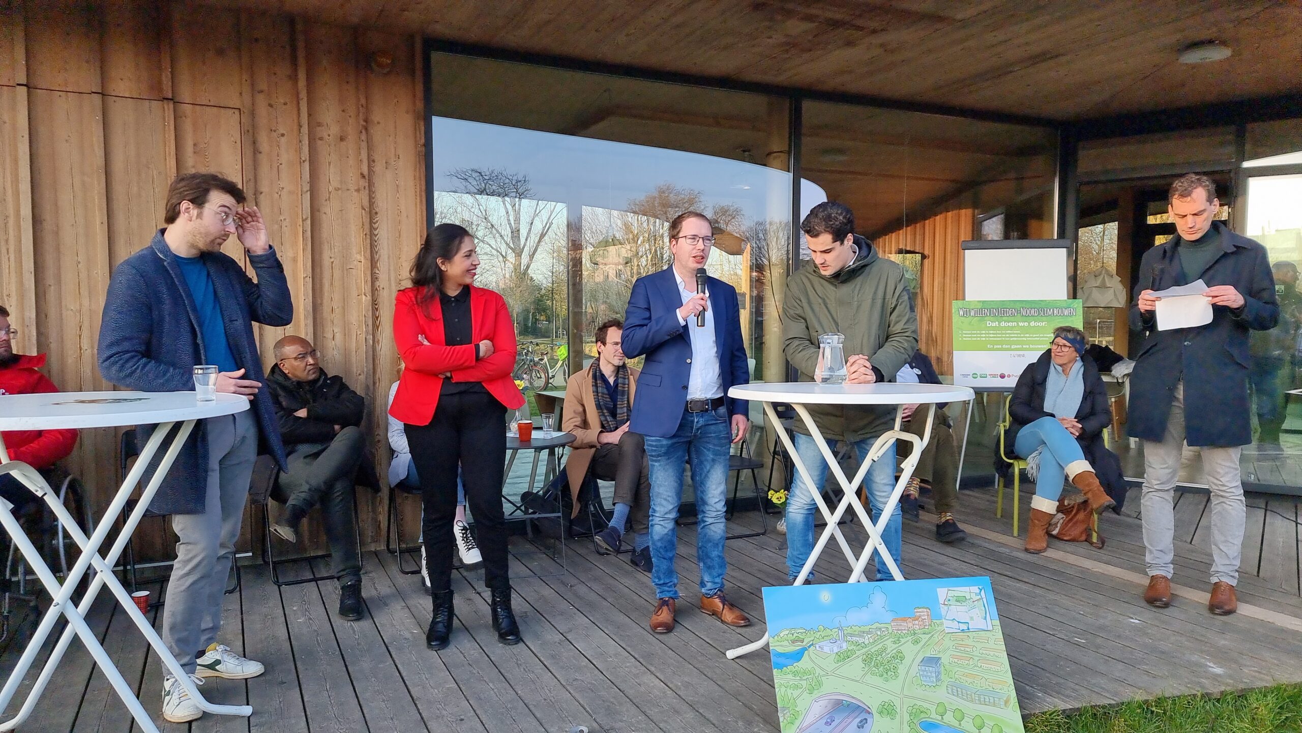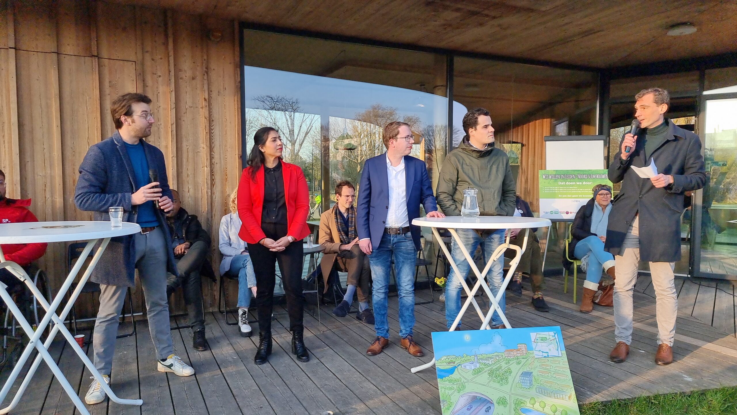 Woensdagmiddag waren kandidaat-raadsleden van alle partijen uitgenodigd voor een walkshop. Tijdens die workshop in de vorm van een wandeling door de wijk werd op drie plekken stilgestaan bij plannen waarvoor de initiatiefnemers een schetsontwerp lieten zien op de plek waar de buurt die ontwikkelingen graag zou zien. Aansluitend werd er een uurtje gedebatteerd op veranda van Theehuis Noord. Centrale vraag daarbij was: “Hoe zien de Leidse politieke partijen de toekomst van Leiden-Noord?”