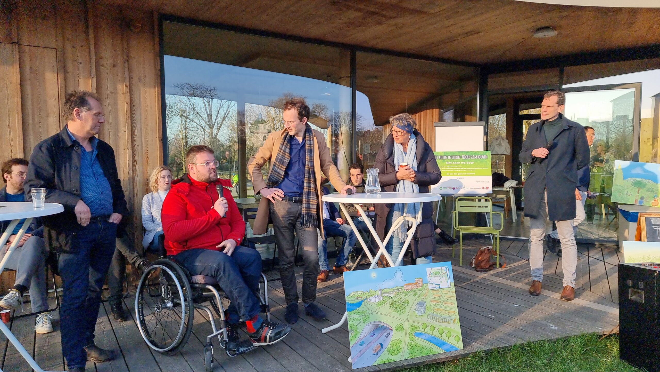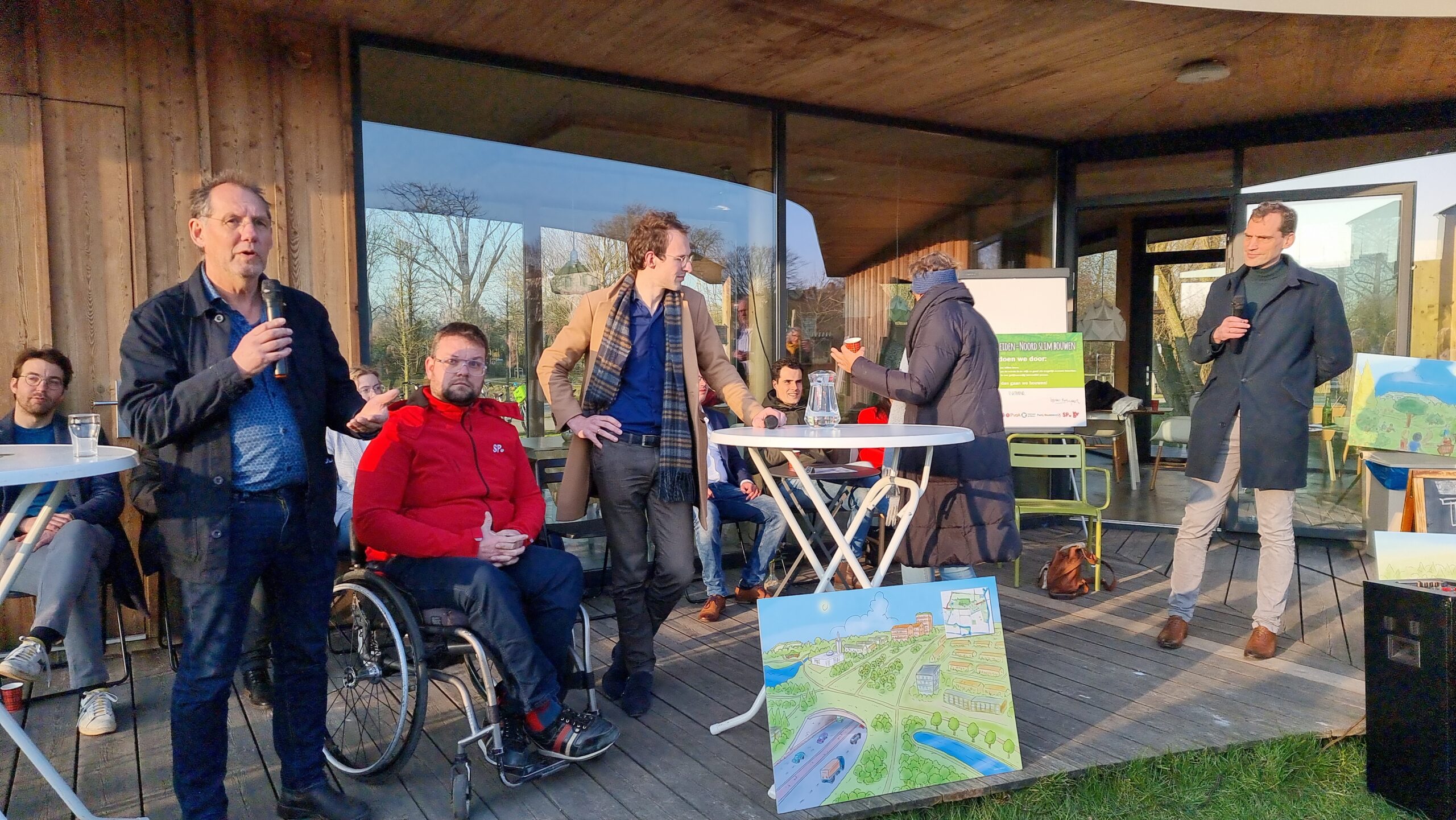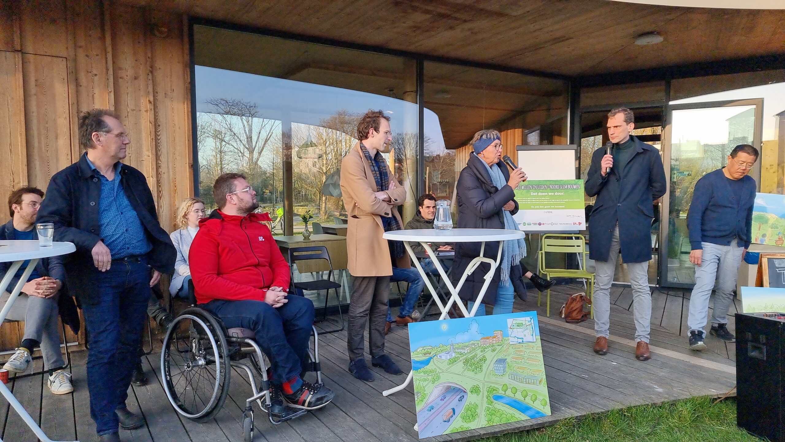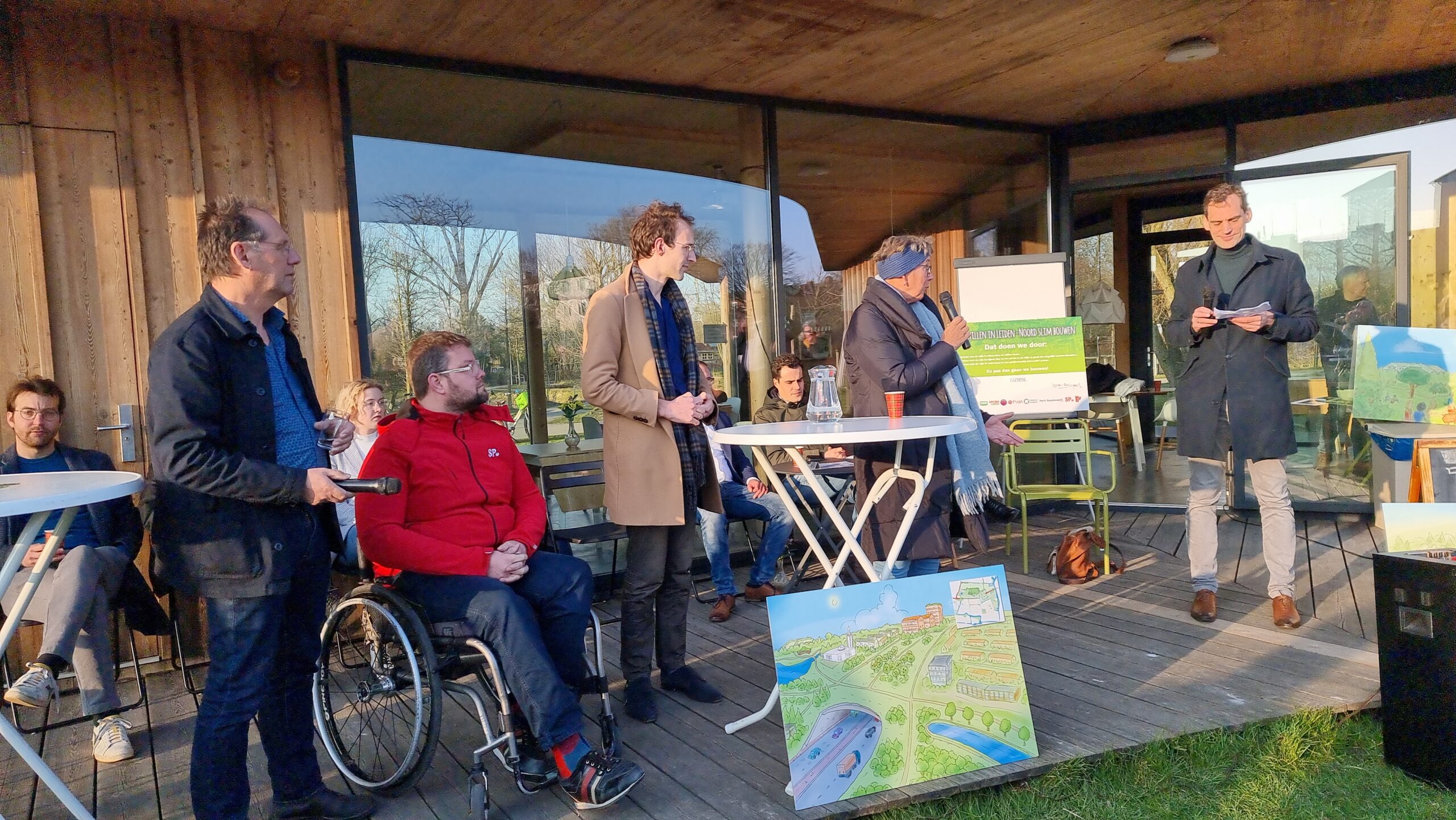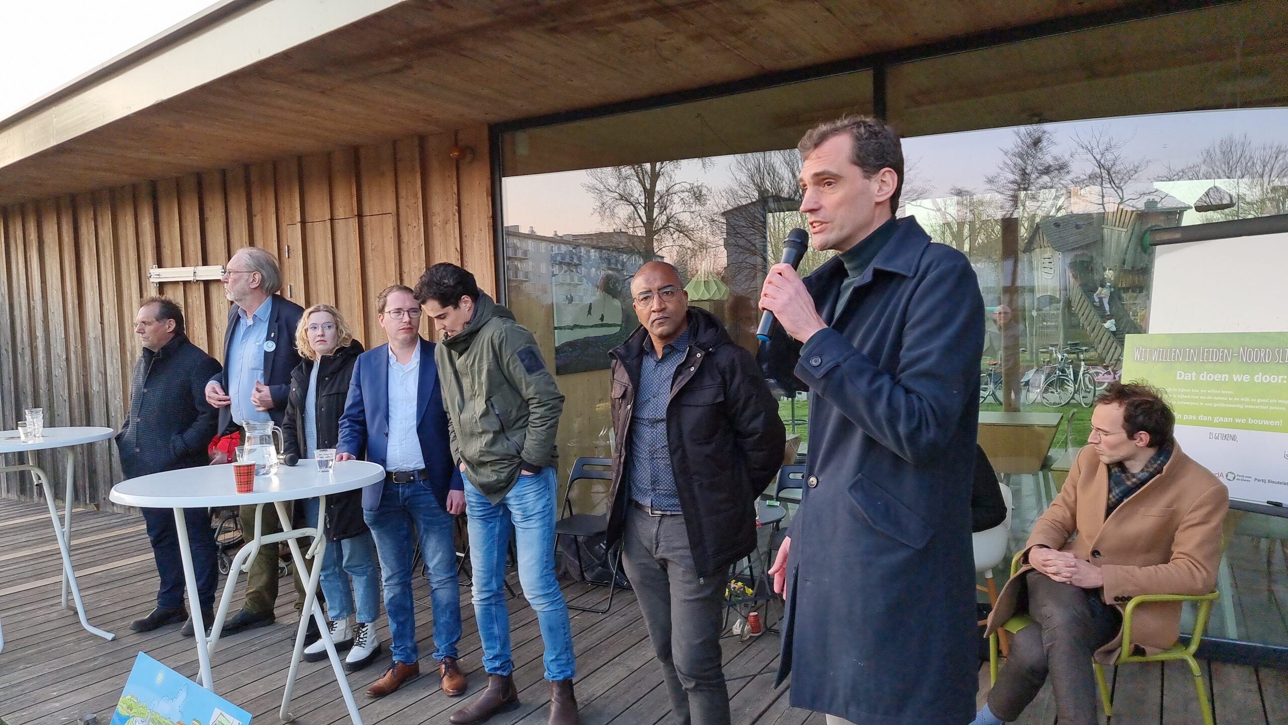 Woensdagmiddag waren kandidaat-raadsleden van alle partijen uitgenodigd voor een walkshop. Tijdens die workshop in de vorm van een wandeling door de wijk werd op drie plekken stilgestaan bij plannen waarvoor de initiatiefnemers een schetsontwerp lieten zien op de plek waar de buurt die ontwikkelingen graag zou zien. Aansluitend werd er een uurtje gedebatteerd op veranda van Theehuis Noord. Centrale vraag daarbij was: “Hoe zien de Leidse politieke partijen de toekomst van Leiden-Noord?”