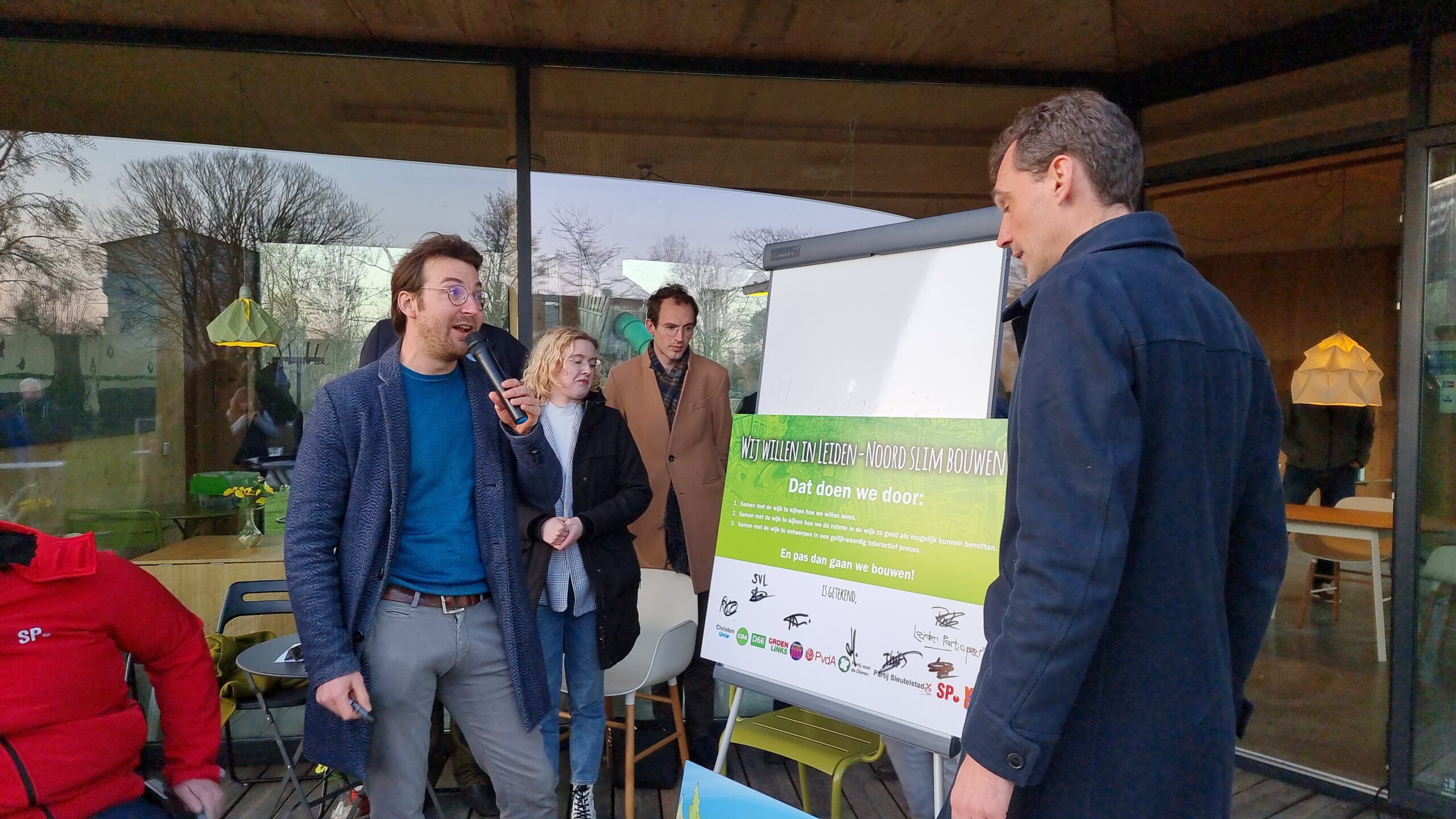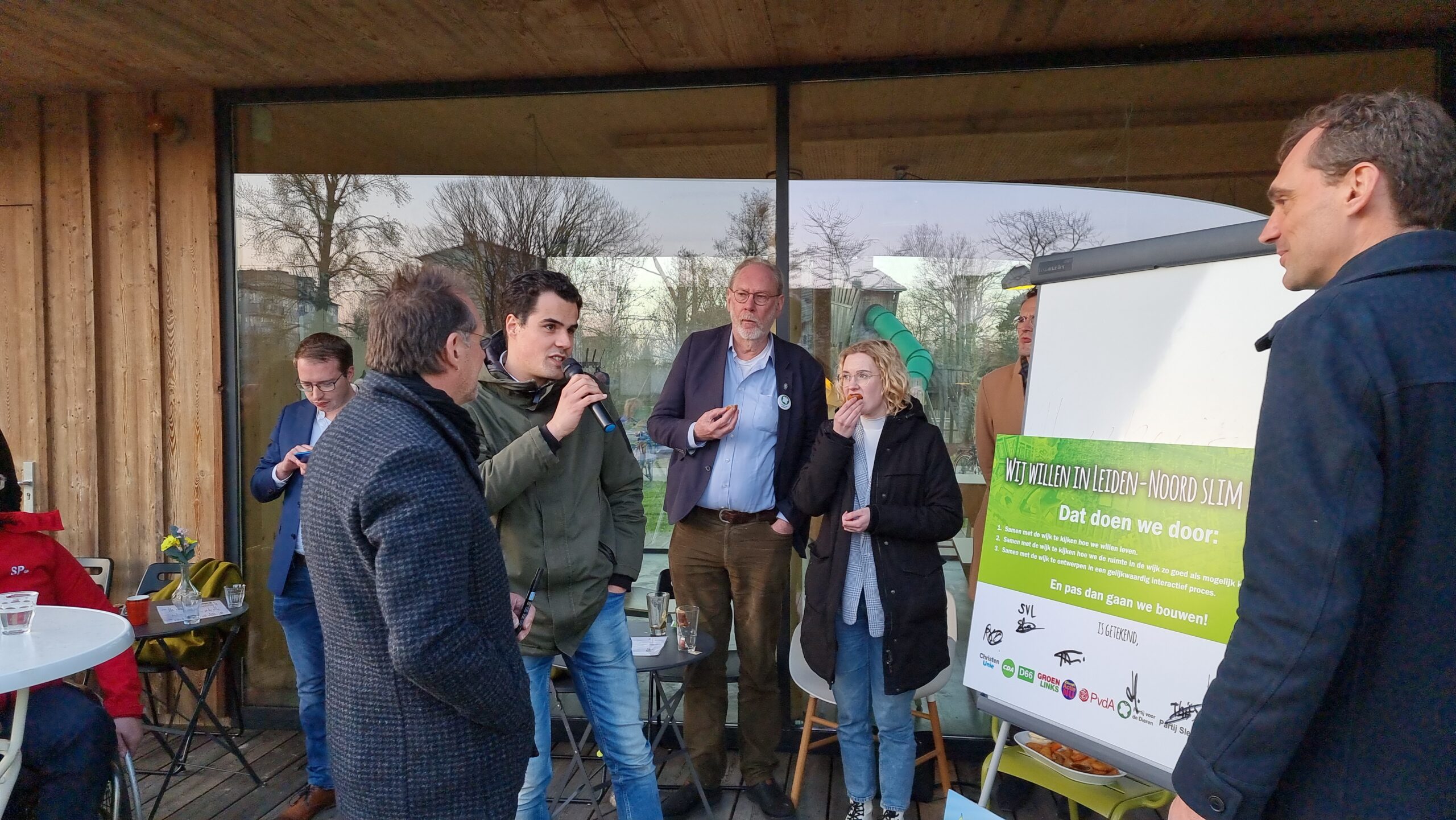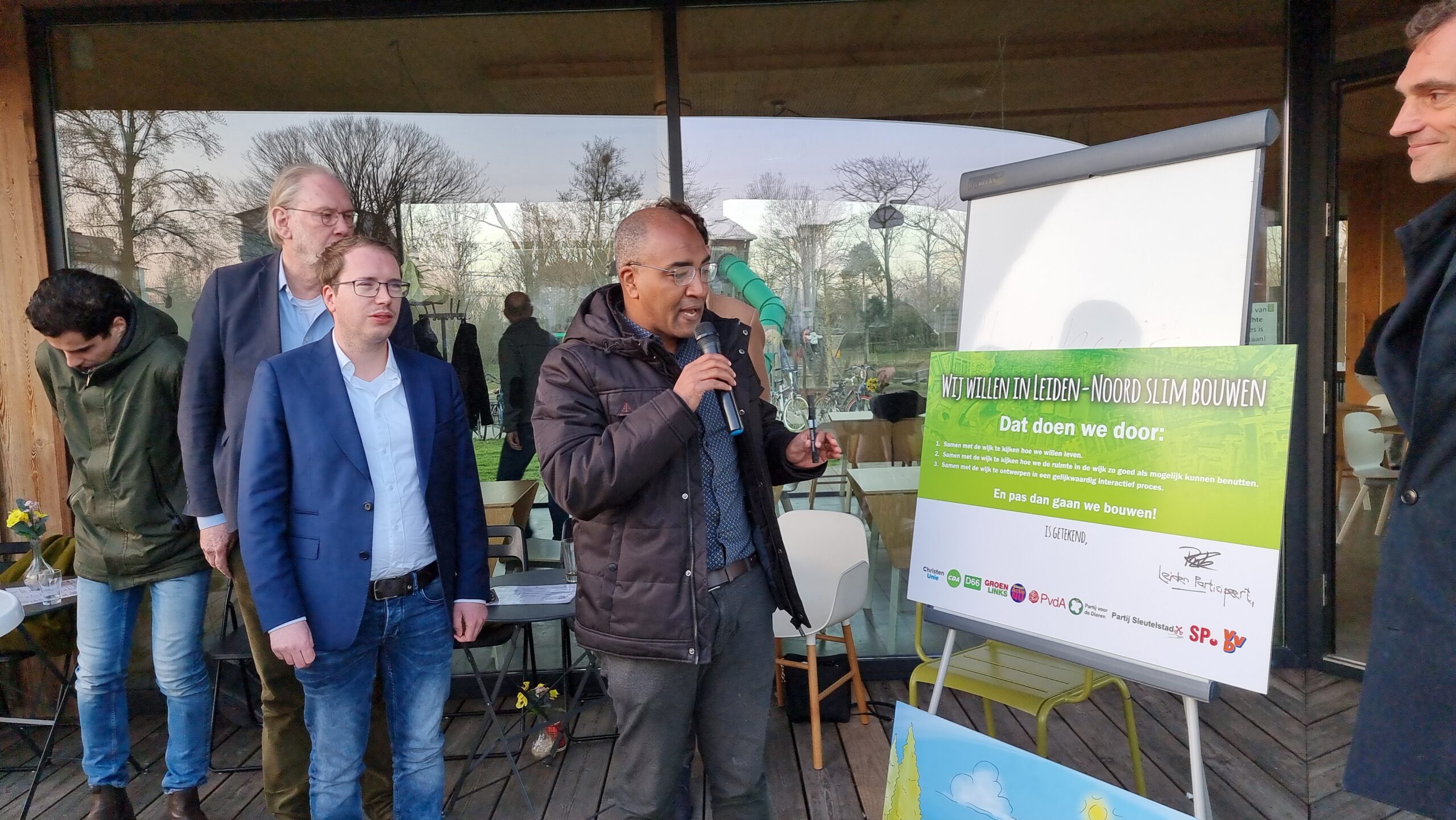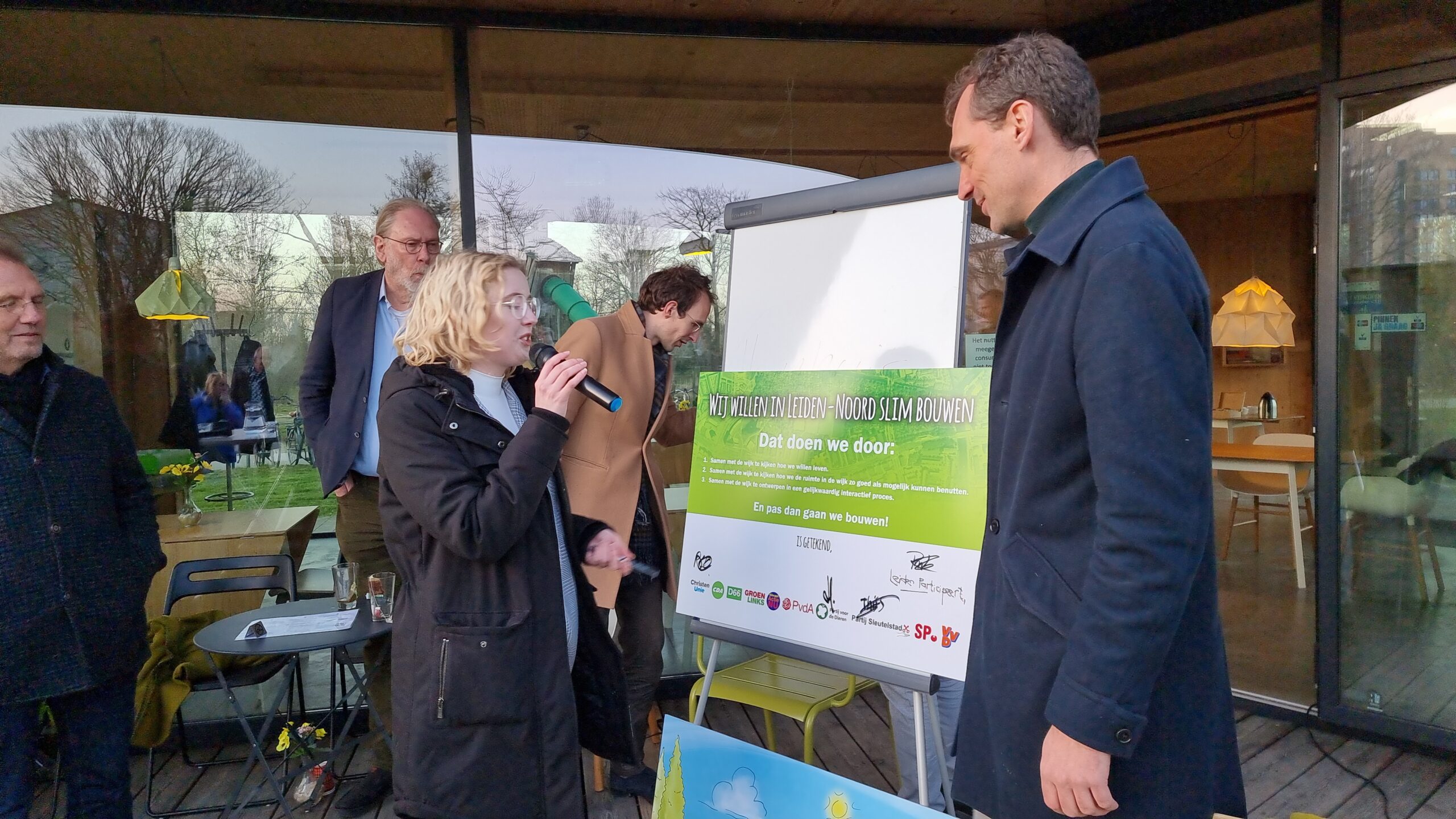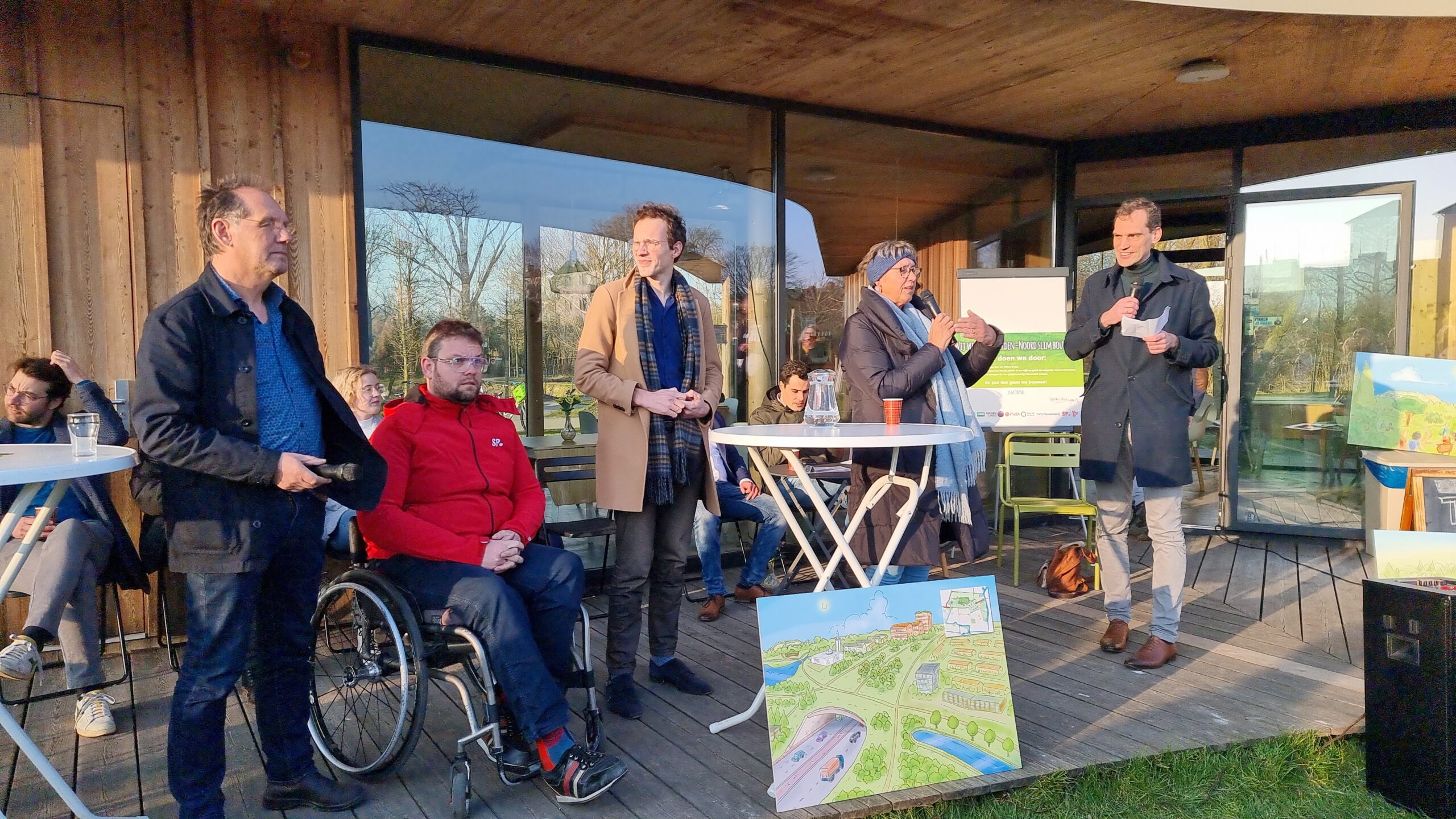 Woensdagmiddag waren kandidaat-raadsleden van alle partijen uitgenodigd voor een walkshop. Tijdens die workshop in de vorm van een wandeling door de wijk werd op drie plekken stilgestaan bij plannen waarvoor de initiatiefnemers een schetsontwerp lieten zien op de plek waar de buurt die ontwikkelingen graag zou zien. Aansluitend werd er een uurtje gedebatteerd op veranda van Theehuis Noord. Centrale vraag daarbij was: “Hoe zien de Leidse politieke partijen de toekomst van Leiden-Noord?”