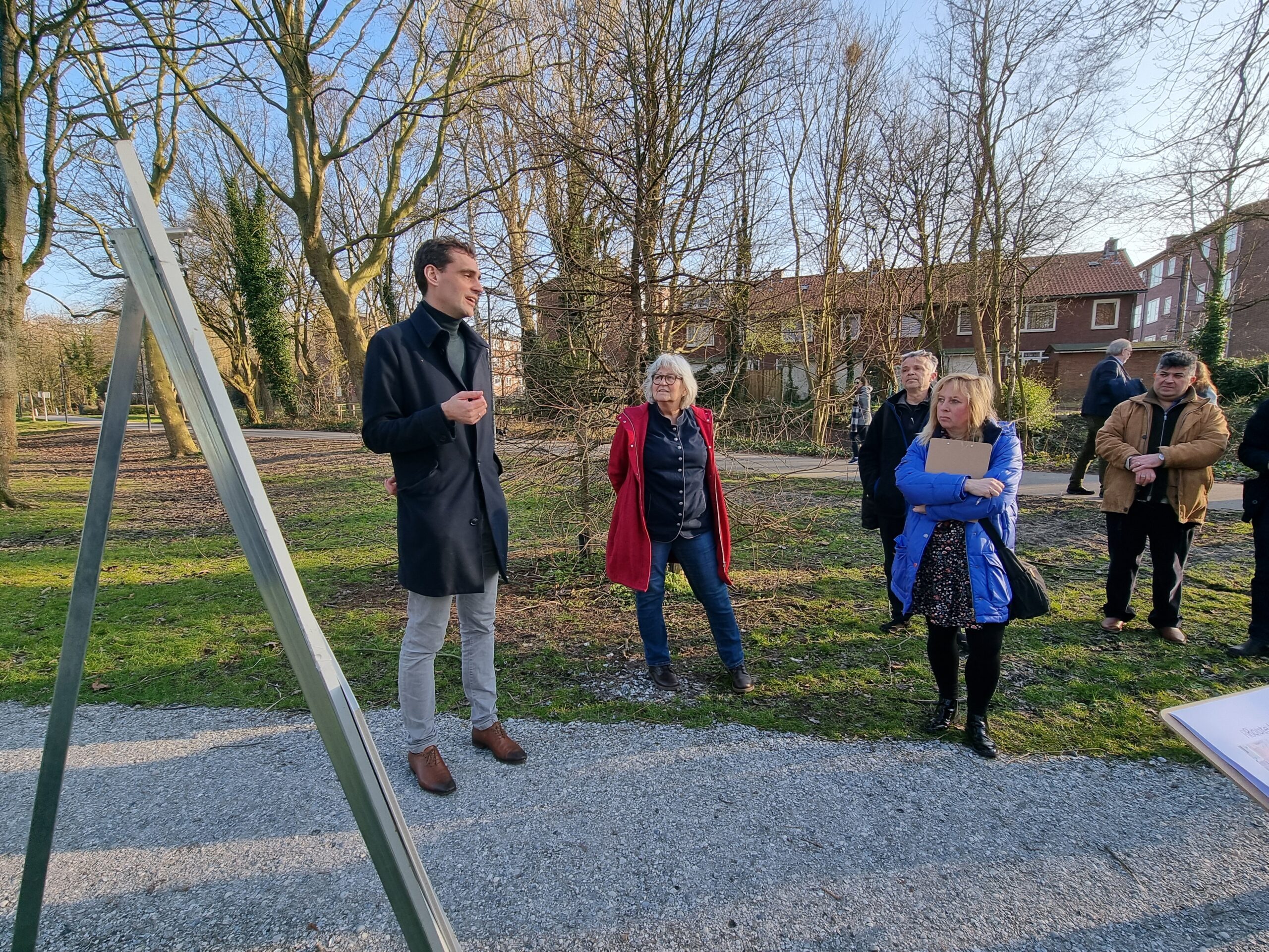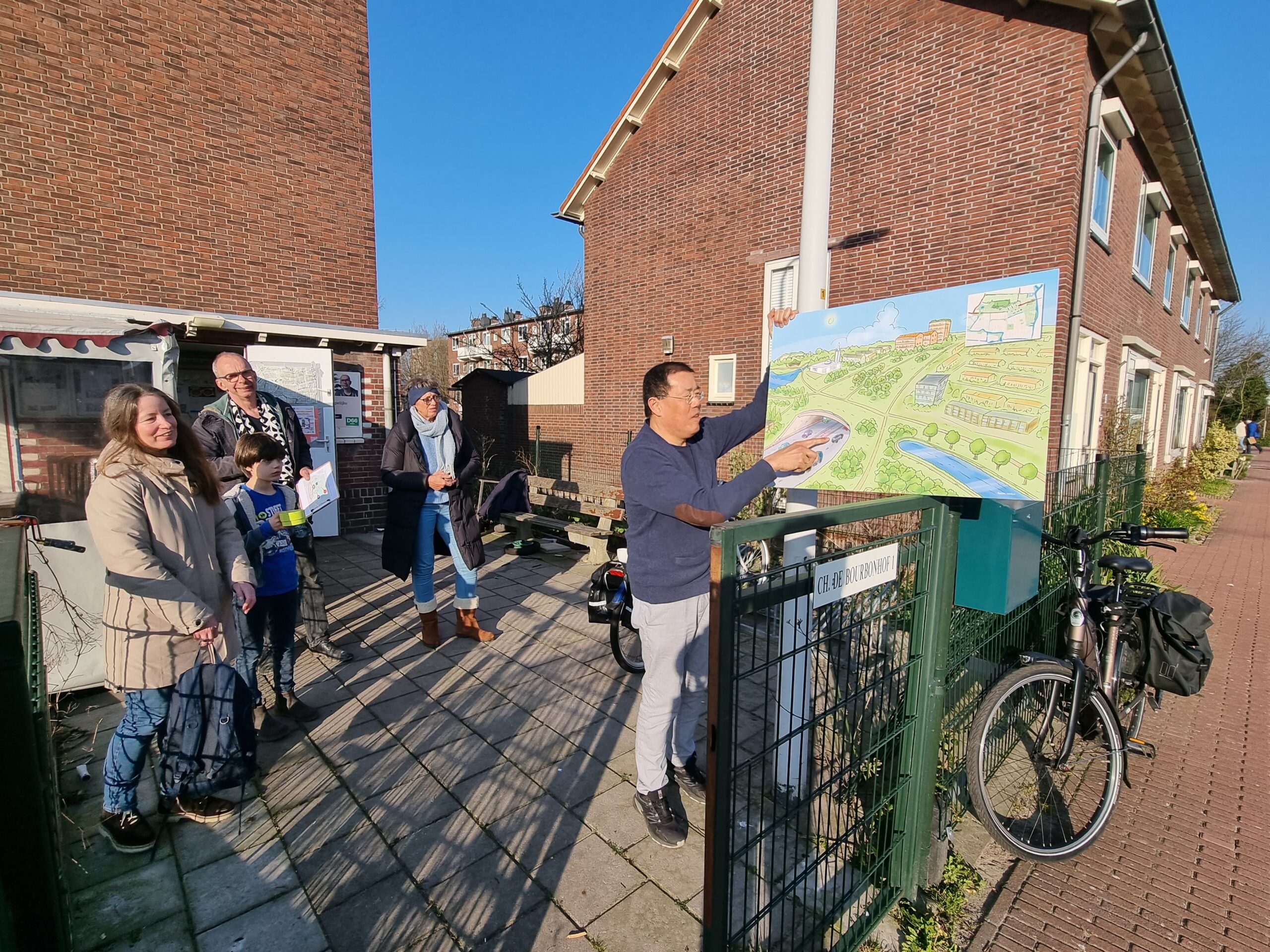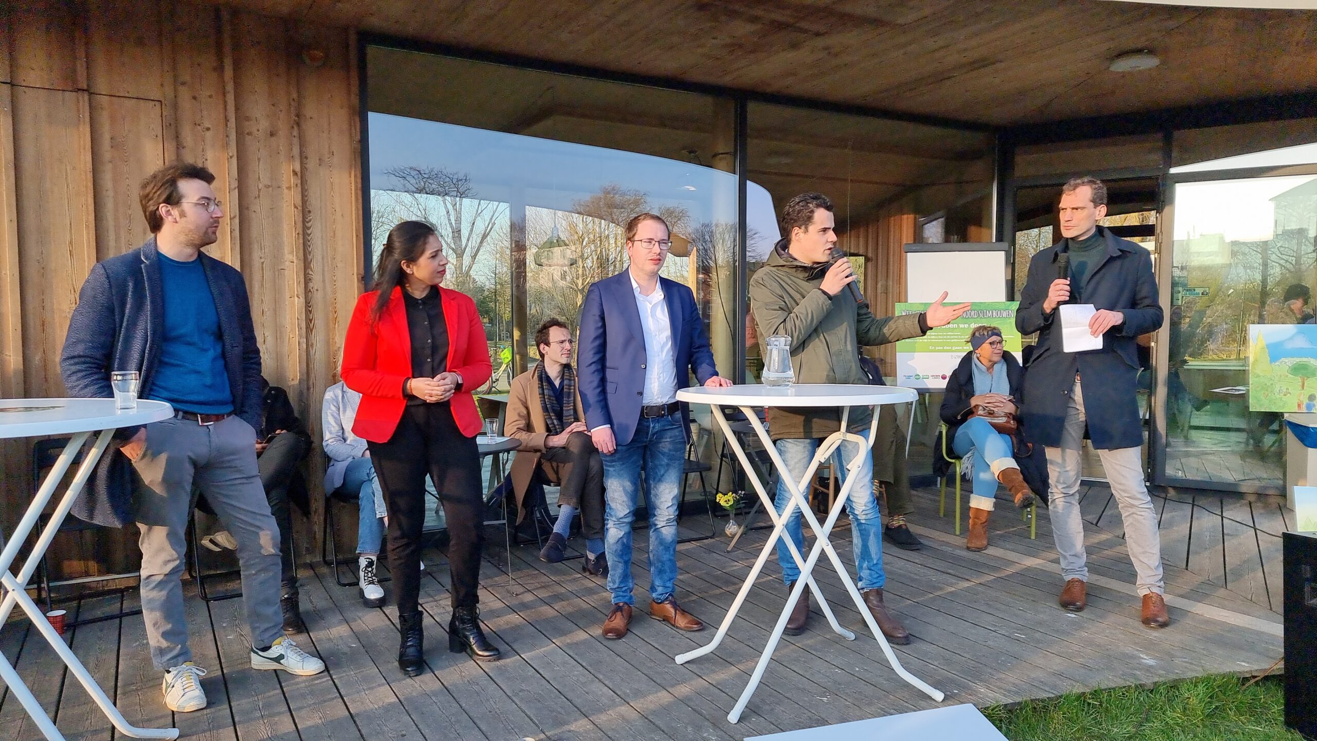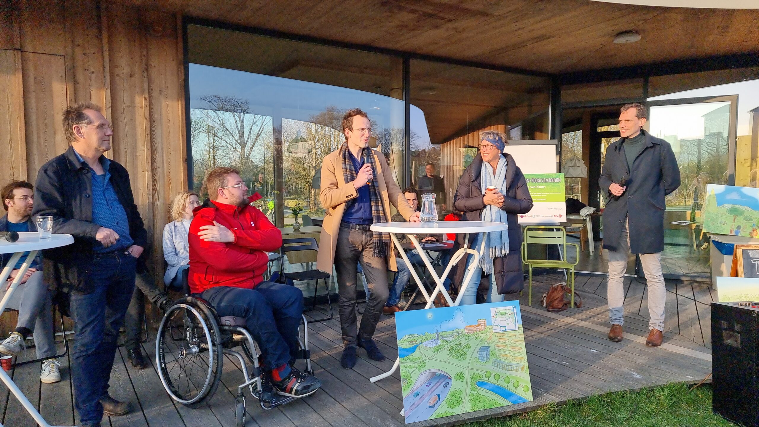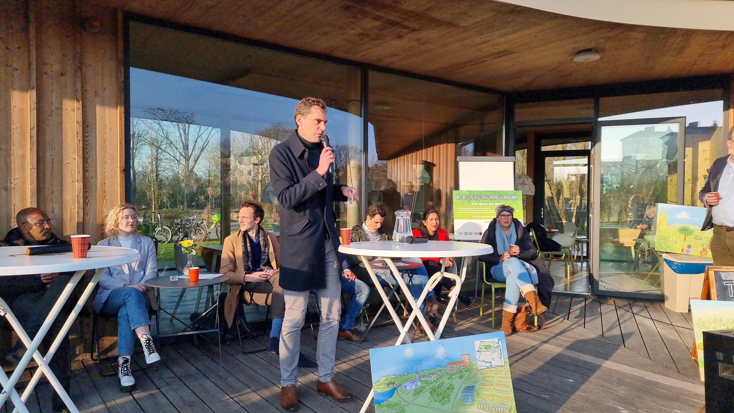 Woensdagmiddag waren kandidaat-raadsleden van alle partijen uitgenodigd voor een walkshop. Tijdens die workshop in de vorm van een wandeling door de wijk werd op drie plekken stilgestaan bij plannen waarvoor de initiatiefnemers een schetsontwerp lieten zien op de plek waar de buurt die ontwikkelingen graag zou zien. Aansluitend werd er een uurtje gedebatteerd op veranda van Theehuis Noord. Centrale vraag daarbij was: “Hoe zien de Leidse politieke partijen de toekomst van Leiden-Noord?”