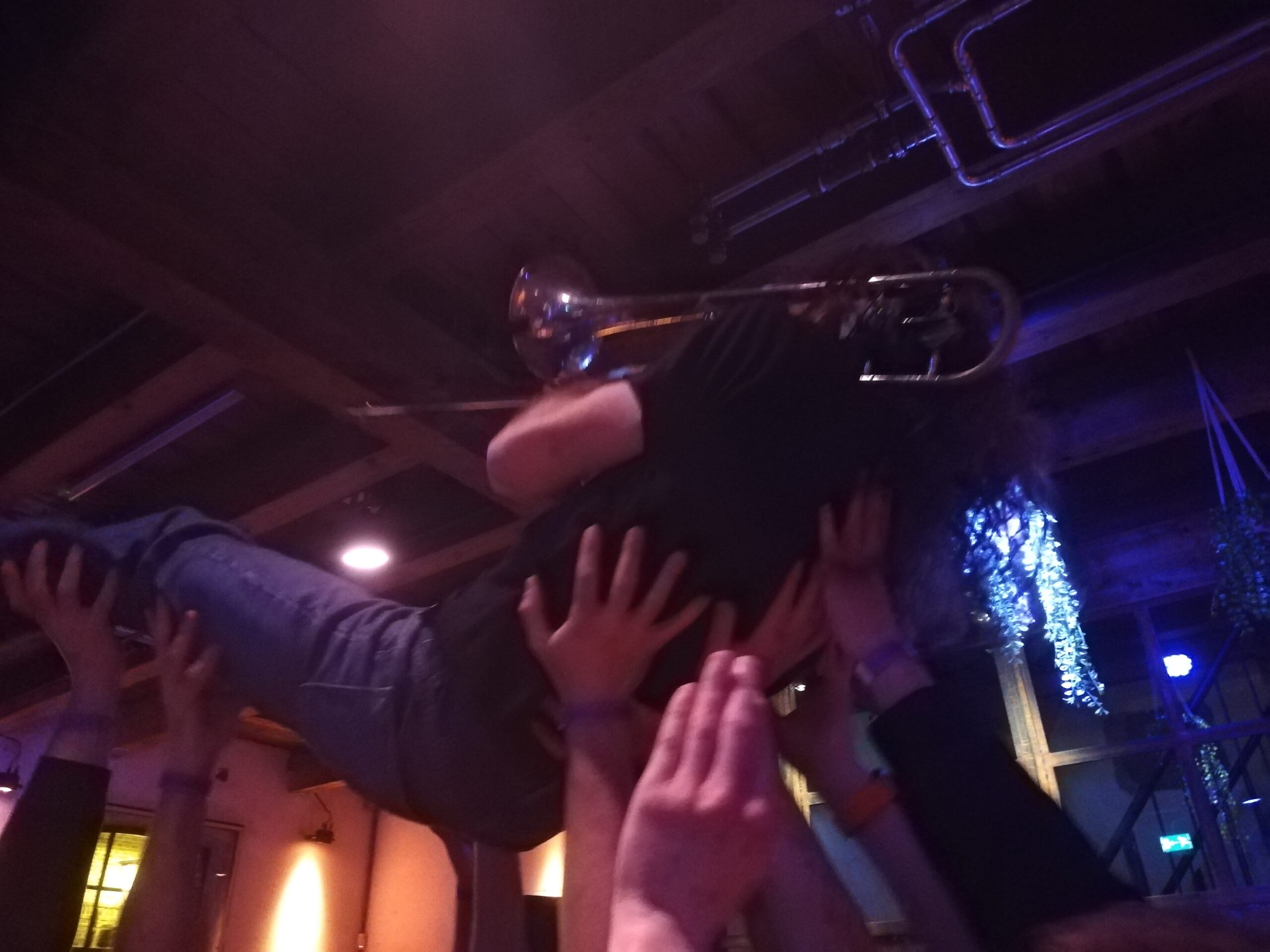 Het was een goede keuze van de organisatie het beladen optreden van Burkot direct te laten volgen door de denderende postpunk van de Rotterdamse mannen en vrouwen van Tramhaus. Zo kon de wat vervreemdende sfeer worden omgezet in een bak dampende energie. Het was een waardige afsluiter van een bijzondere avond.