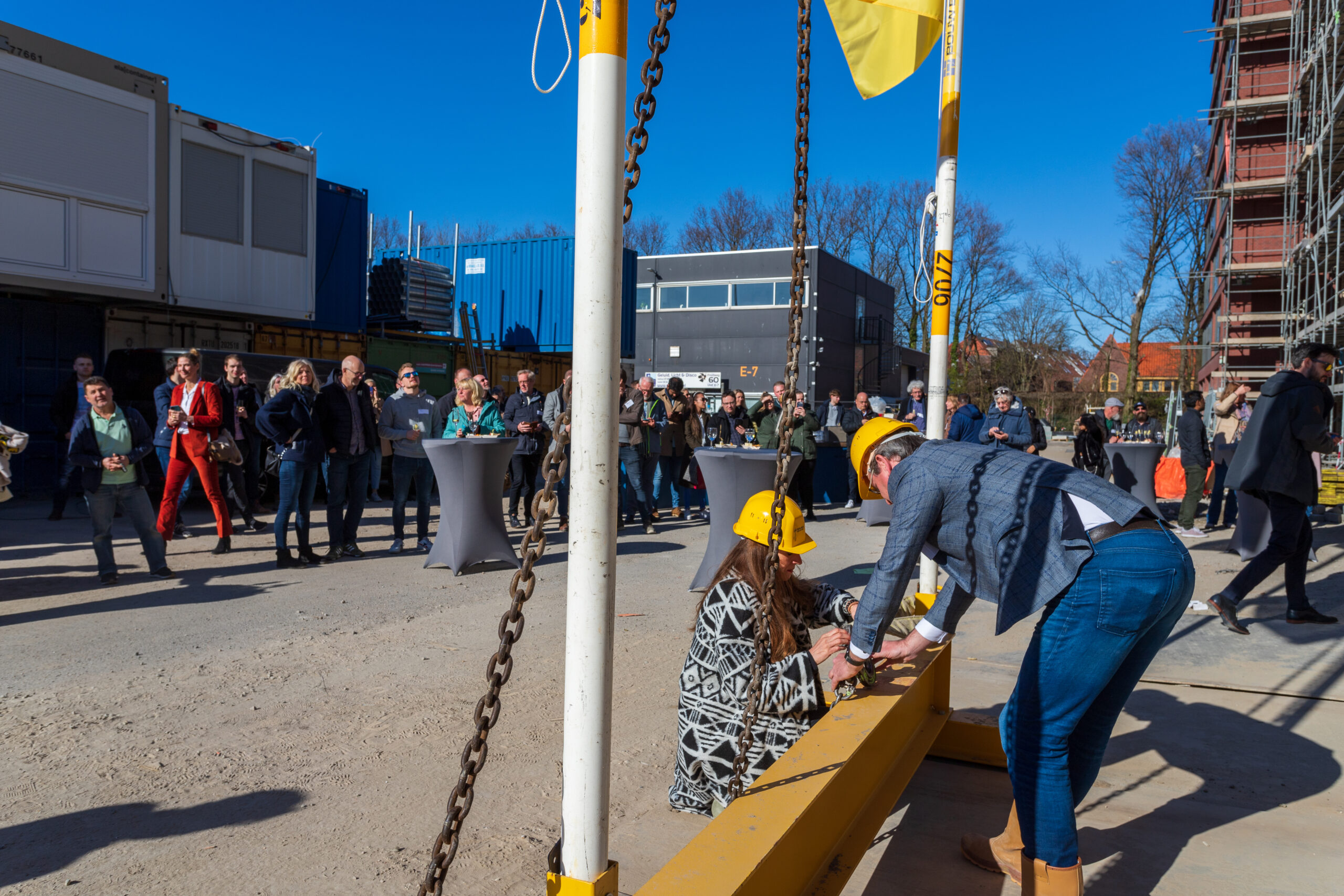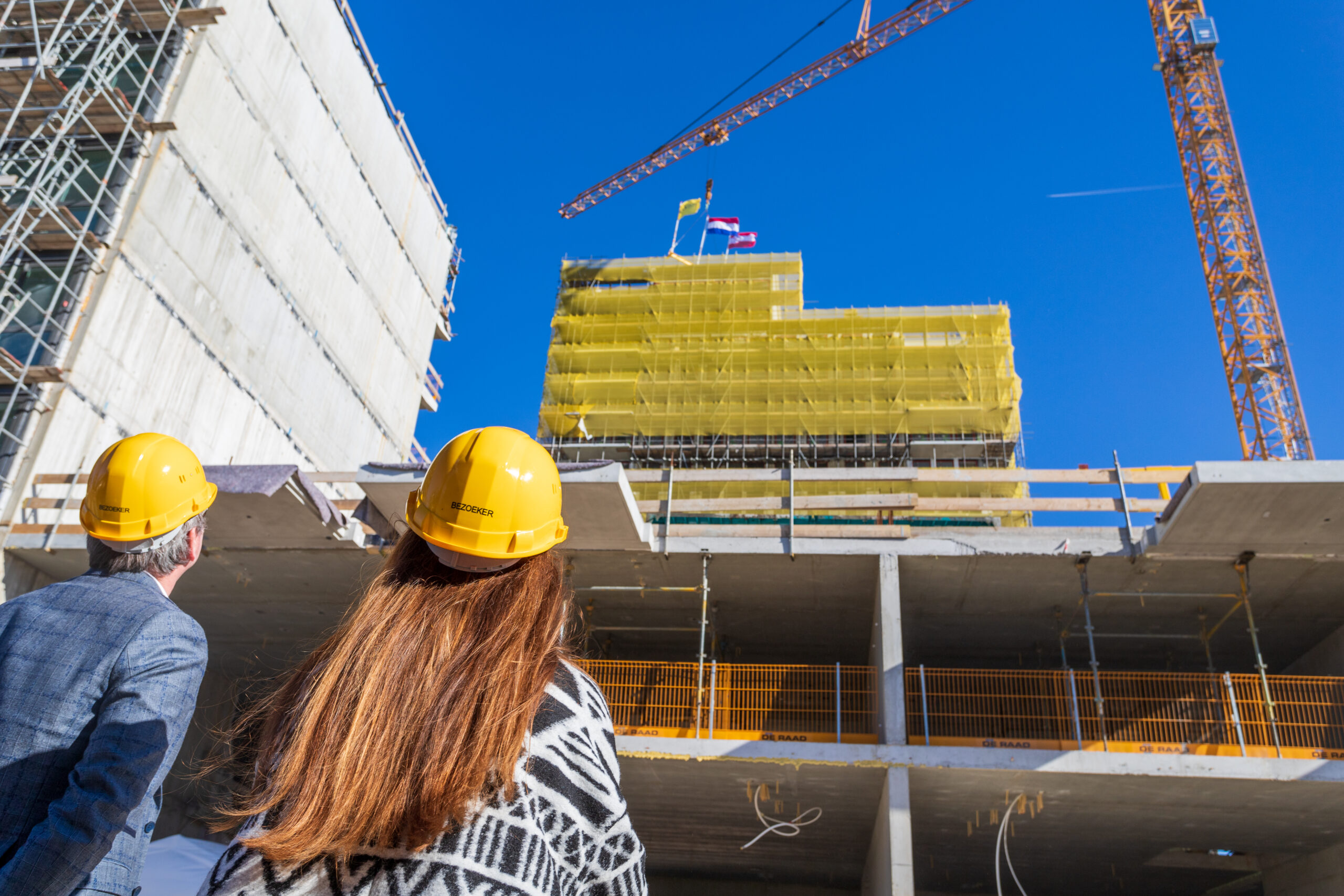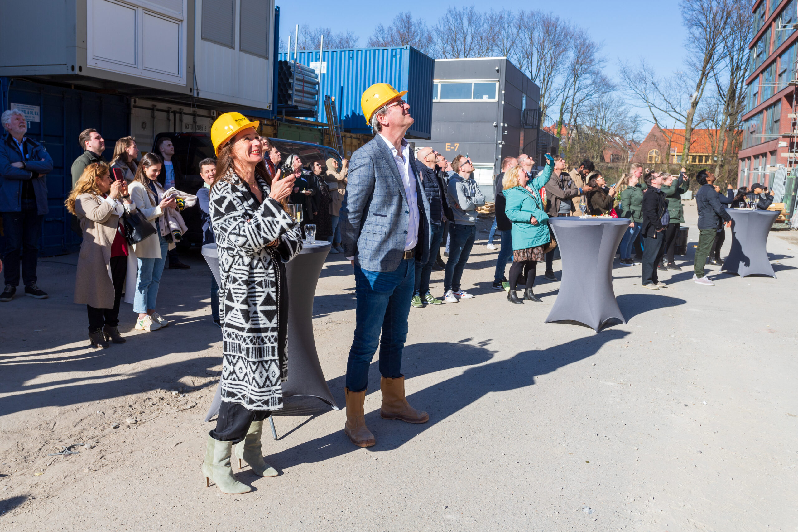 Bij het vieren van het hoogste punt waren ook de kopers van dit deel van De Ananas uitgenodigd. De hoogste toren krijgt de naam ‘Viridis’ mee. Na het plaatsen van de vlaggen mochten de toekomstige bewoners zelf ook even het dak op.