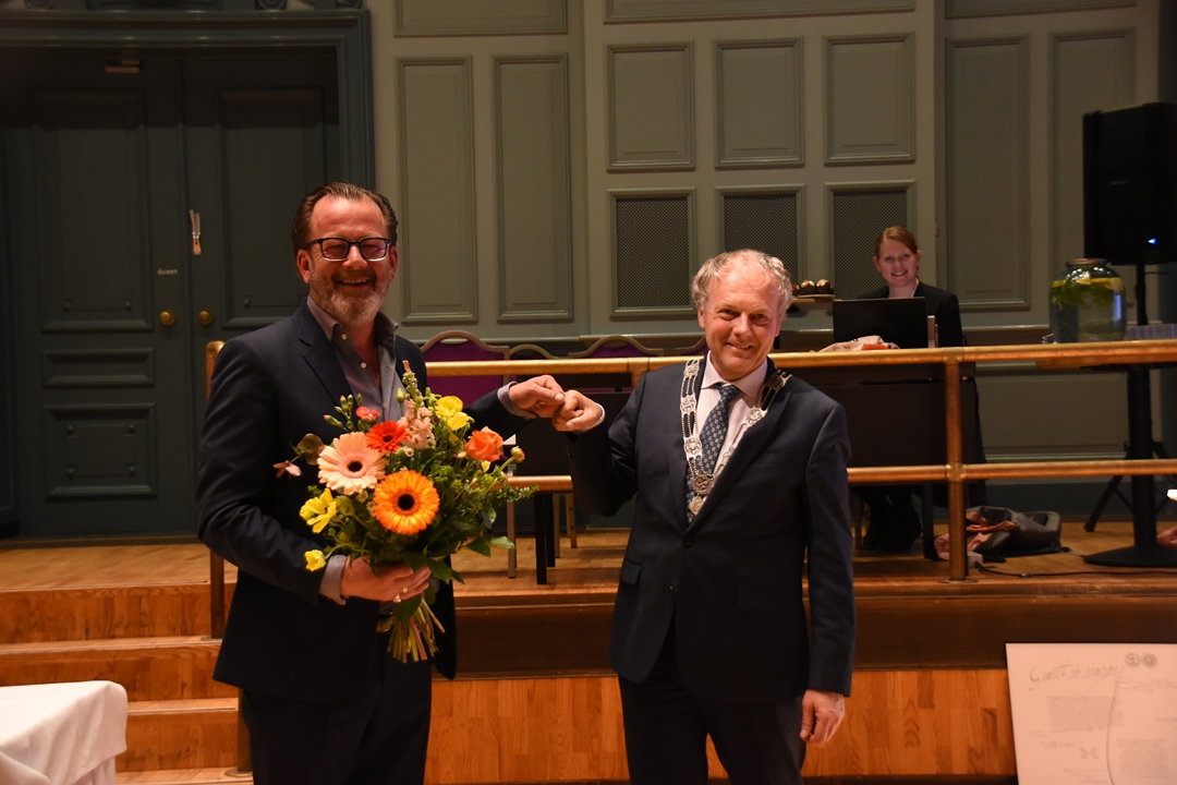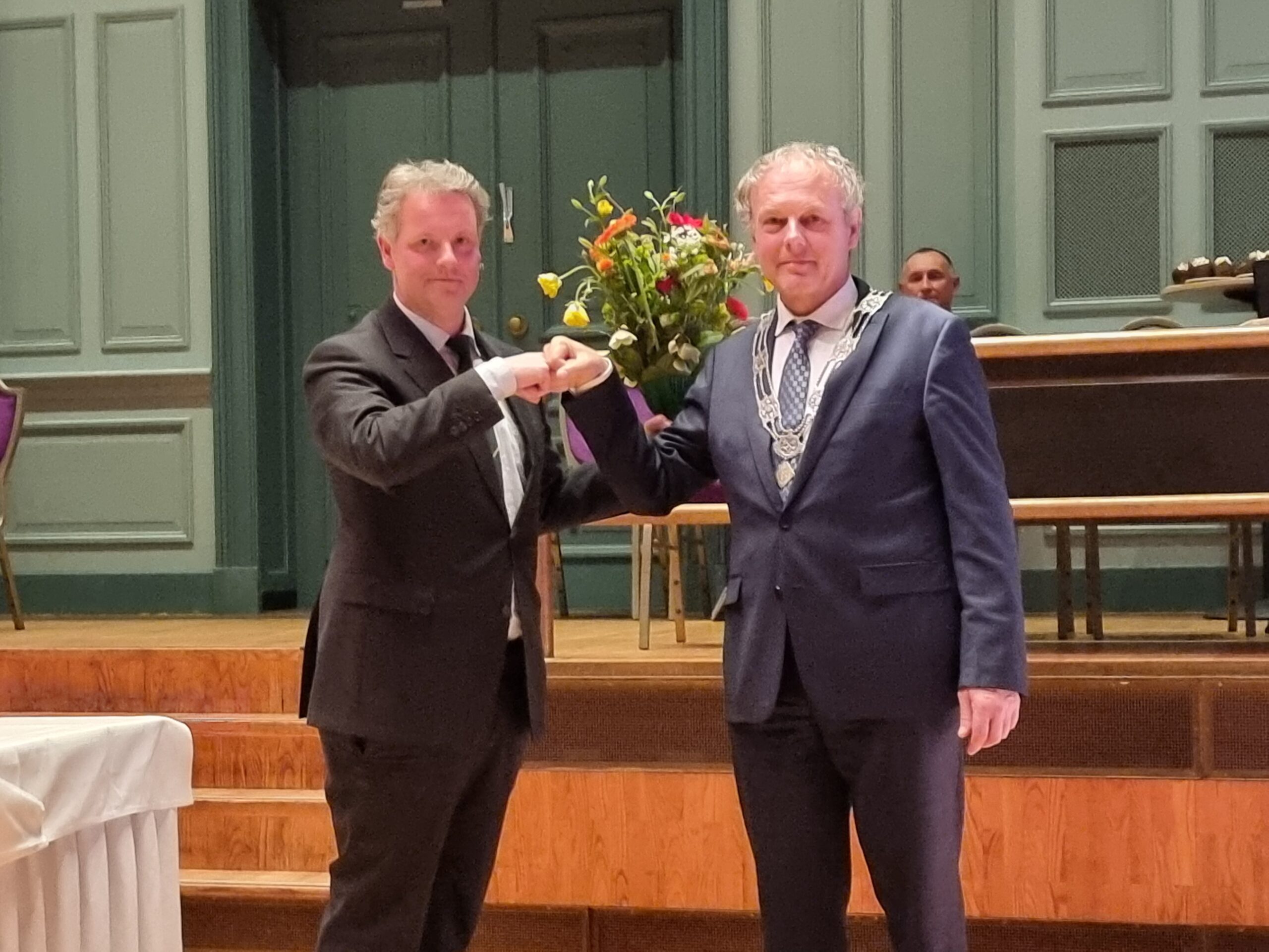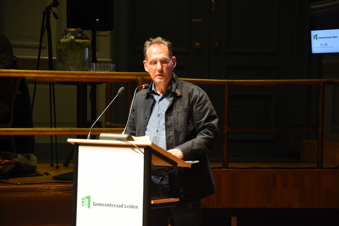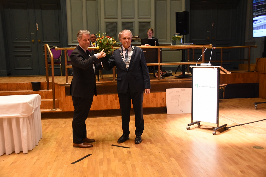 Chris de Waard in gesprek met burgemeester Lenferink over het vertrek van iets meer dan de helft van alle Leidse raadsleden.