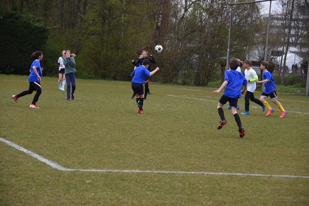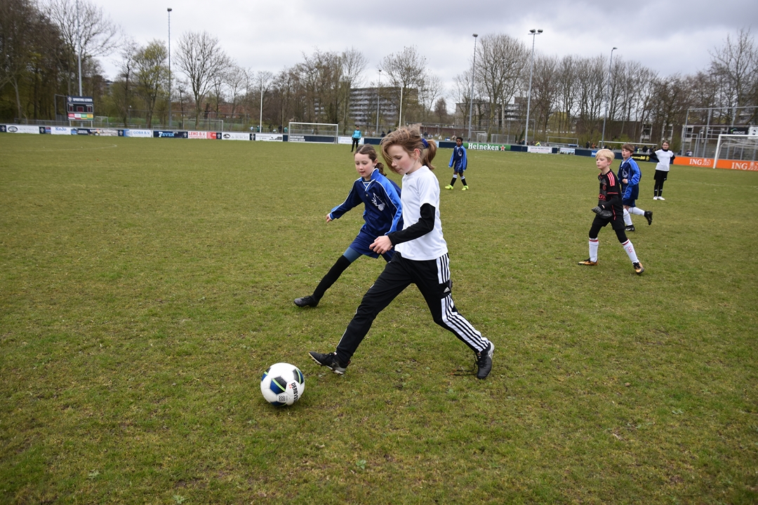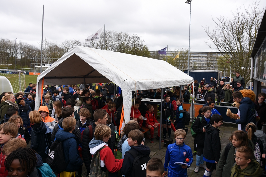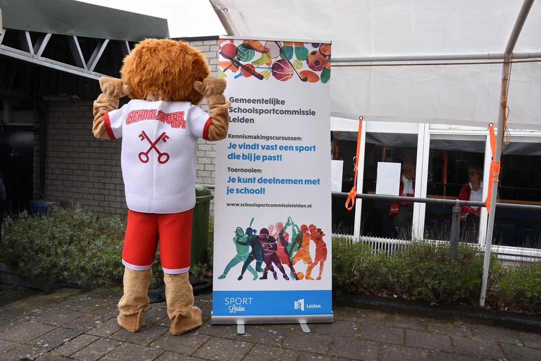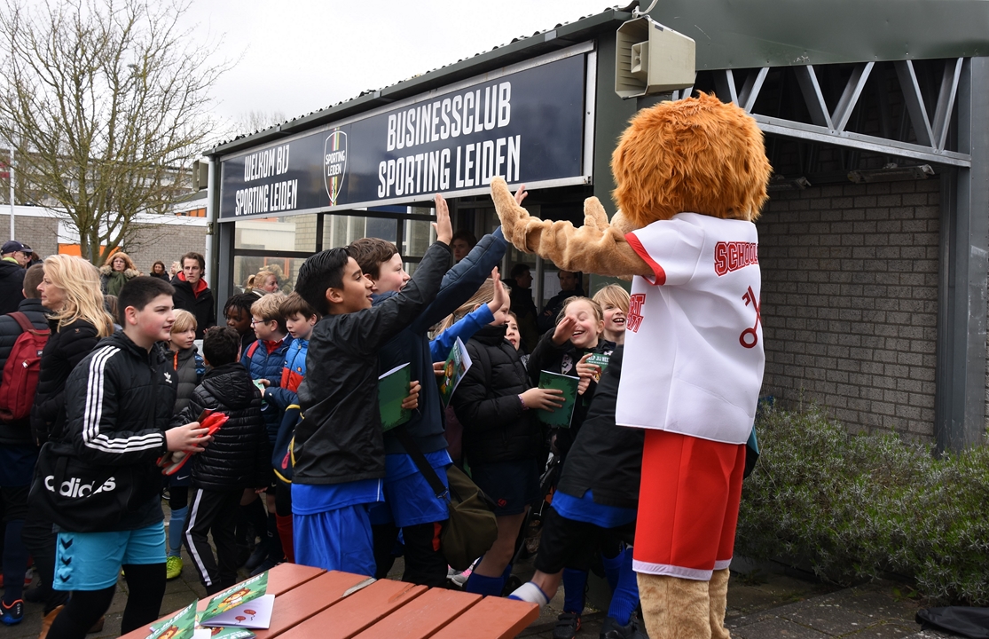 Ondanks dat de nieuwe mascotte nog geen naam heeft, wordt er fanatiek gevoetbald op het voetbaltoernooi voor de groepen 7 en 8 dat Schoolsport071 gisteren organiseerde op de velden van Sporting Leiden “Er doen 55 teams mee, van vijftien verschillende scholen”, zegt Weerlee-Feenstra. “In totaal zo’n zeshonderd leerlingen. De drie beste teams krijgen een beker en de kampioen mag naar de regiofinale.”