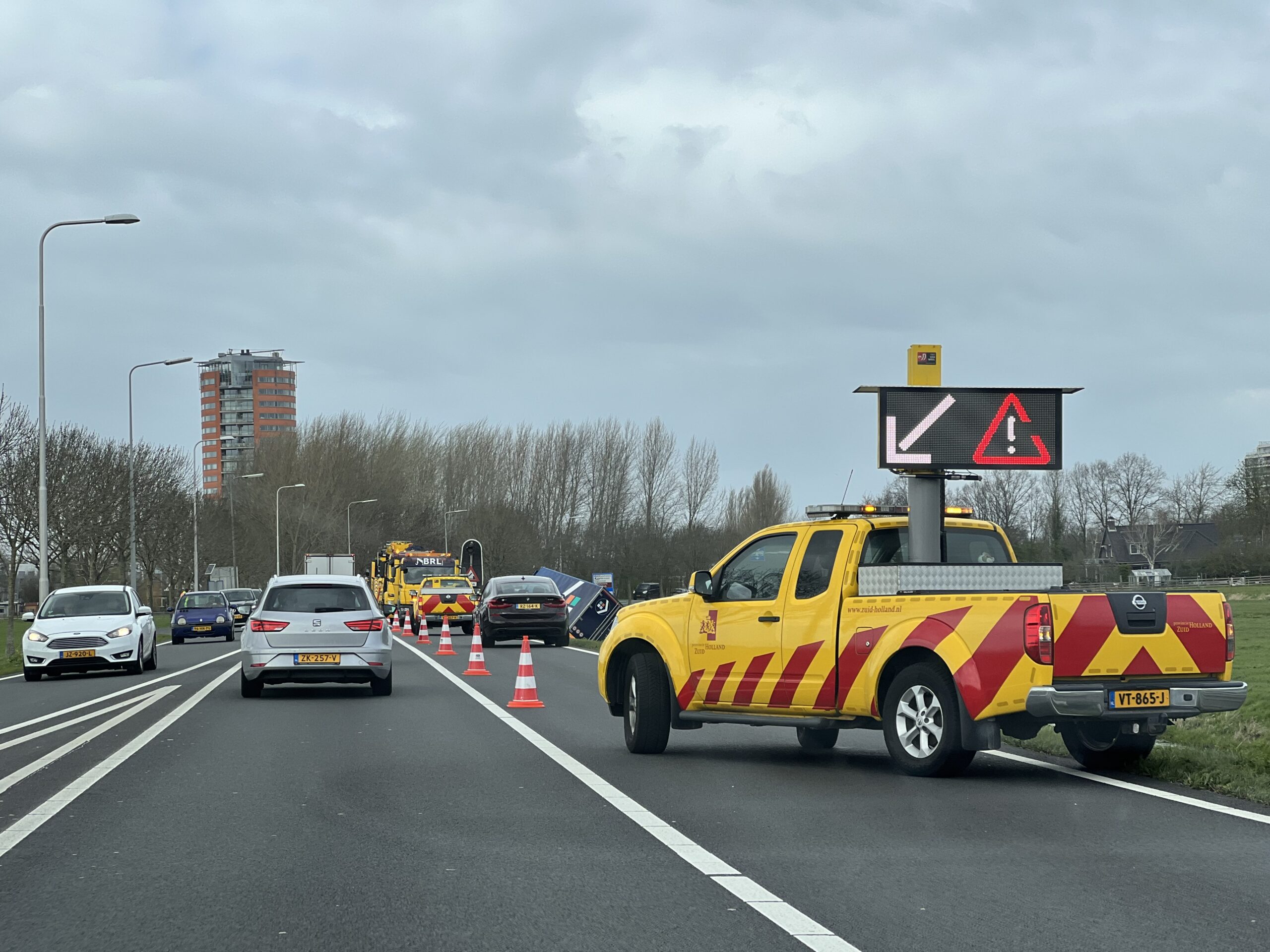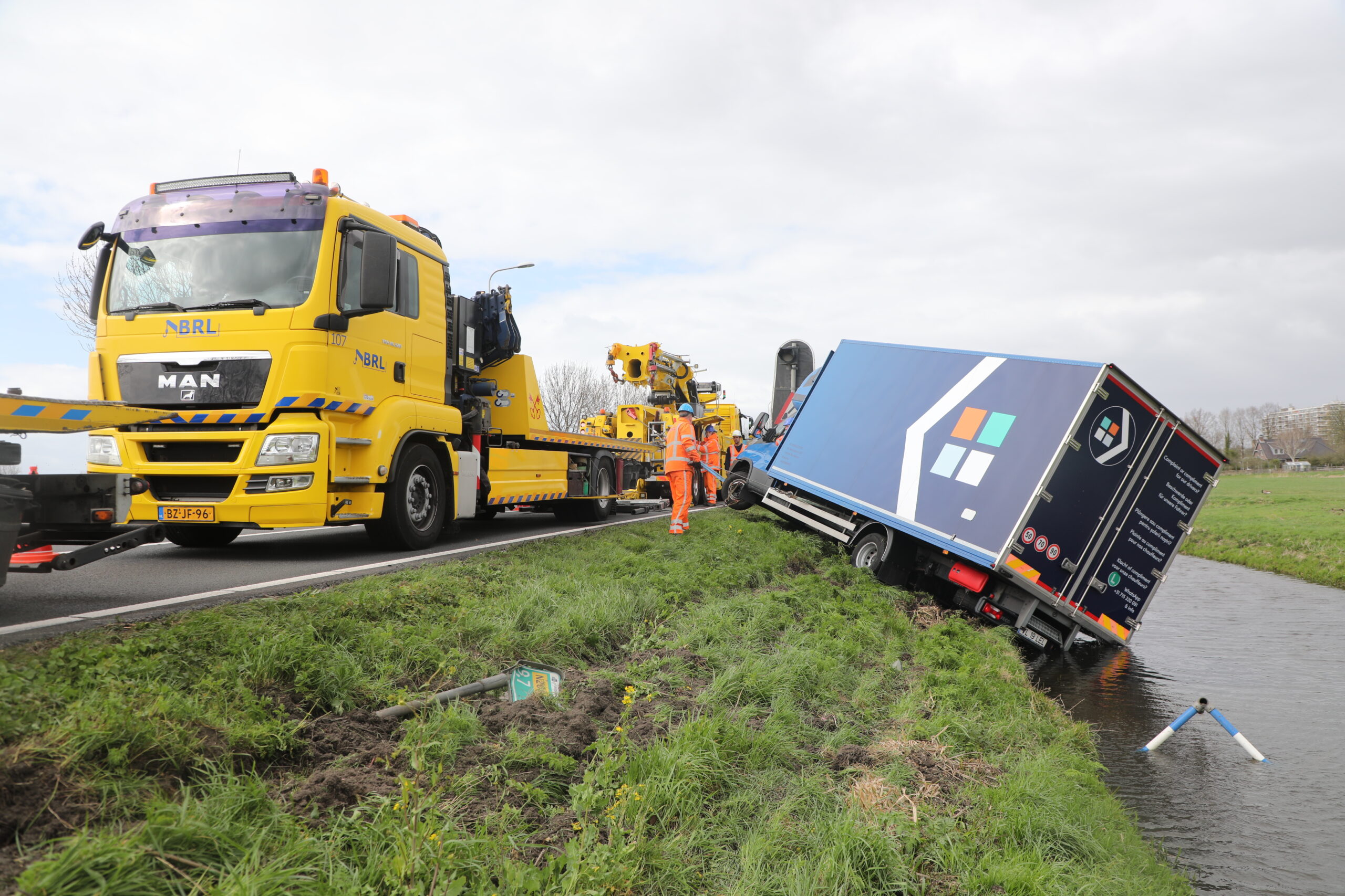 Op de Europaweg in Leiden verloor dondermiddag een vrachtwagenchauffeur de controle over het stuur. Door harde windstoten raakte zijn vrachtwagen van de weg en vervolgens in het water.