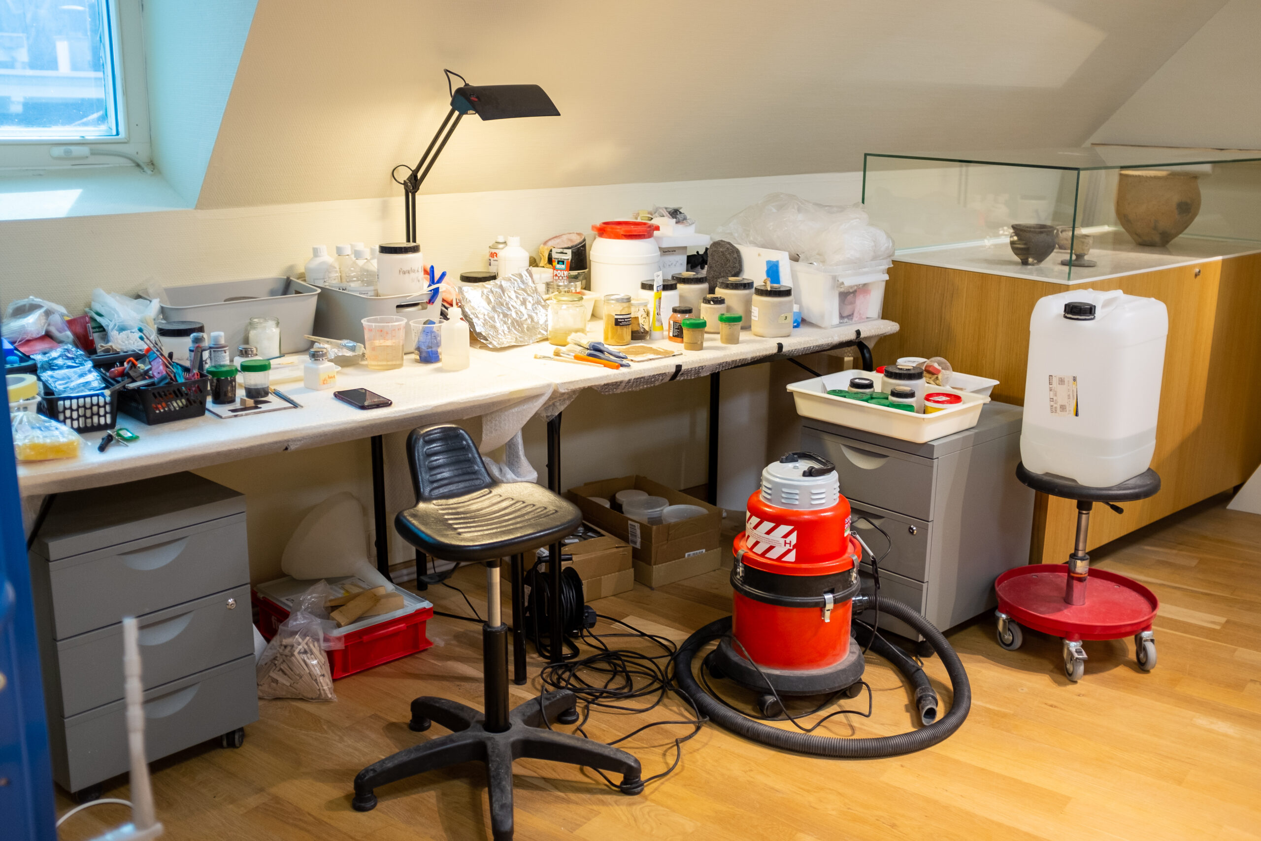 Casper Chaudron bij het Rijksmuseum van Oudheden in gesprek met restaurateur Renske Dooijer.