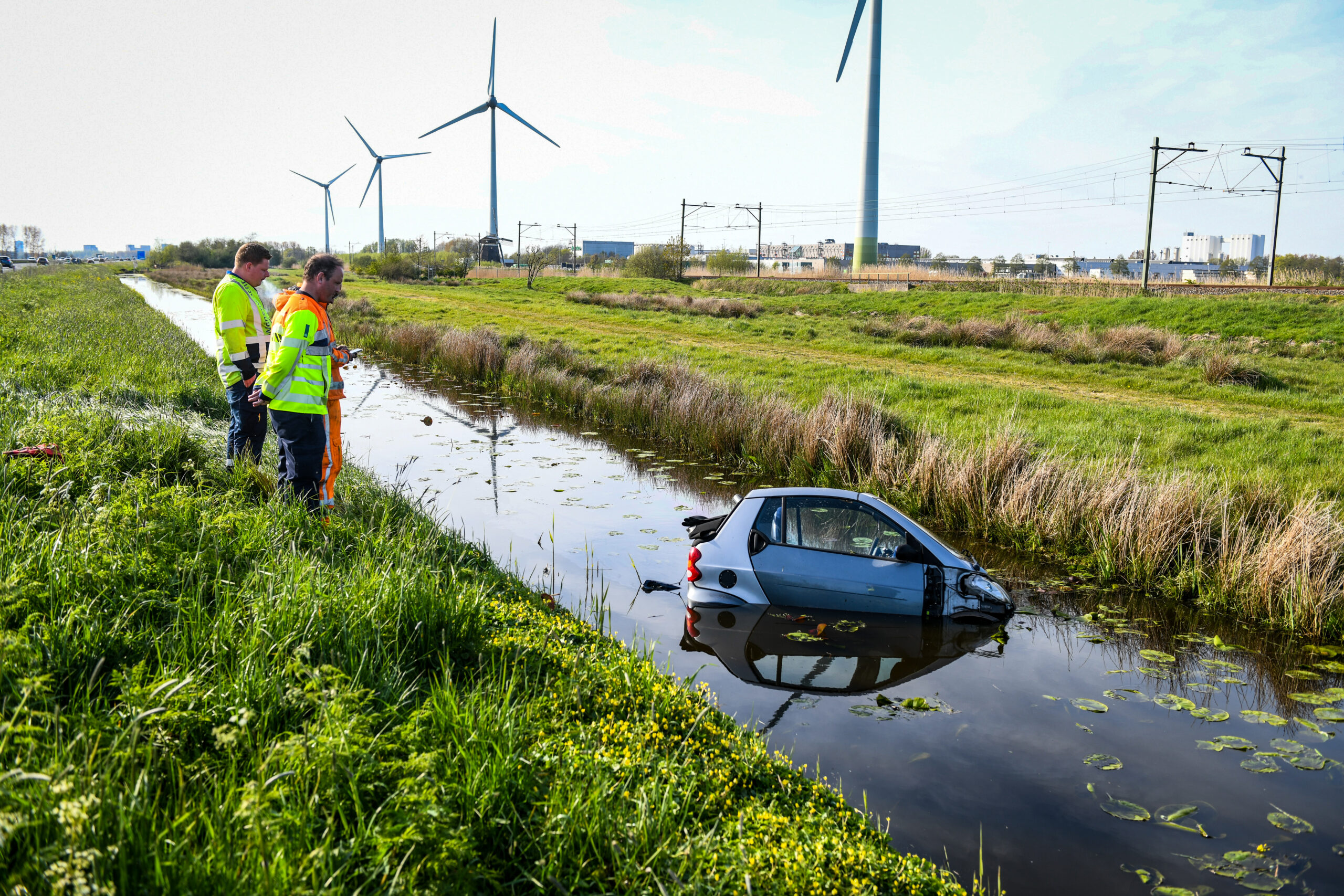 De bestuurder is eerst ter plaatste in de ambulance behandeld en vervolgens naar het ziekenhuis overgebracht. Een bergingsbedrijf takelt de auto uit het water.