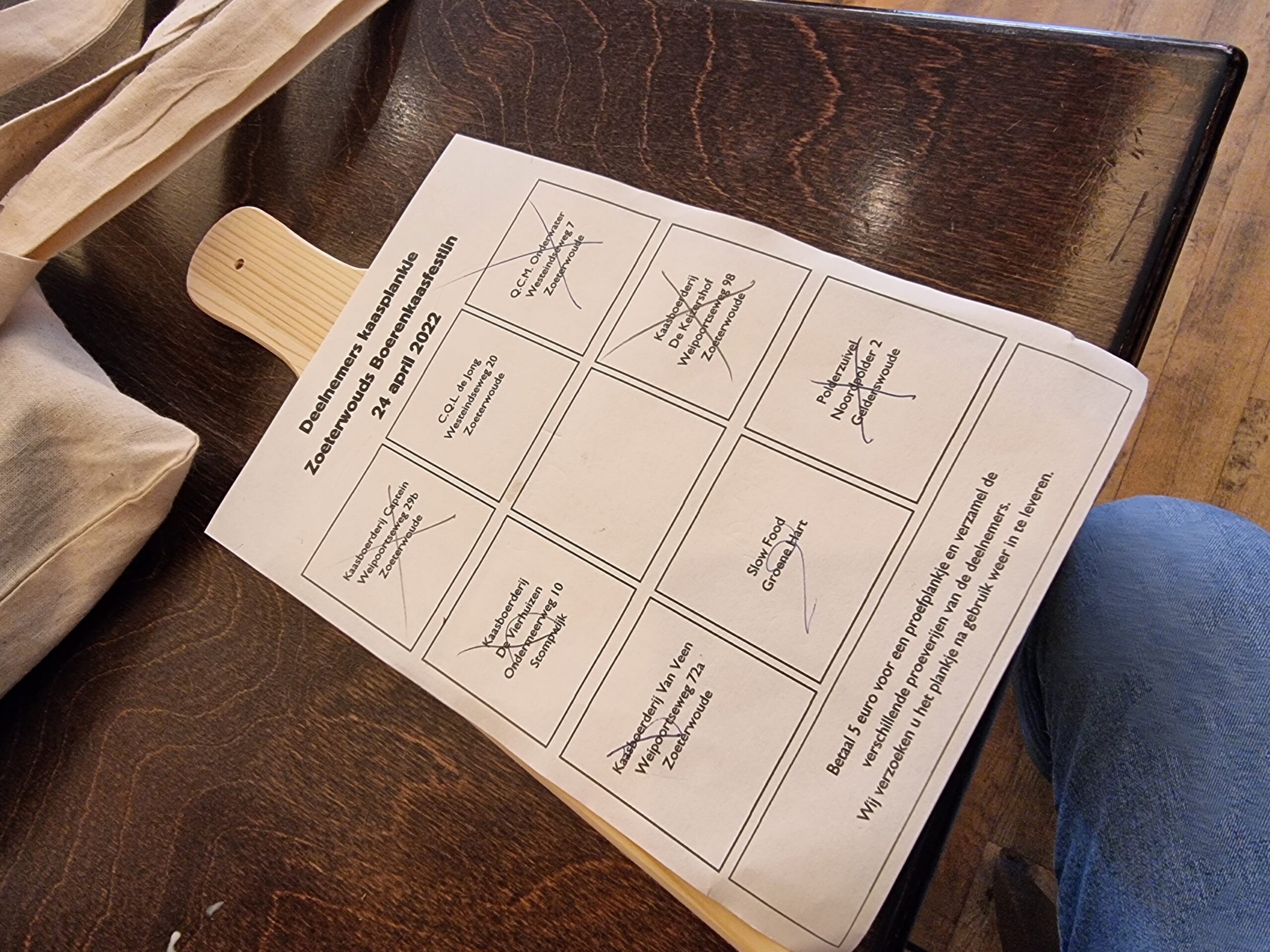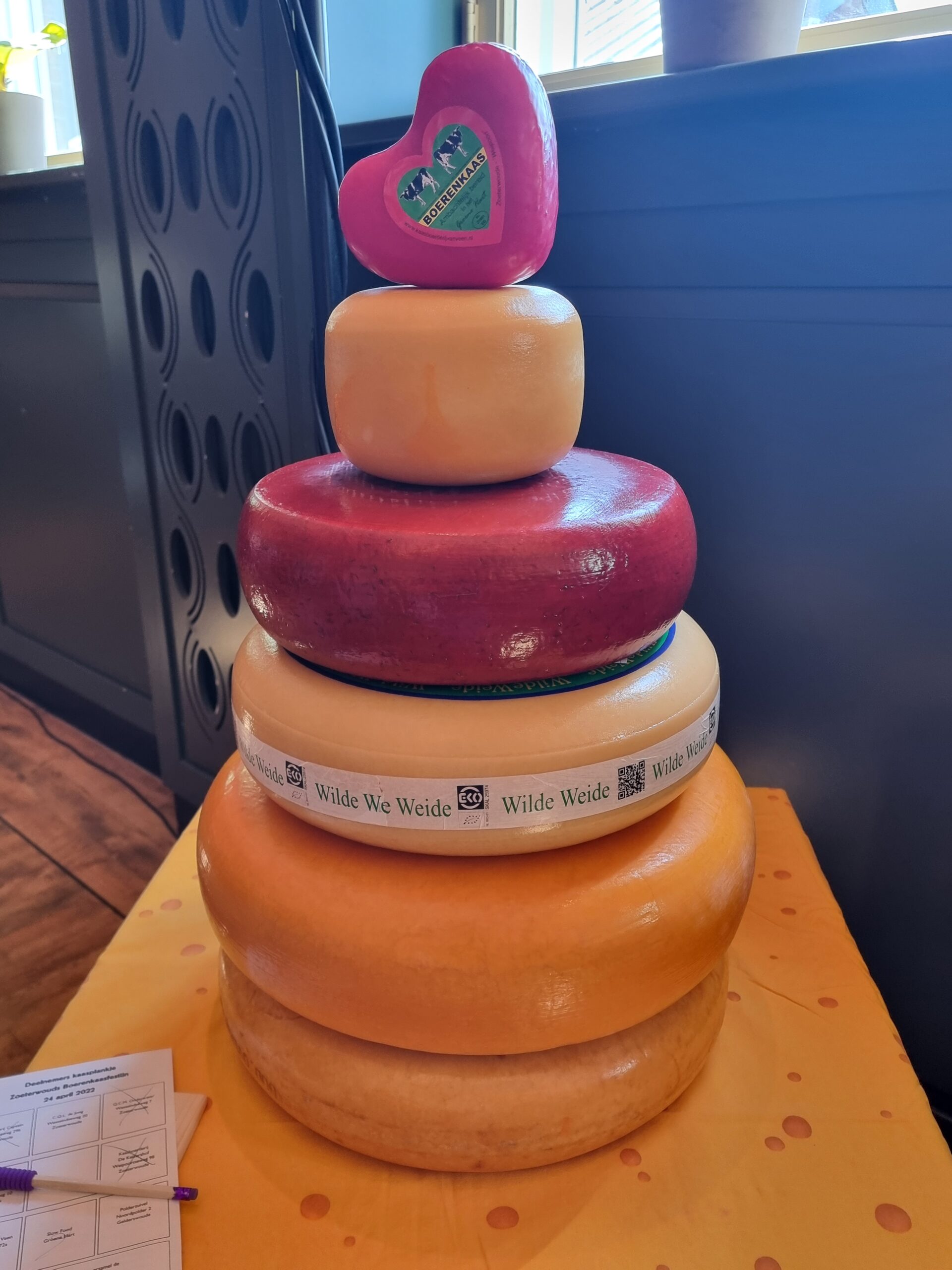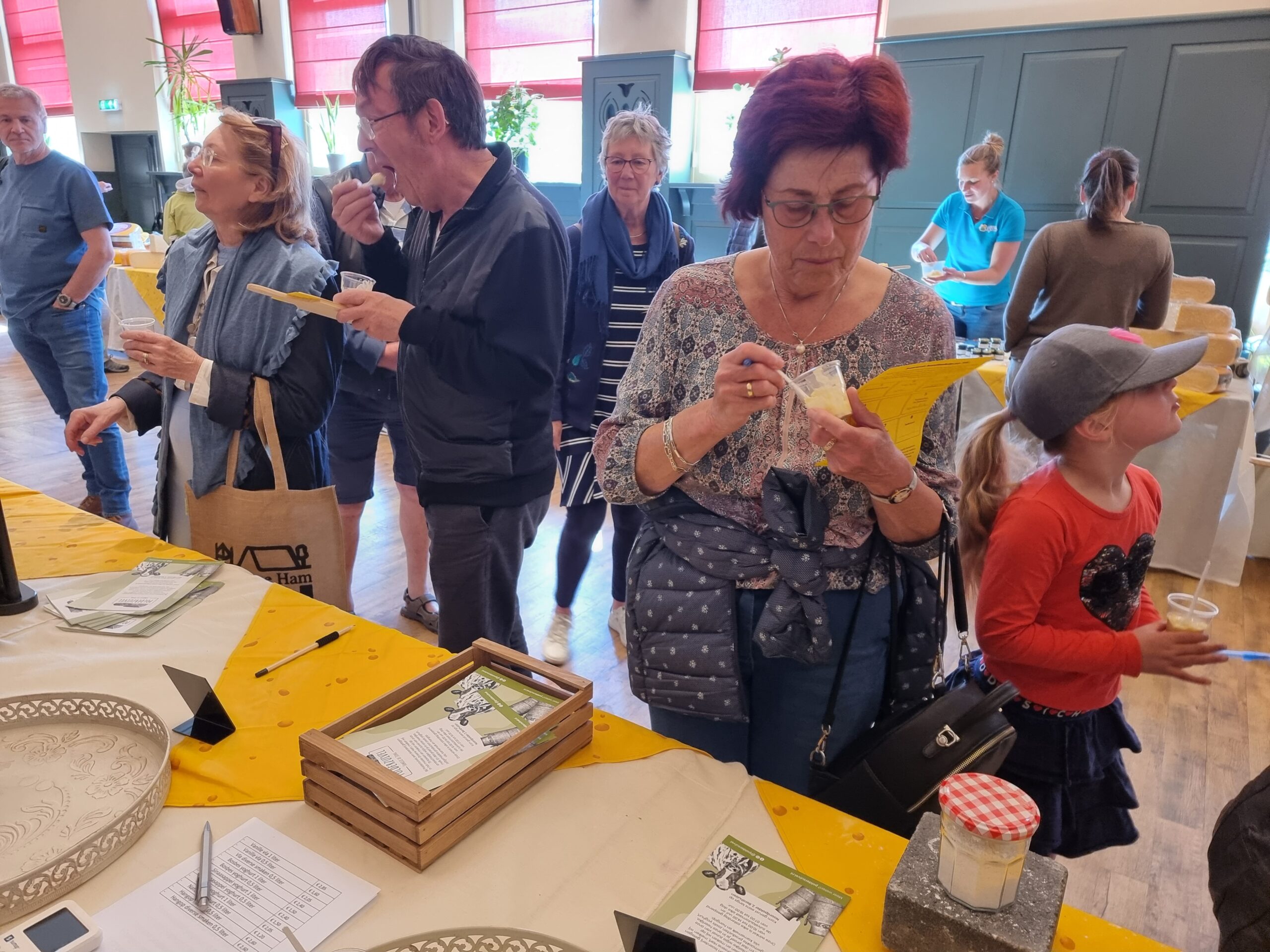 Naast proeven, kon er ook meegedaan worden aan een quiz. Alle deelnemers hadden een jampotje met onbekende inhoud staan. Een wittige vloeistof (zou het pekel zijn?), of witte bolletjes (boerenboter?). Wie de inhoud van de meeste potjes goed heeft geraden en bovendien het gewicht het meest benaderde van de stapel kazen op de laatste foto, won een prijs.