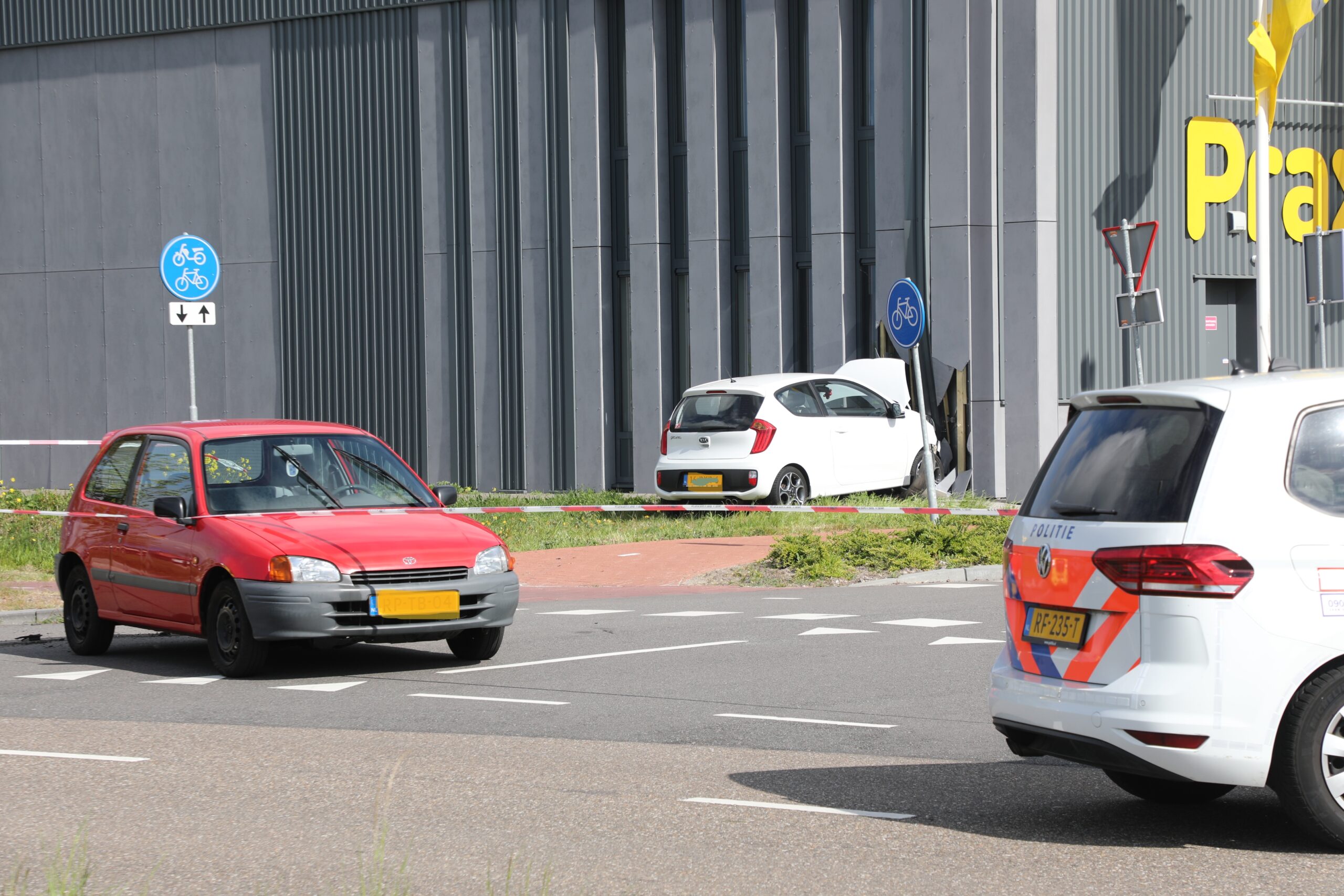 Op de kruising van de Haarlemmerstraatweg met De Boeg in Oegstgeest zijn zaterdagmiddag omstreeks 16.00 uur twee auto’s met elkaar in botsing gekomen. Een van de auto’s is hierbij doorgeschoten en hard tegen de gevel van bouwmarkt Praxis gebotst.