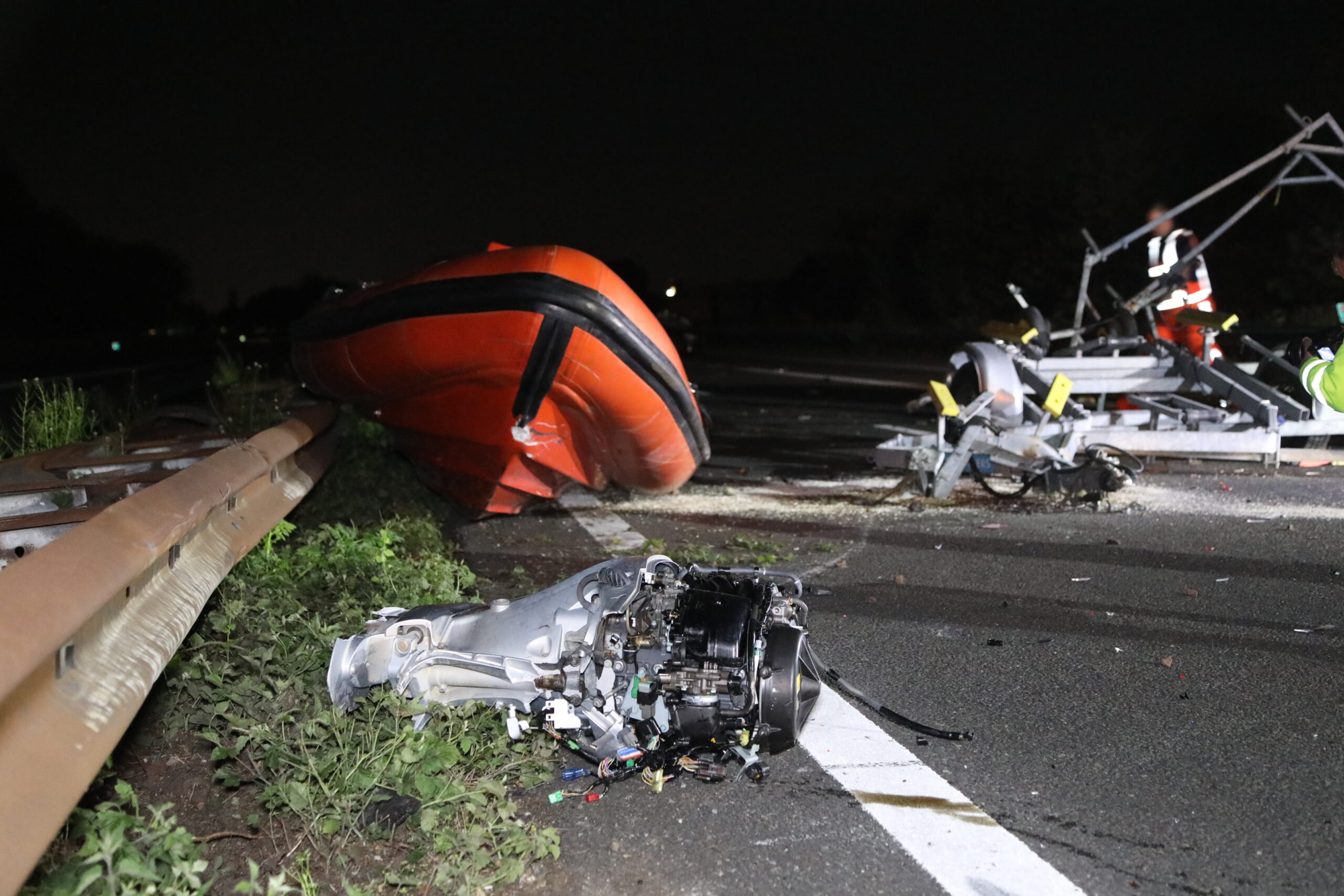 Het ongeval gebeurde rond 22.30 uur op de A44 ter hoogte van de afslag Sassenheim bij het Van der Valk hotel. Een personenauto botste op de boottrailer die achter de auto voor hem hing. Daarbij schoot de boot van de trailer. De schade aan de achterliggende auto is gigantisch, maar ook de trailer en boot raakten beschadigd.