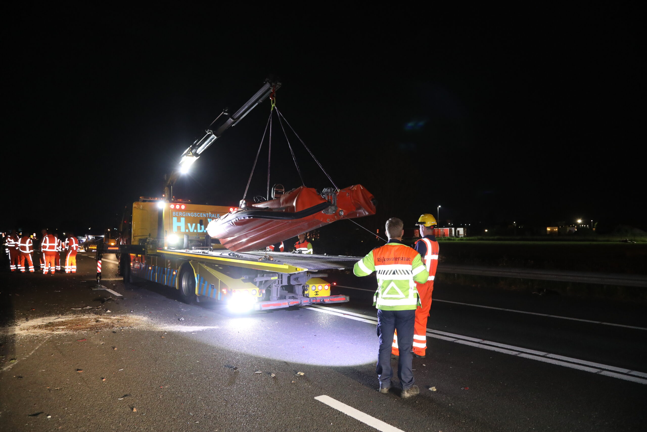 Een speedboot is maandagavond bij een aanrijding op de A44 van de trailer geschoten en op de achteropkomende auto terecht gekomen. Die auto werd daarbij grotendeels vernield. Er raakte wonder boven wonder slechts één persoon licht gewond.
