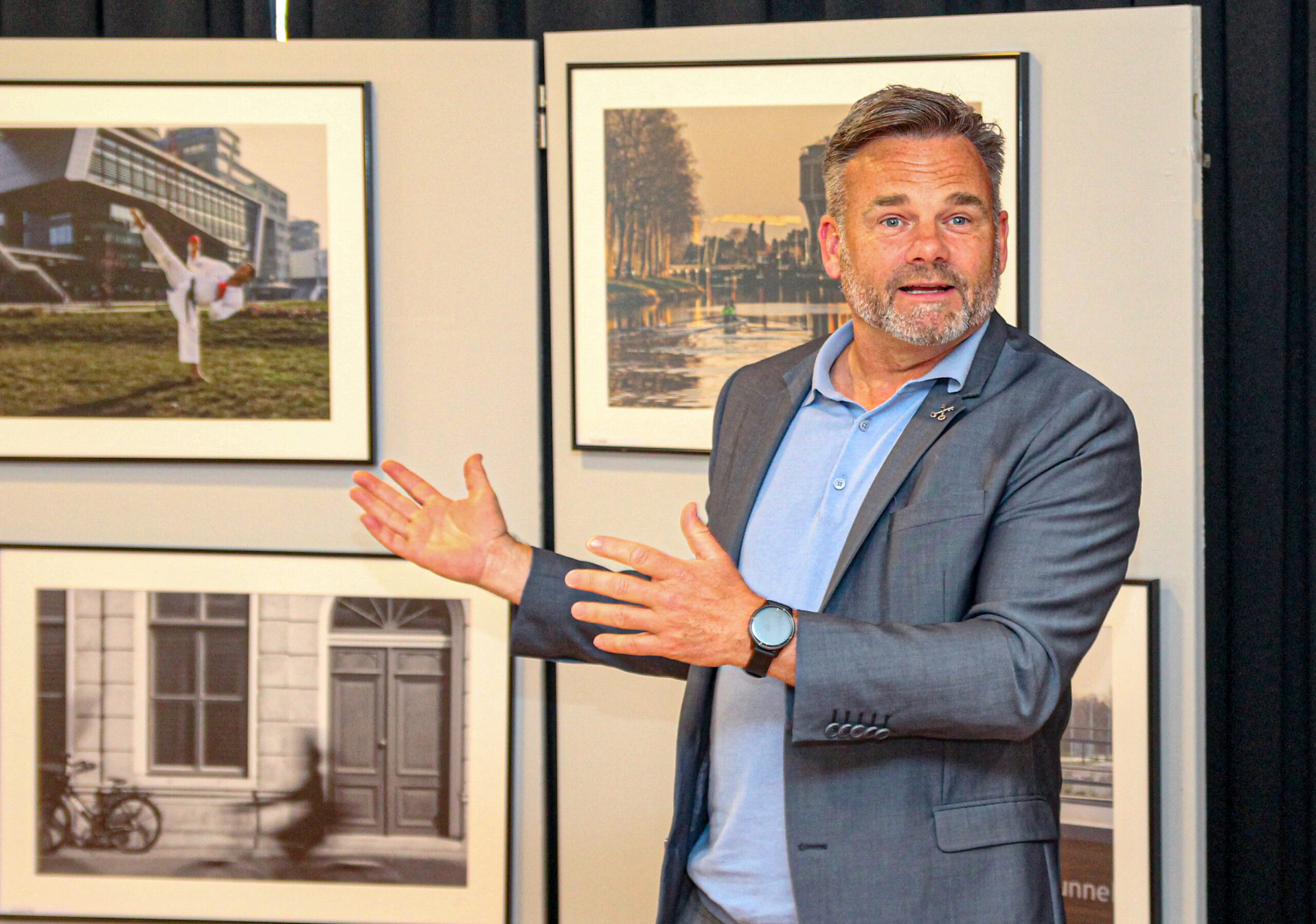 Sportwethouder Paul Dirkse opende vrijdag de fototentoonstelling: ‘Bewegen in Leiden’. Tien fotografen van de foto+ groep van Rob Beurse gingen met dit thema aan de slag. Hun beste foto’s zijn de komende twee maanden te zien in de hal van Brede School De Arcade.