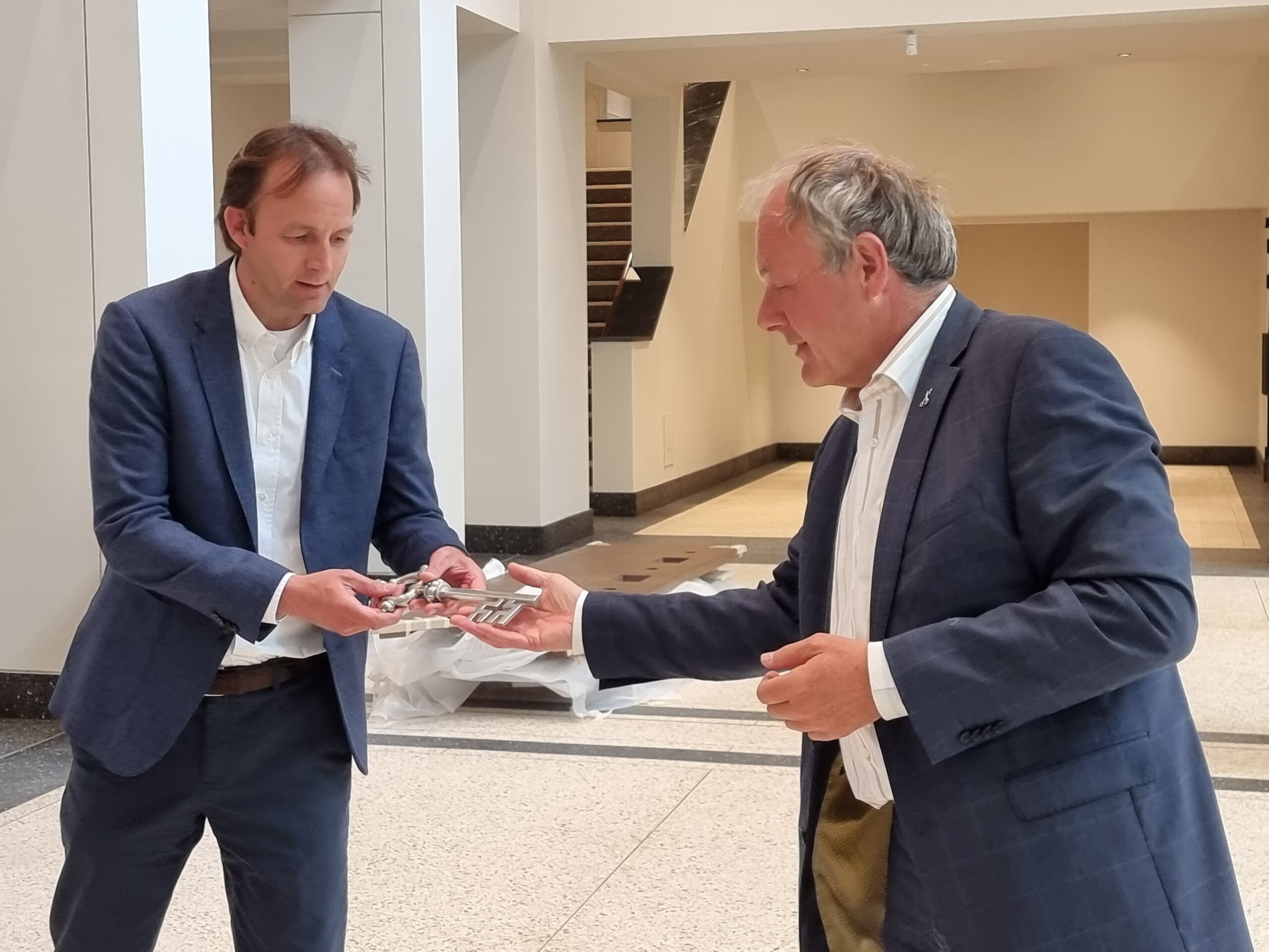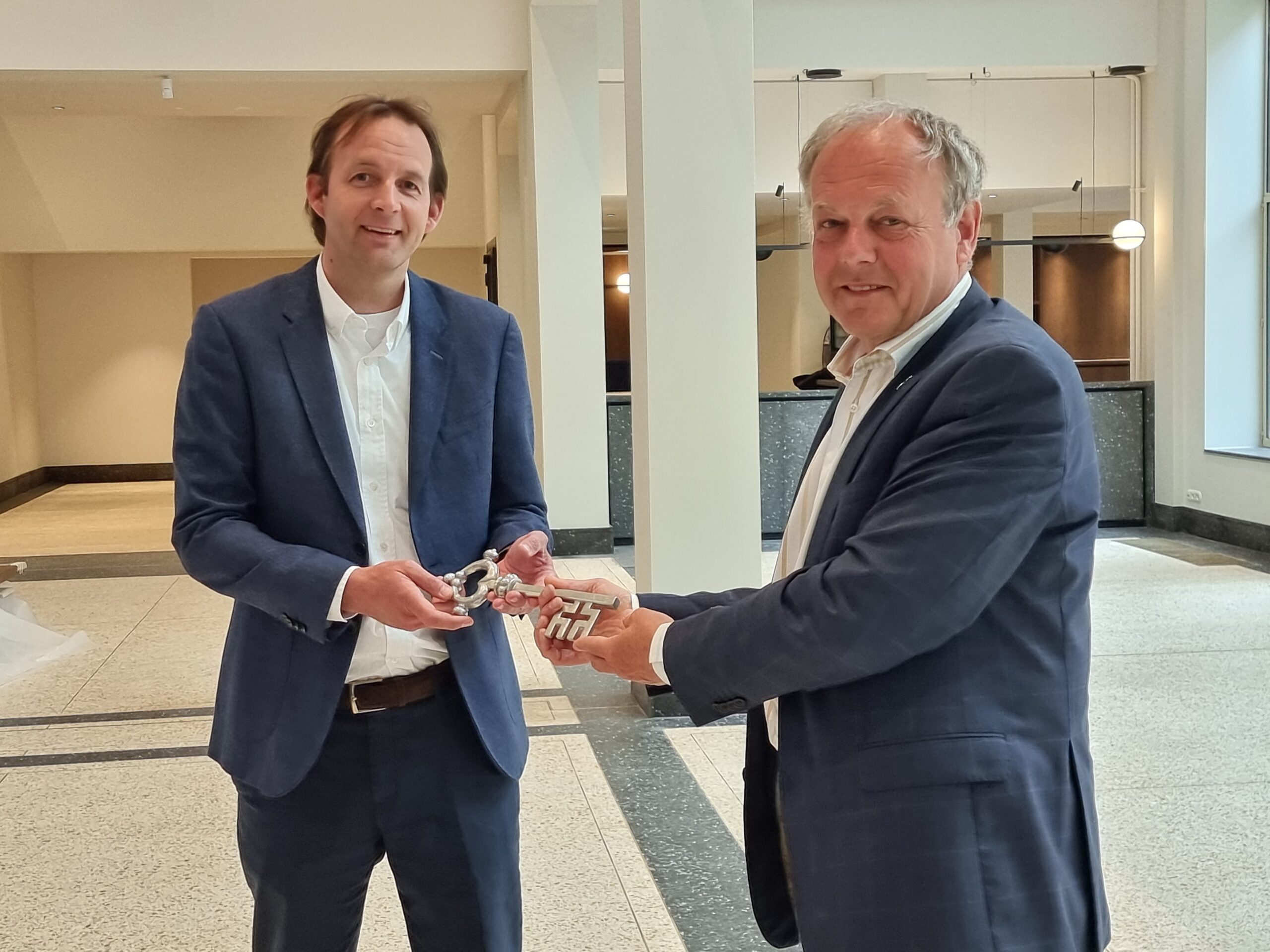 Met het symbolisch overhandigen van een enorme sleutel aan burgemeester Lenferink is dinsdagmiddag het stadhuis ’teruggegeven’ aan de stad. De verbouwing is klaar en het meningsverschil tussen de gemeente en aannemersbedrijf Du Prie is opgelost. Vanaf begin juli wordt het stadhuis weer deels in gebruik genomen.