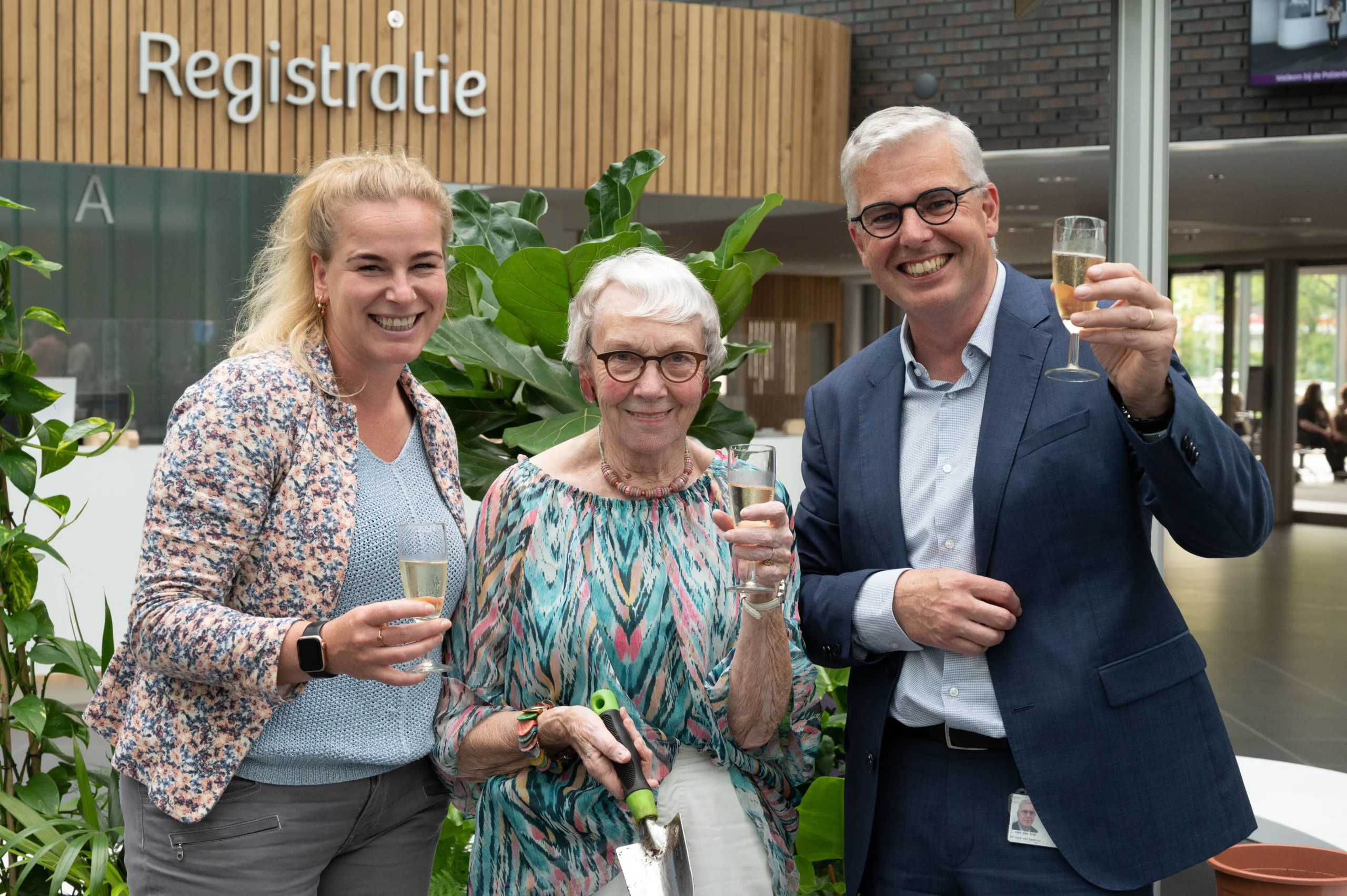 Het Alrijne ziekenhuis in Leiderdorp heeft na een verbouwing van 18 maanden een compleet nieuwe centrale hal. Vlak voor de officiële opening legden lid van de cliëntenraad Kelly den Oudsten en patiënt mevrouw Langhout-Niessing de laatste hand aan de verbouwing door nog een laatste plantje in de grond te planten. Locoburgemeester Herman Romeijn en Alrijne-bestuurder Ivo van der Klei zagen dat het goed was en spraken de aanwezigen toe.