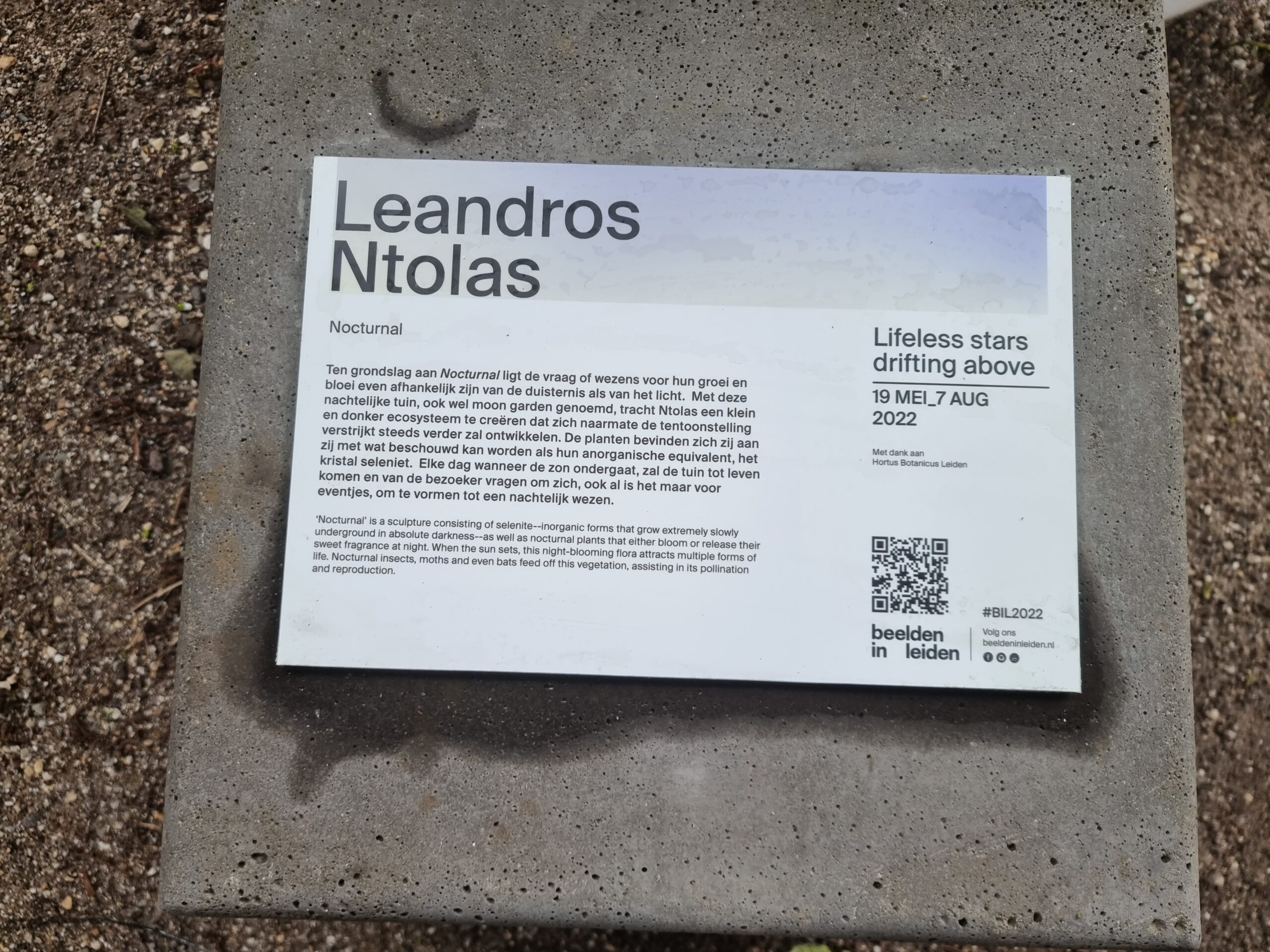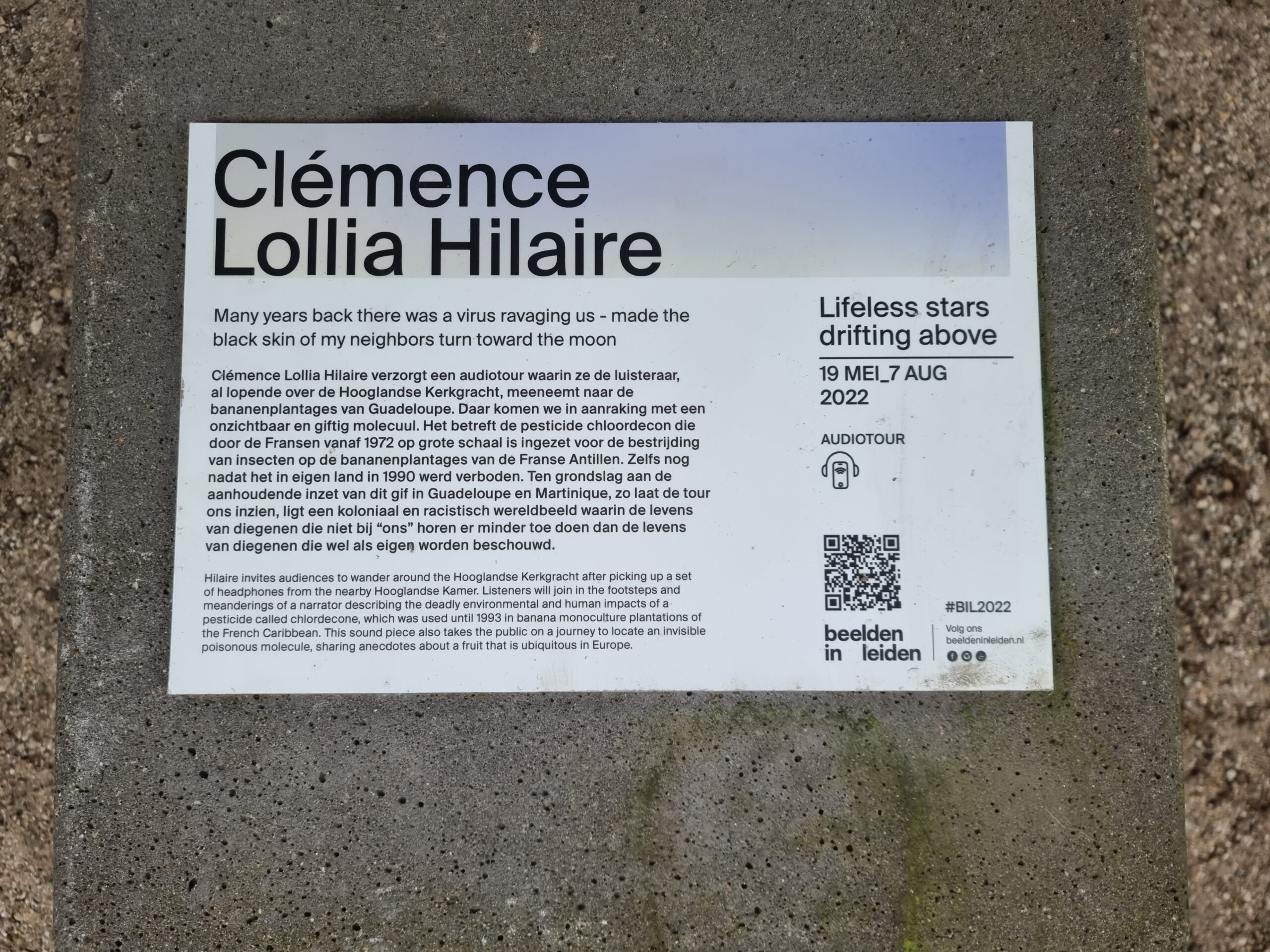 De Griekse kunstenaar Leandros Ntolas legde een nachttuin aan op de Hooglandse Kerkgracht. Nocturnal heet de ‘maantuin’ met daarin uitsluitend planten en bloemen die bloeien en geur afgeven als het duister intreedt. Het vijfde kunstwerk is gemaakt door Clémence Lollia Hilaire. Het is een audiotour over de gracht over de bananenplantages van Guadeloupe. Inclusief het verhaal over het giftige molecuul chloordecon. Een pesticide dat door de Fransen veelvuldig werd ingezet op de plantages. Veel inwoners beschouwen het als een middel om de bevolking te onderwerpen. Een duistere kant van de plantages dus.