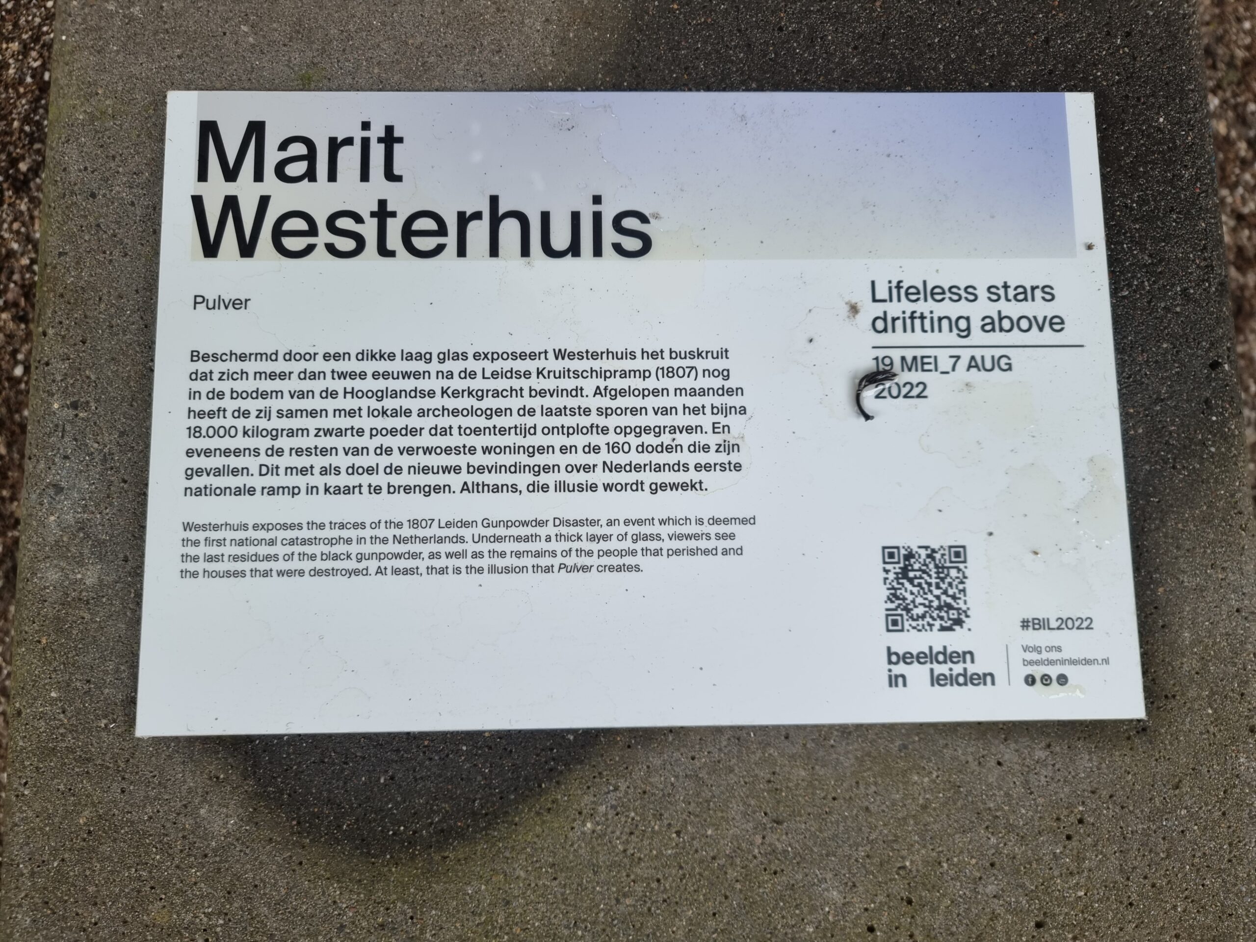 Marit Westerhuis werd door de jury onder leiding van professor ingenieur Rob Zwijnenberg geselecteerd voor de Frans de Witprijs. Haar kunstwerk is een ‘fictieve archeologische opgraving’ die is gebaseerd op de Leidse Kruitschipramp die in 1807 de bebouwing van het tegenwoordige Van der Werfpark wegvaagde.