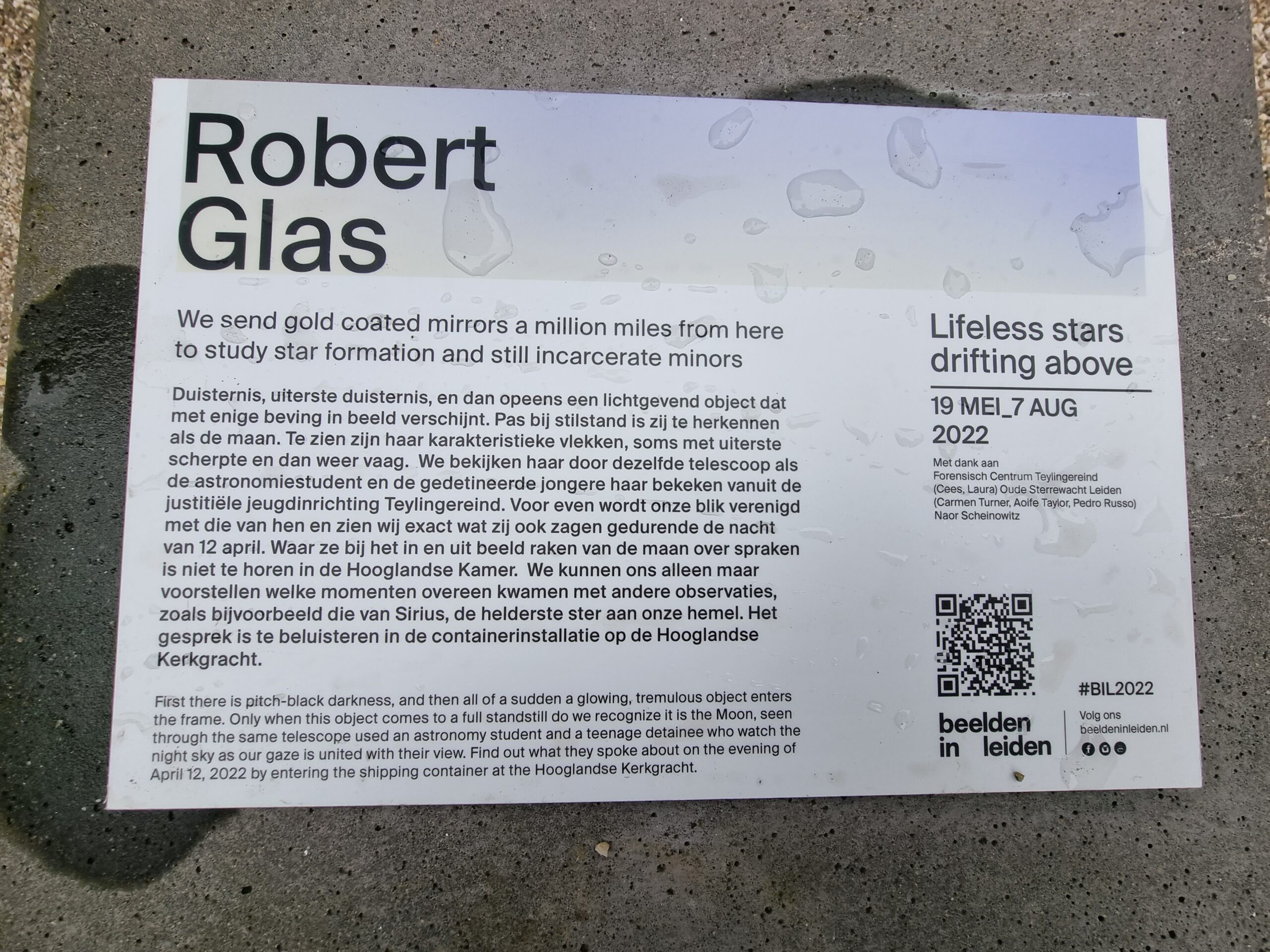 In totaal staan er vijf kunstwerken op de Hooglandse Kerkgracht. Robert Glas plaatste een blauwe container waarin via speakers een gesprek is te horen van twee jonge mensen die om de beurt door een telescoop de hemel afspeuren. De ene studeert astronomie, de ander stelt vooral vragen. De ene is bovendien gedetineerd in jeugdinrichting Teylingereind, de andere leeft in vrijheid. De gesprekken zijn opgenomen in de jeugdgevangenis.