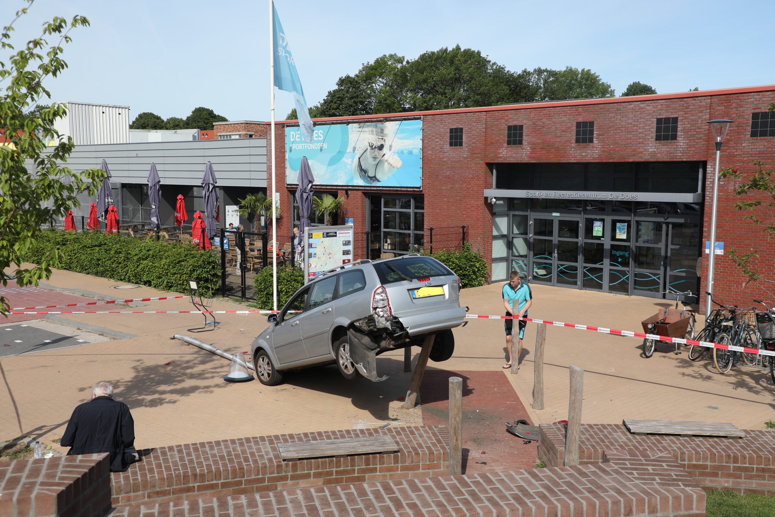 Een personenauto is vanmorgen bovenop een paal tot stilstand gekomen. De bestuurder, een oudere man, wilde vermoedelijk inparkeren maar trapte op het gaspedaal in plaats van zijn rempedaal. Via een lantarenpaal belandde hij op de meter hoge paal van een kinderspeelplaats. Het bizarre tafereel gebeurde voor zwembad De Does aan het Amaliaplein in Leiderdorp.
