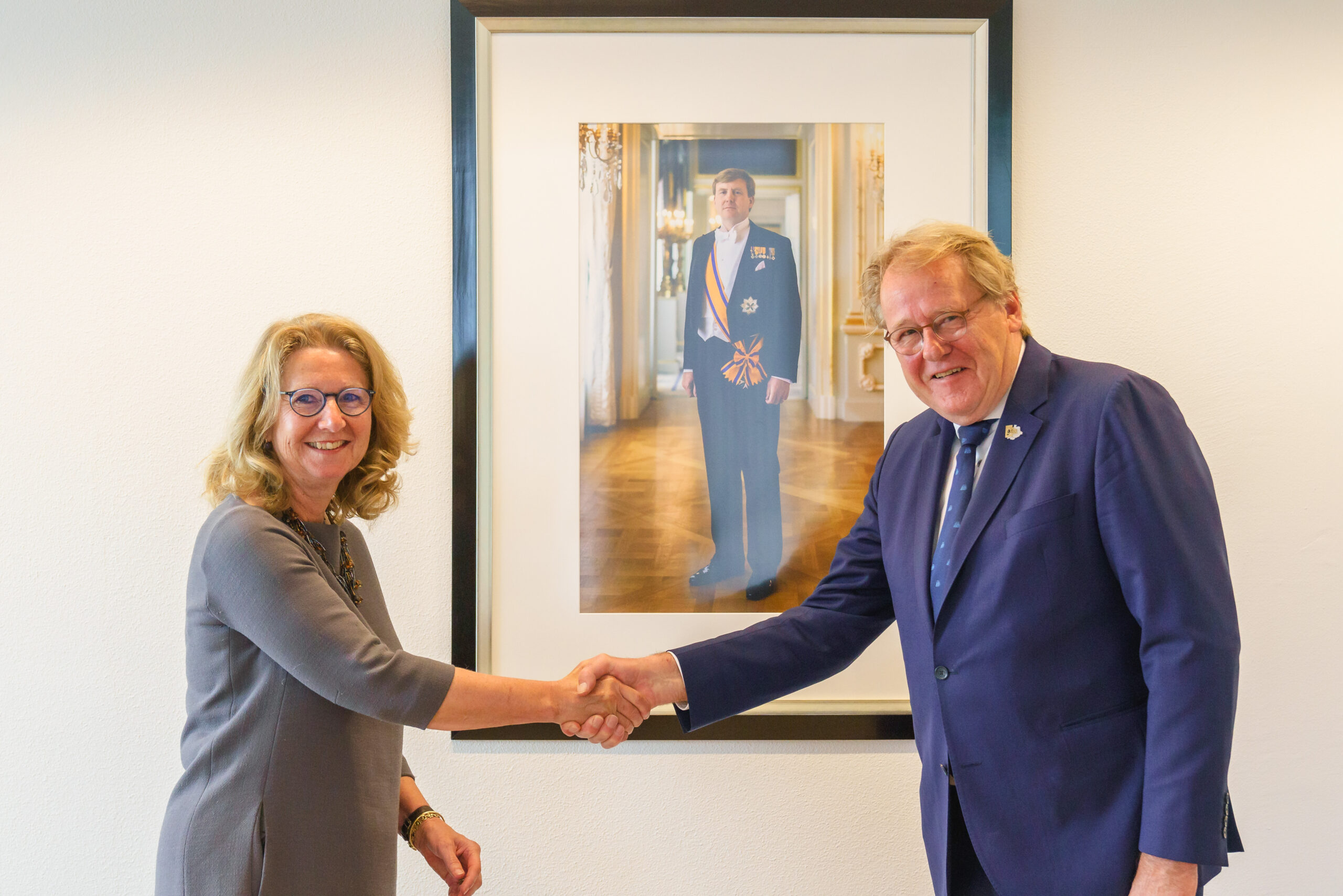 Commissaris van de Koning in Zuid-Holland, Jaap Smit, feliciteert Pauline Bouvy-Koene met haar waarnemend burgemeesterschap van de gemeente Krimpenerwaard.