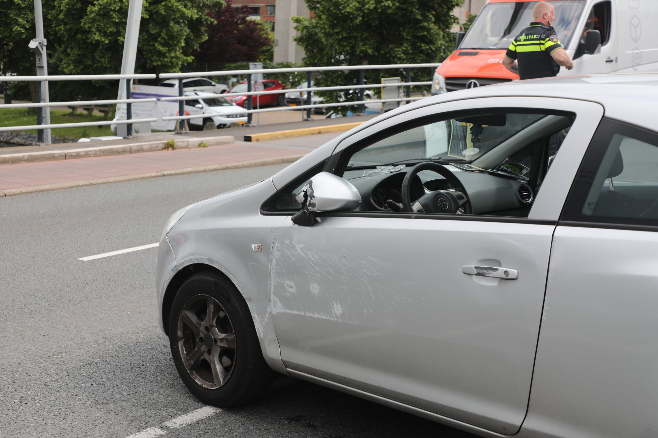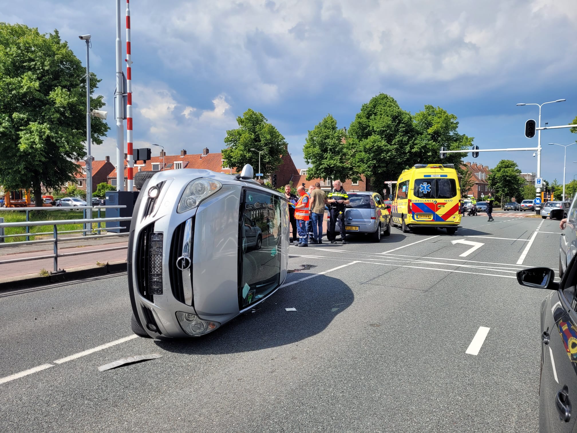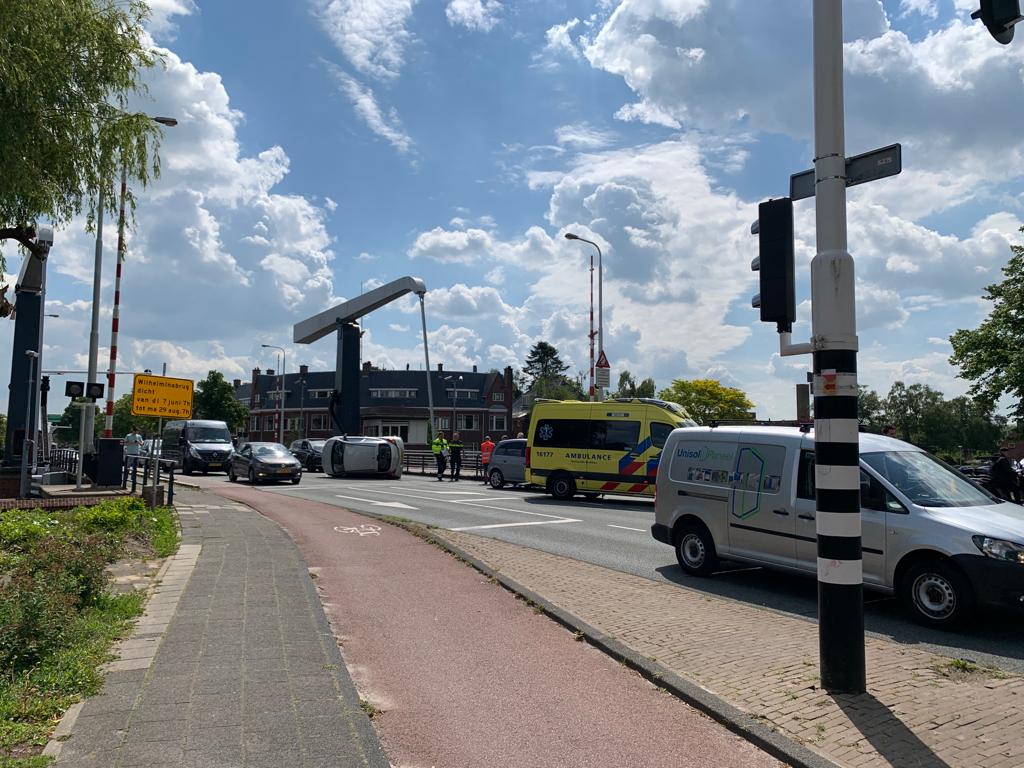 Een automobilist die dinsdagochtend vanaf de Kanaalweg rechtsaf de Wilhelminabrug op wilde rijden, verloor daarbij de macht over het stuur, knalde tegen het hek van de brug en kwam op z’n zijkant tot stilstand. De bestuurder bleef ongedeerd.