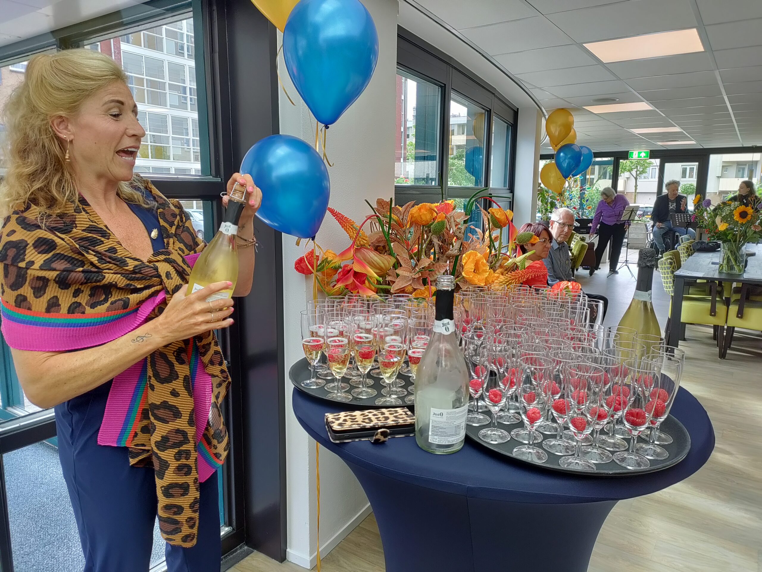 Bewoonsters Corry en Wil zullen niet alles hebben meegekregen van de boodschap van De Jongh. Aan mij vroeg Wil: “Wie heeft nu dat mooie schilderij gemaakt?” Maar beide dames genoten zichtbaar van de aandacht en het feestje. Ze voelden zich duidelijk op hun gemak. Topaz viert de opening van de nieuwe ontvangstruimte groots. In meerdere feestelijke sessies worden zo´n vijfhonderd gasten verwacht in Zuydtwijck, waaronder vrijwilligers, mantelzorgers en familieleden.