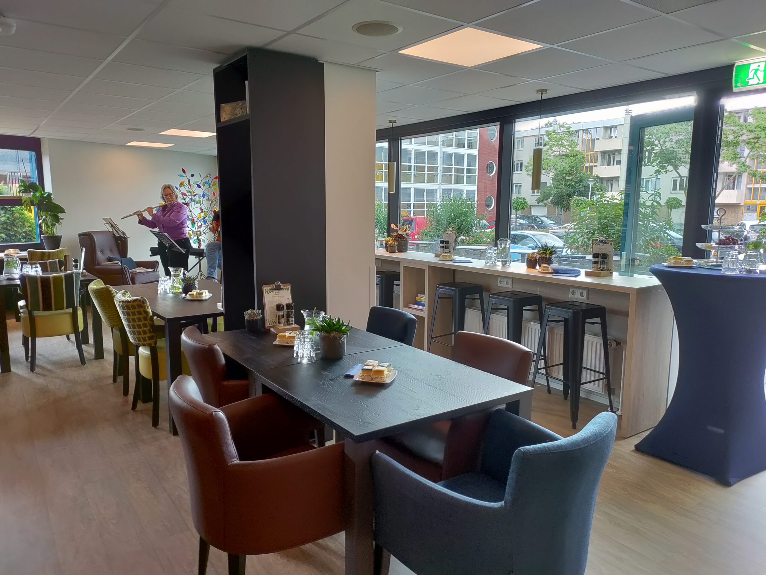 Het ‘ouderwetse’ restaurant van Topaz Zuydtwijck in Leiden Zuidwest heeft plaatsgemaakt voor een ontvangstruimte waar ook wijkbewoners welkom zijn. De plek moet de bewoners van het verpleeghuis de mogelijkheid bieden om op een ontspannen manier contact te maken met familie, vrienden en mensen uit de buurt.