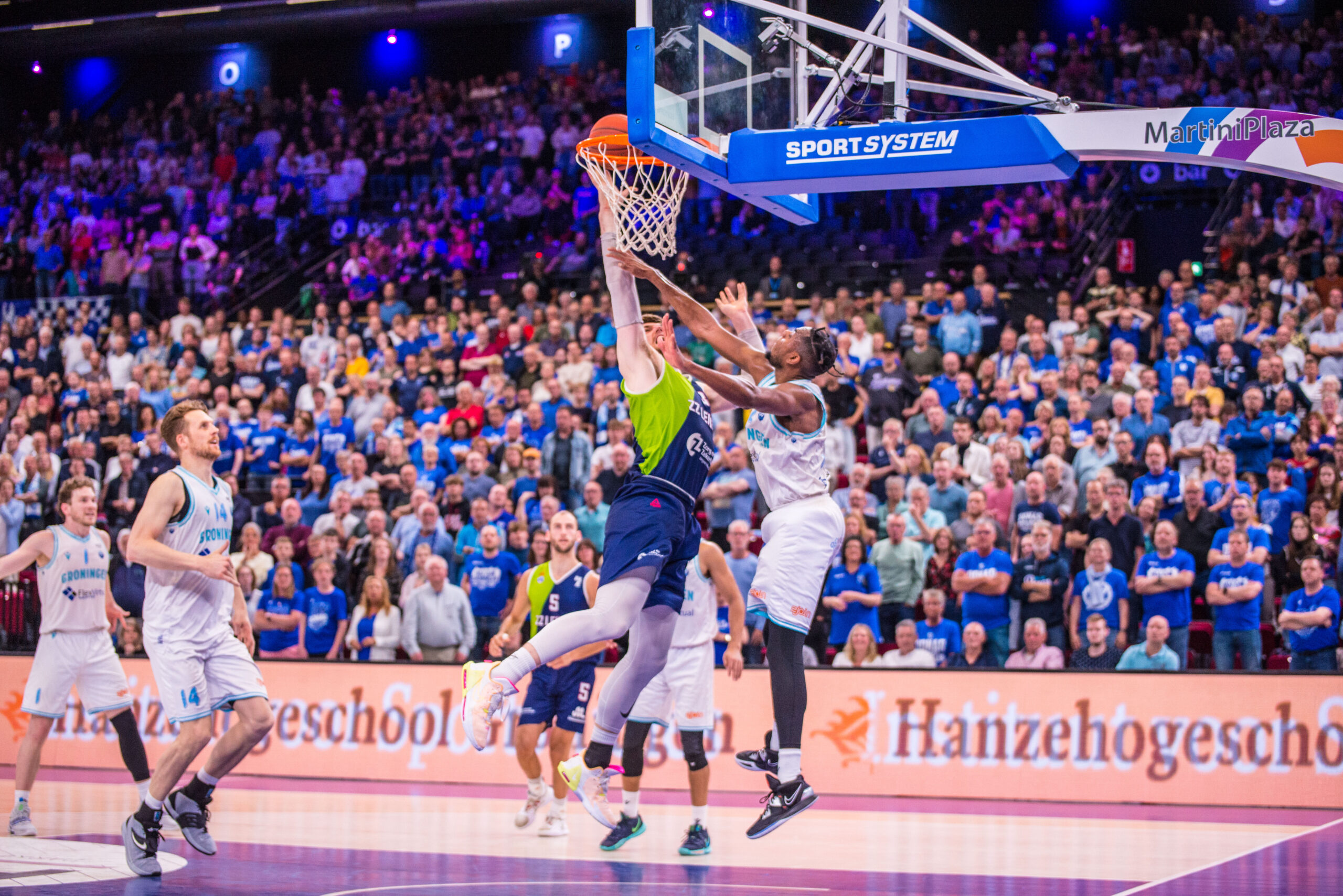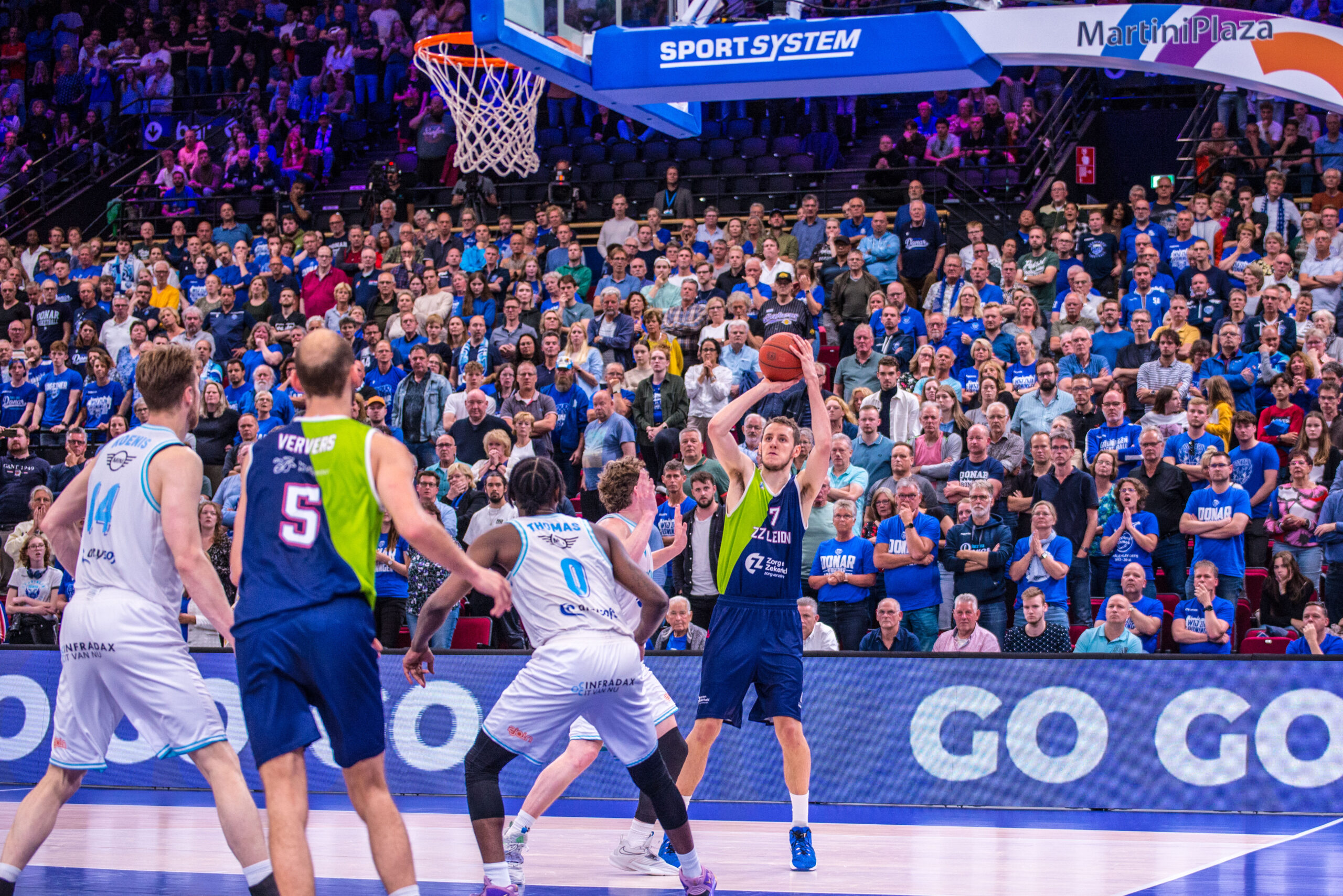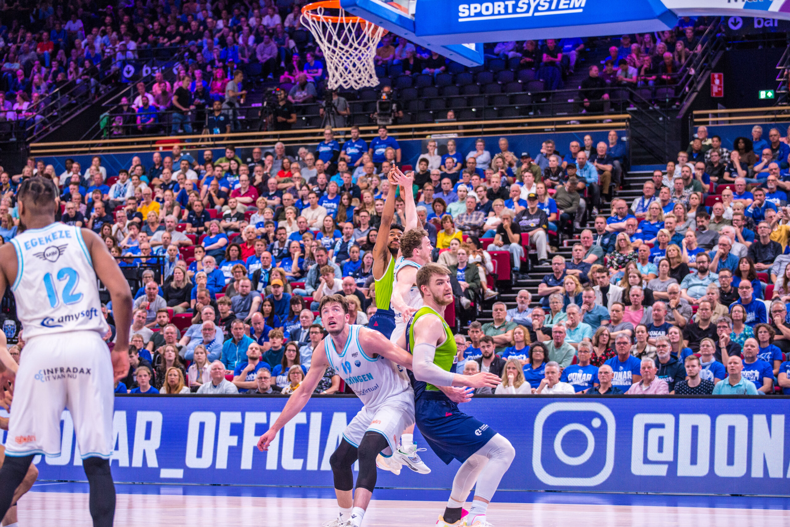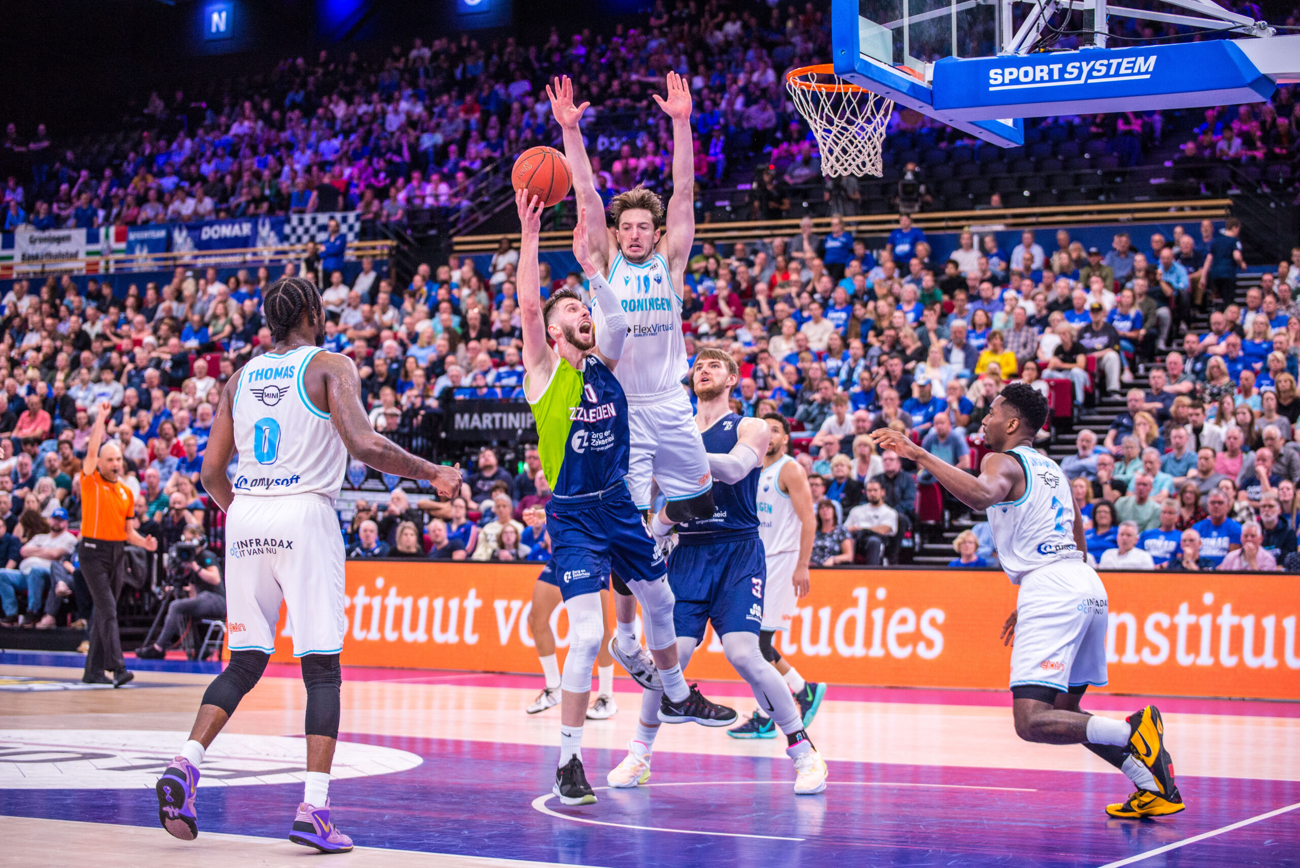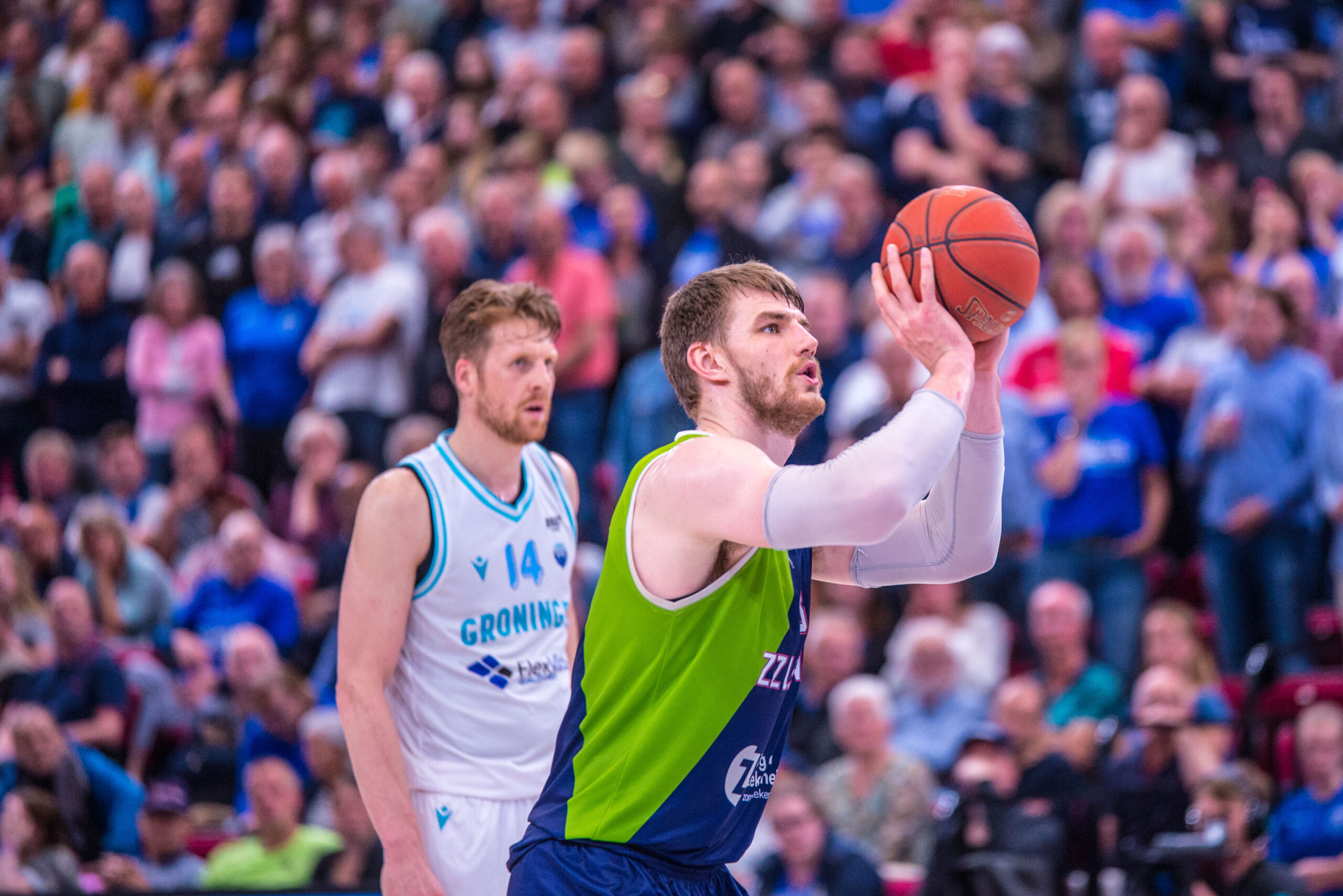 Zorg en Zekerheid Leiden Basketball heeft donderdagavond de eerste wedstrijd uit de finale van de BNXT play-offs tegen Donar uit Groningen met 72-75 gewonnen. De Leidse ploeg kwam voor rust een paar keer 10 punten achter, maar draaide de score in het derde kwart om. Komende zaterdag is de return in de Vijf Meihal en valt de beslissing in de spannende finale van de allereerste BNXT competitie. Die wedstrijd begint om 20.00 uur.