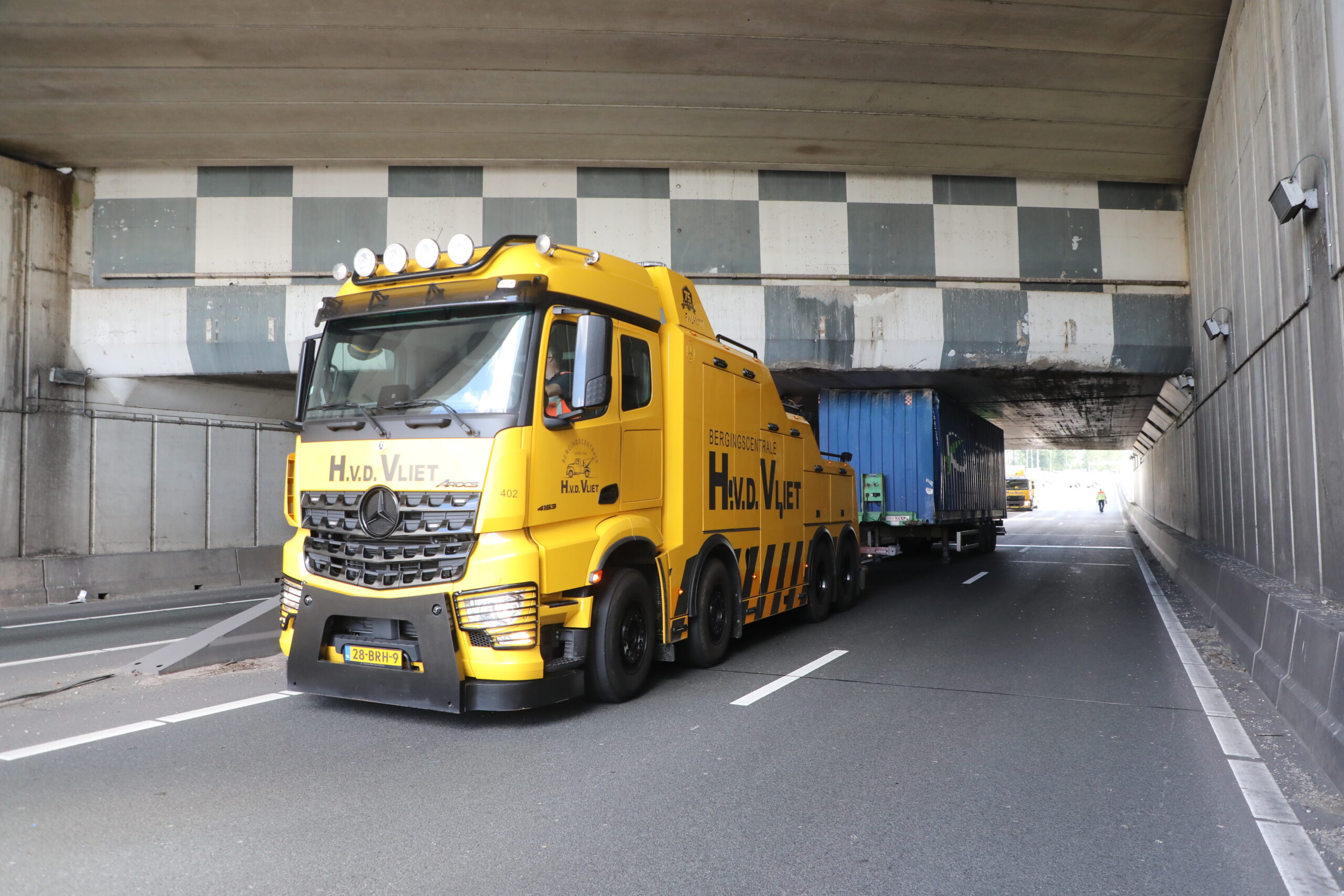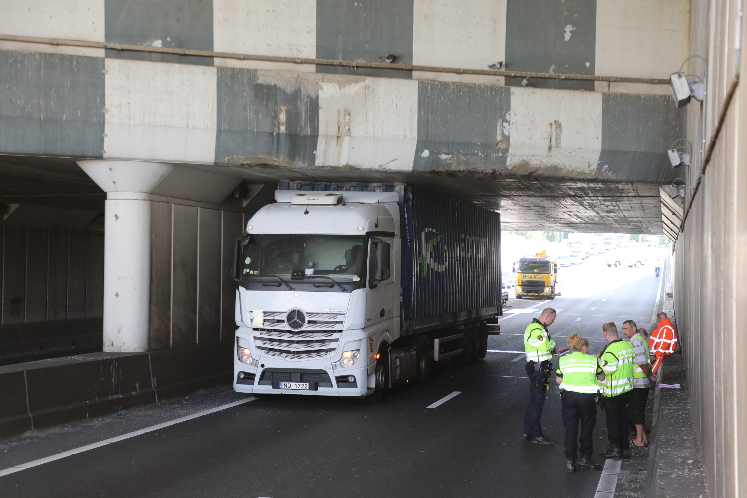 Vanwege het incident zijn twee rijstroken afgesloten. Het verkeer werd via de andere rijstrook geleid met een lange file tot gevolg. Bergingsspecialisten zijn ingeschakeld om de vrachtwagen onder het aquaduct los te krijgen. De trailer met container zou 22 centimeter te hoog te zijn geweest.